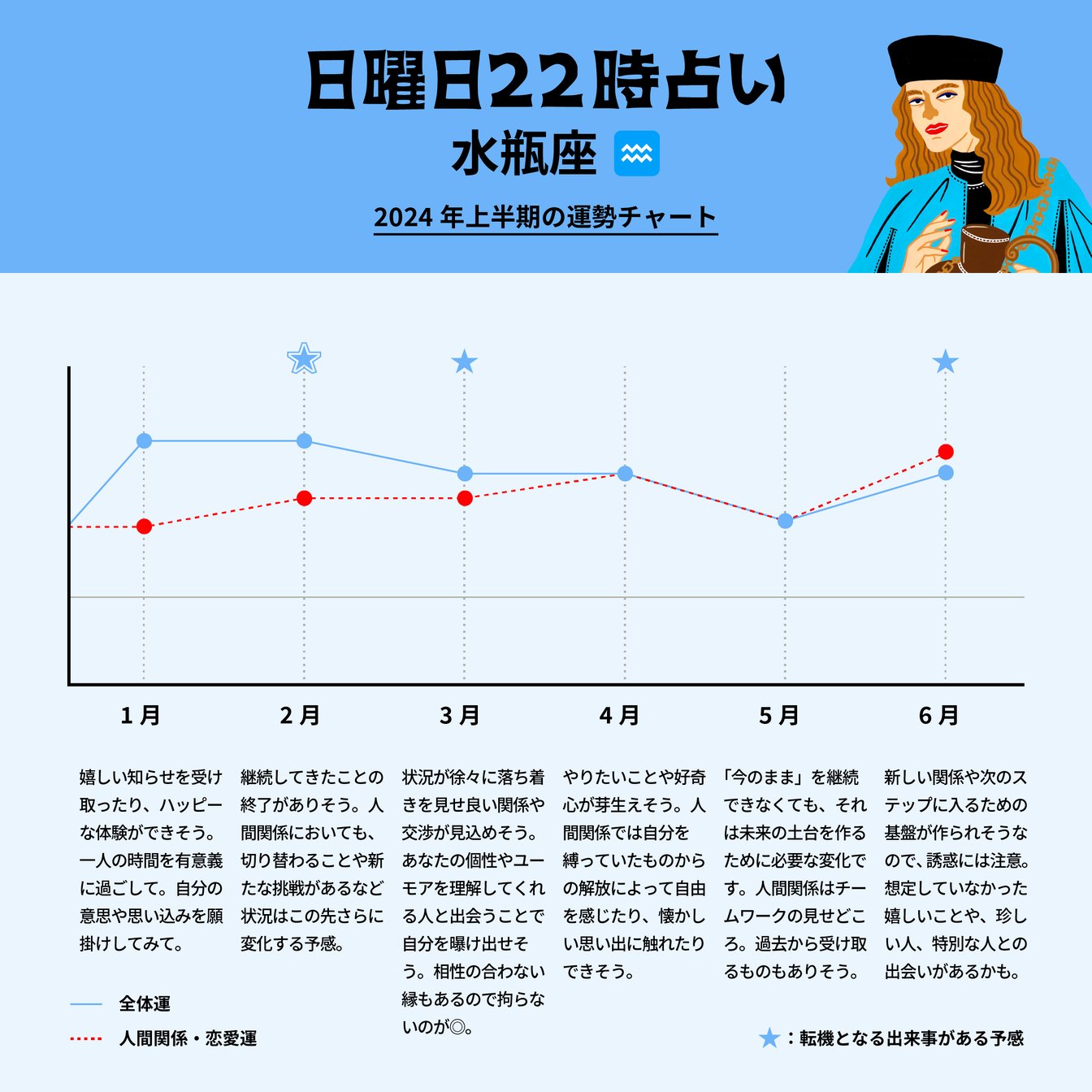 1月は自由なひとり時間や、共同で作り上げる喜びを感じながらオンとオフを楽しく過ごすことができそうです。2月は継続してきた物事の終了や、目標達成に伴う変化、切り替わりがあり、終わりと始まりが訪れる変化の時。頑張りどきは3月で、その姿を見て絆が育まれたり、あなたの魅力をわかってくれる人との出会いに繋がりそうです。4月にはやりたいことや夢が膨らみ、人間関係で自由や解放を味わえるでしょう。5月は協力やチームワークが試される時のようで、新しい状況を作るためのチャレンジもありそう。6月は5月の変化が状況を一新させるのか、運からのハッピーなサプライズがある一方、あなたを惑わす甘い誘惑もある予感なので、ハラハラドキドキした刺激のある状況下で自分の個性が目覚めてしまうかも。