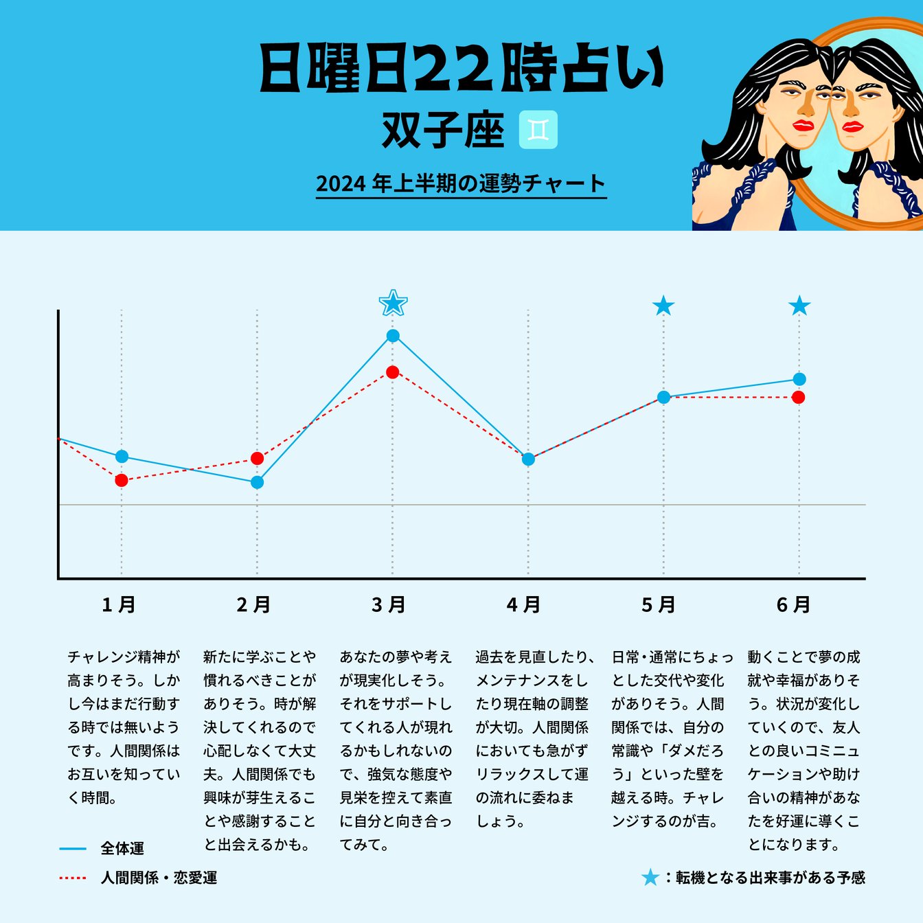 1月は新しいことへの関心が高まり、チャレンジをしたくなる時期ですが、今はまだ時期早々なのでこのまま流れに乗っておくのが良いでしょう。2月は新たに覚えることや調整、慣れること、整えることが重要になります。これらを経て、新しい挑戦や今後を築いていくための始まりが3月に訪れるでしょう。願いが叶ったり、嬉しいことがあったりするかもしれません。4月は頑張りどころ。見落としやケアレスミスに気を配りつつ、焦らず、慌てずに行動して時を味方につけることが肝心です。新年齢へのカウントダウンが始まる5月には、運勢も変化の兆しが見え、切り替わりを感じるかもしれません。それを継いで、6月は実際に動き出す時期になり、状況が変わることで新たな希望や夢の成就など嬉しい展開がありそうです。