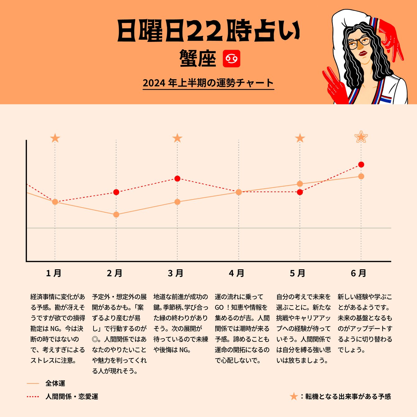 真面目で正統派であり、向上心を持ち合わせている蟹座さんですが、少し怖がりで、安全で平穏を願う気持ちが強い故に考え過ぎてしまうことも多いようです。それは生命を守る野生本能のために必要な感性ですが、過剰になりすぎてしまうと可能性にブレーキをかけてしまったり、悩みに転じてしまったり裏目に出ることもあるので気をつけたいところ。2024年上半期はそんな自分の胸の内で比べて整理をつける内面の会議が増えそうです。賢く考えつつも恐れ過ぎないのが大切で、「自分の運は自分だけのものである」という概念を持っておくといいでしょう。人とは、それぞれ違う個性や能力、運(チャンス)、タイミングがあるからこそ、思い描いた通りにいかないことがあるのです。また、そんな想定外の状況の中で手助けやヒントが得られていくのです。そのため、運がうまくアシストしてくれることを信じて、あなたへと送られたヒントに気付けるように考えすぎには注意してくださいね。