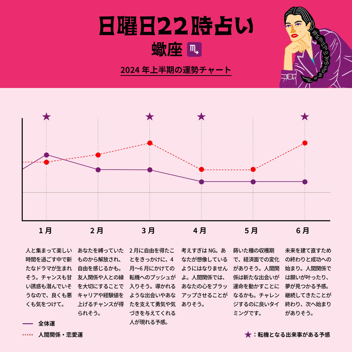1月は集まる機会が多く、楽しい時間を過ごすことができそう。新しいドラマや学びの始まりがあるでしょう。この流れを受けてなのか、2月にはあなたを縛っていたものからの解放が突き進みそう。3月はその勢いを受けた人から順に自分で未来を開拓するための挑戦へと移行していくようです。4月には正義や愛、欲、願望について考えることがありそうで、魂の経験値が上がる予感。5月には金銭面に変化が生じ、新たな人間関係の始まりもあるでしょう。6月はこれまで継続してきた物事の終わりや切替えのタイミングが訪れるかもしれません。