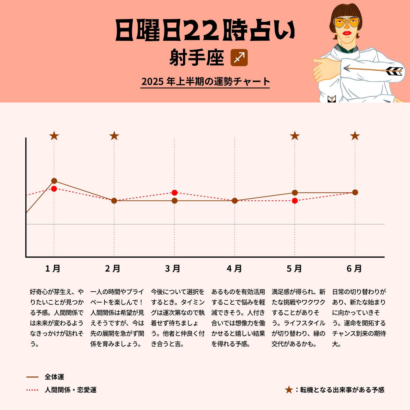 元々、柔軟な感性と秀でた個性、瞬発力を持ち合わせた射手座のあなたですから、2025年上半期も例え思わぬ展開があったとしてもちゃんと運命を切り拓いていくことができるでしょう。自分ではどうすることもできない流れの中で、初めて体験することや出逢い、キッカケがあり、経験値を積むことができる新たなドラマが動き出していくようです。思ったように行かないことがあって遠回りに思えたとしても、実は後から振り返るとトラブルを回避できていたり、運の種蒔きにつながっているかもしれませんよ。だからその時を大切にしていきましょう。人間関係でも、自分らしさや正しいと思う行動ならば怖気付かずに挑戦してくださいね。そんな行動が運を展開させ、想定にはなかった未来を作り出してくれるでしょう。