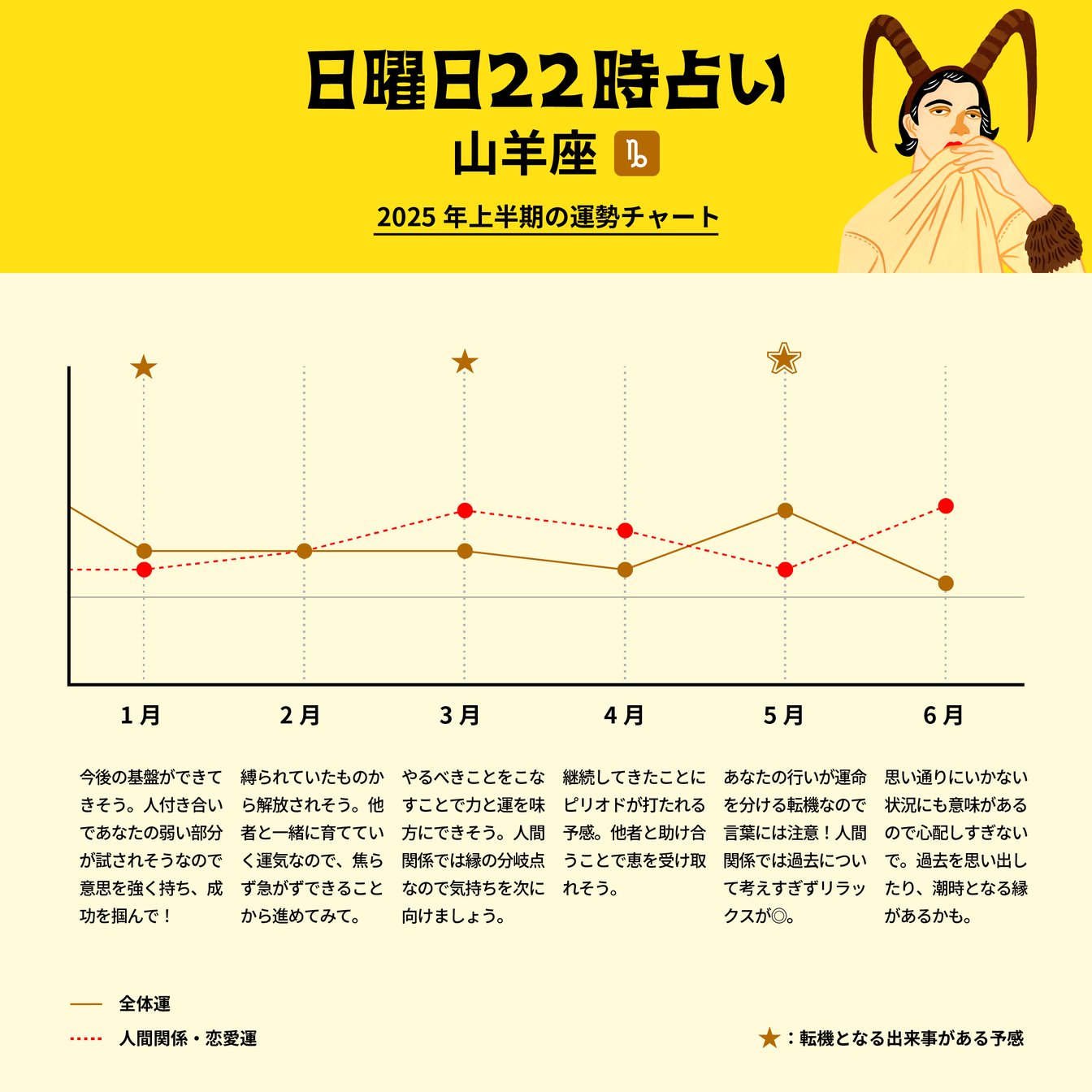 1月は初体験や、環境の変化から得るものがありそう。あなたのスタイルがブラッシュアップされることになりそう。2月にはゆっくり時間をかけて育っていくものが生まれる予感。3月は培った能力を活用してあなた自身に更に磨きをかける機会がありそう。運命も次に向かって動き出しているようで、4月には継続してきたことにピリオドが打たれるでしょう。不安になってもあなたには応援が入るので大丈夫ですよ。5月は運があなたを試そうと抜き打ちテストを仕込んでいるようです。焦らず、慌てず、言葉に注意して乗り越えてくださいね。6月は運がタイミングの調整を図りそう。表面的には何も無いように見えても、水面下でこれから始まるドラマが動いているようです。