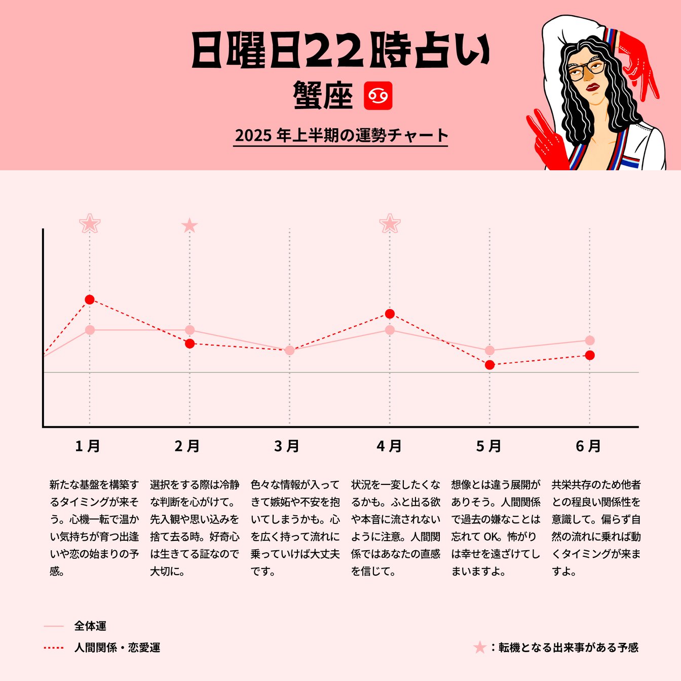 2025年上半期は、普段から真面目な蟹座のあなたにあえて冒険をさせようと、運から度々抜き打ちテストになることがやってきそうです。あなたの選択次第でこの先の行方が切り替わるような運気なので、損得勘定や私利私欲で判断したり、弱さや下心が擽られる物事には注意していきましょう。そうした経験が分岐点となり、新しい展開につながっていくイメージです。全て悪い結果や黒歴史になるというわけではありませんが、あなたの人間力や経験値となっていくことになりそうです。心配しなくても大丈夫ですよ。