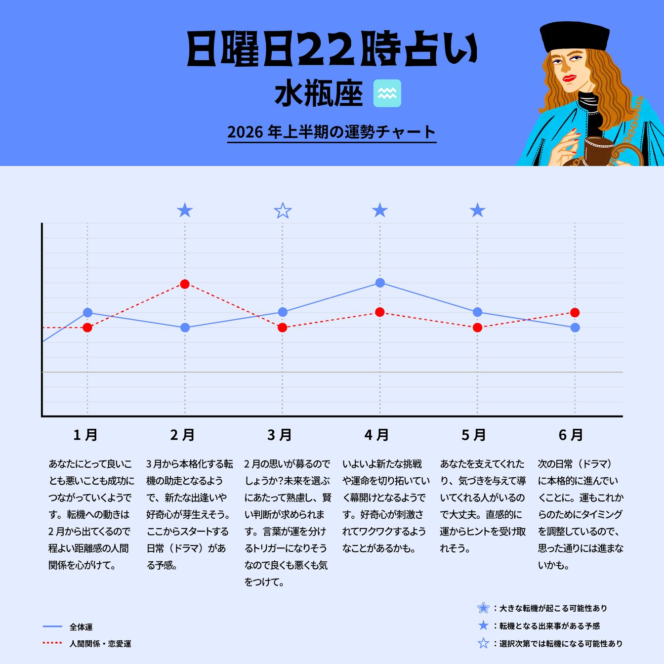 1月はあなたが成功を得るための過程となる時期。深入りしない程よい距離感で人と接するといいでしょう。2月は転機に向けた助走とも言えるような、新たな出会いや好奇心が芽生えるような物事のスタートがありそう。3月は熟慮と賢い判断が求められるようで、「言葉」の力が強くなりそうなので発言には気をつけて。4月はいよいよ新たな挑戦や運命を切り拓いていくスタートの時。好奇心でワクワクするでしょう。5月はあなたを支えたり気づきをくれる人と出会えそう。人生のヒントが直感として届けられるかも!その流れを受け、6月は次のドラマへと歩みを進めていくことになるでしょう。理想通りにいかなくても焦らないでくださいね。