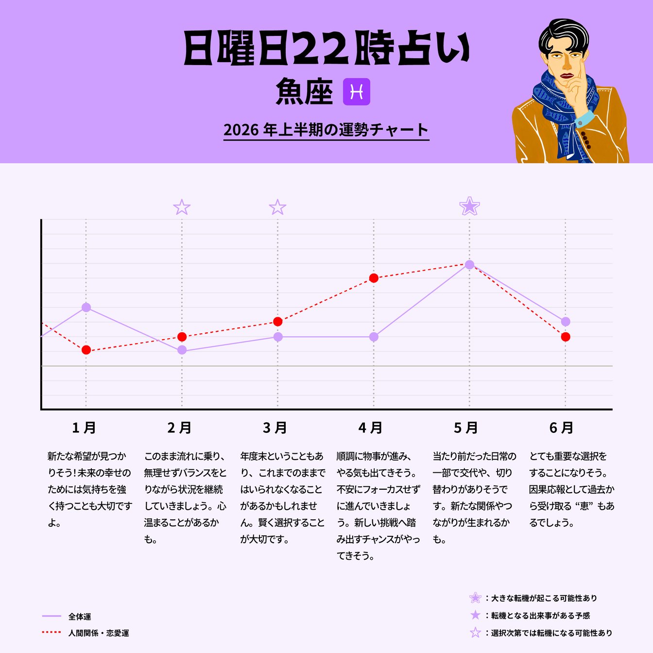 2026年上半期は、魚座さんの繊細さゆえの防衛本能がうまく作用しそうで、いつの間にか流れに乗り、運を開拓することができるでしょう。あなたは少し怖がりな面がありますが、それでいいのです。新しい状況に対して、単なる好奇心で挑戦せず、与えられた状況でメリットとデメリットを計算し、プランを立てて準備をするのと同時に、自分の本音とも掛け合わせて着々とやる気やチャレンジ精神を育てることになるでしょう。その繊細な準備を経て行動する流れが運を掴むタイミングの調整になっているイメージです。自分の意思で今後を選べるようになるでしょう。あなたには、いざとなったら支えてくれる人や親切な人が現れる予定があるので、心配しなくて大丈夫ですよ。