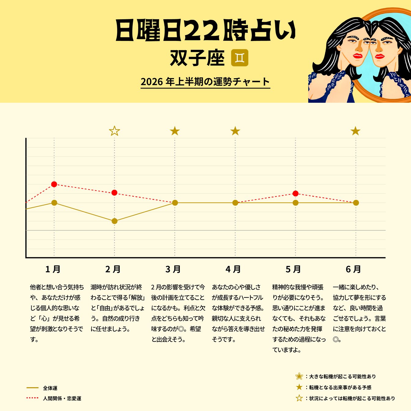 この先、状況や環境、ライフスタイルは変わっていくことになるでしょう。あなたの胸の中にある予定だけでなく、未だ想像にも浮かんできていない未来のプランまで変化を見せていきそうなのです。双子座のあなたは、本能的に運やタイミングを感じ取るのが得意で、あなたのもとにやって来る運に対して自分のフィーリングをたよりに向き合っていくことで、なんだかんだ支えてくれる人が出てきたり、過去の行いから受け取るものがあったりして進むべき未来の基盤を築いていくことができるでしょう。また、3月と6月は言霊が効果を表しそうなので注意。上半期は自分から発する言葉も、誰かから受け取るメッセージにしても言葉に気を配っておくといいでしょう。約束は有言実行すると運の貯金になっていきそうです。
