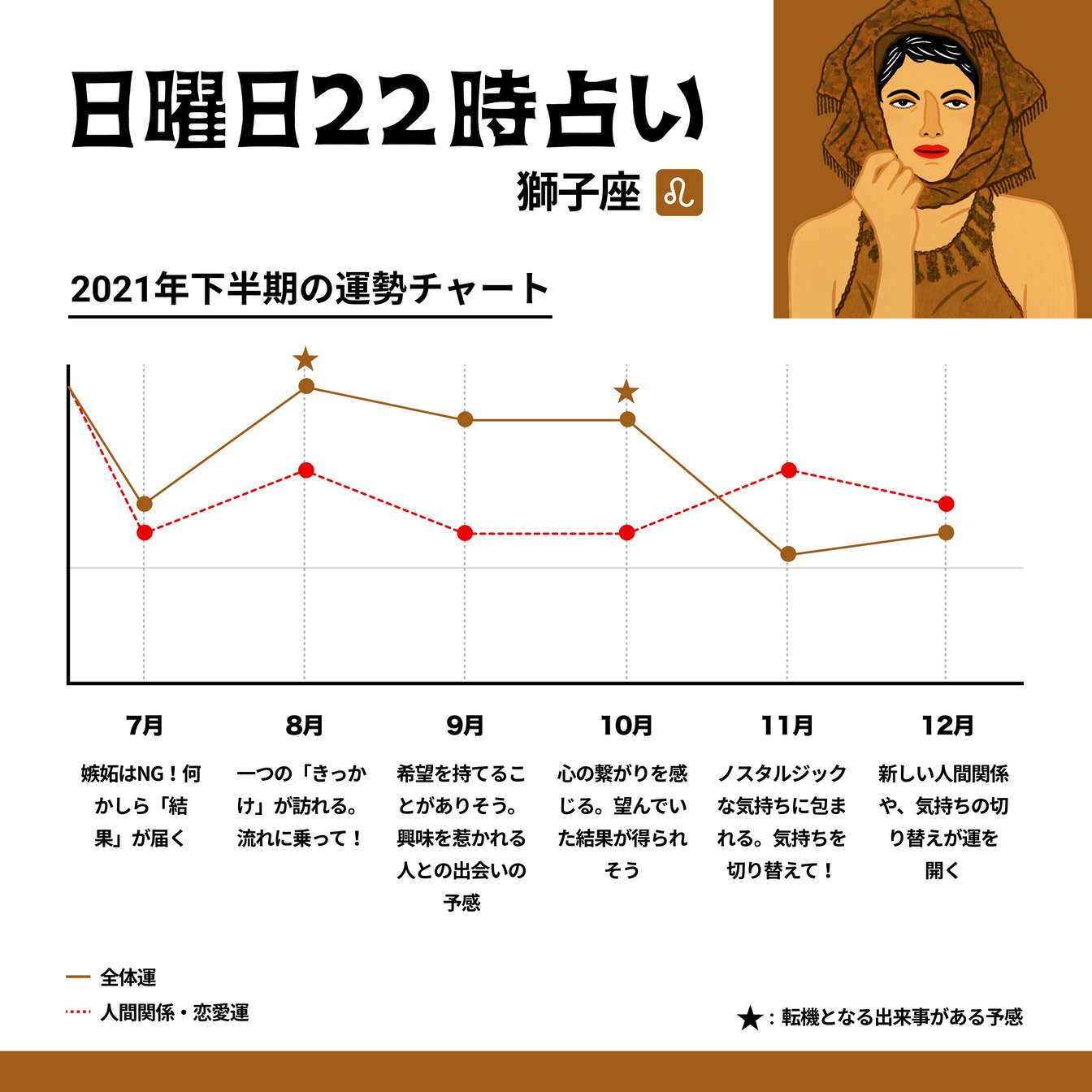 8月は、今後の人生の切り替わりにもなるような「きっかけ」が起こりやすいでしょう。それがあるから、あなたのモチベーションや運は勢いをつけて、9月・10月と好奇心旺盛に進むことができそうです。カリスマ性がある獅子座のあなたが勢いに乗っている様子は、誰しもがある種の憧れを持ちます。しかしここで気をつけてもらいたいのは、周りの人への配慮や気遣いを忘れないこと。特に10月・11月は、ちょっとした気の緩みがそれまで積み上げてきたものを崩しかねないので気をつけましょう。12月には早くも来年の運気の流れとして新しい動きがでてくるでしょう。