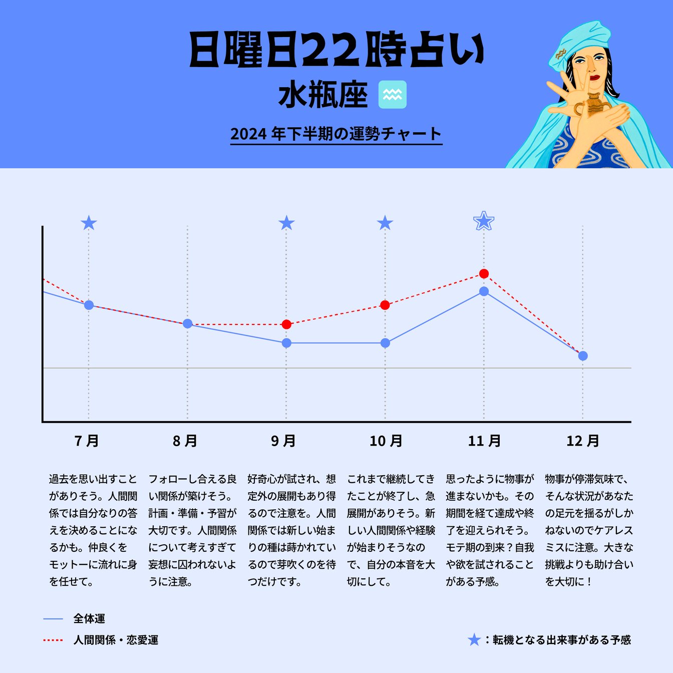 7月は過去を見直し、リベンジのチャンスが訪れそう。切り替わりが生じたり、新たな方向性へと動き出す運命のターニングポイントとなりそうです。8月はそっと支え合うような優しさが育つ時。焦らない、慌てない、怖がらないで大丈夫ですよ。9月には過去から受け取るものがありそう。新たな挑戦が始まる予感。これまで努力してきたものや、継続してきたものの終了は10月に訪れそう。ここでの終了があったからこそ、手に入るもの(環境)がありますよ。11月には学びの環境における終了があるかも。思うように物事が進まないのには意味があるのです。12月は先行きが見えなくなって不安を感じるかもしれませんが、今できる最善策として安全な一歩を見つけていく勇気とやる気、協力的な姿勢が運を作ることになるでしょう。