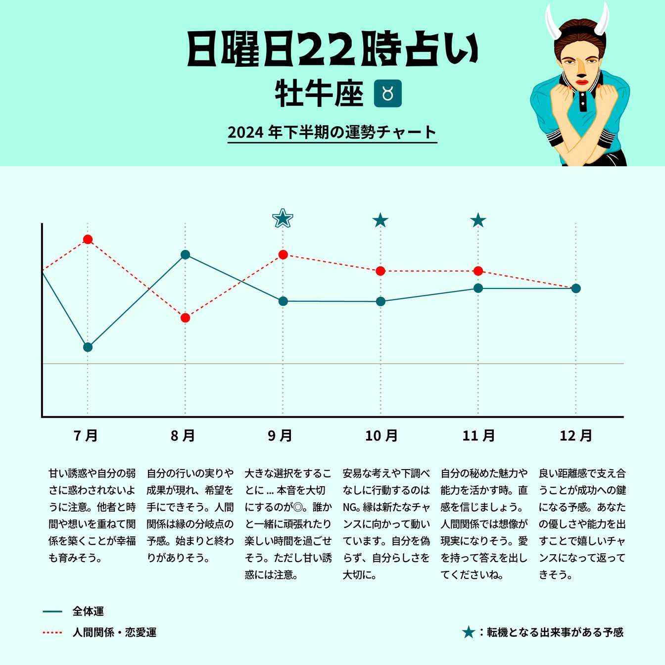 下半期は、人間関係が非常に重要になる時期です。少々シャイな人が多い牡牛座さんですが、誰かと協力し合ったり、「仲良く」を前提とした交流を心がけてくださいね。適度な距離感と信頼(関係を築いた時間や経験)が最終的にあなたにとって有益に働くでしょう。自分の理想やこだわりに縛られるのではなく、運がコーディネートしてくれた縁と流れに任せて判断することも大切ですよ。欲か直感か見極めるのは難しいかもしれませんが、勘が冴えたり導きのようなヒントが現れたりするかもしれないので、柔軟に対応してください。