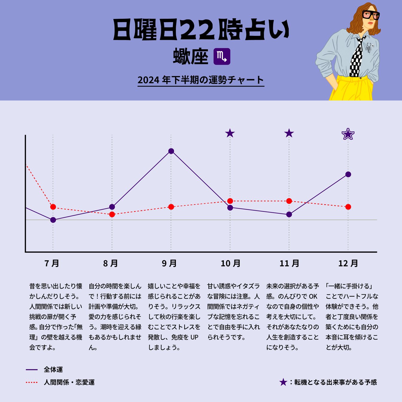 普段はあまり本音を出すことがなく謙虚に振る舞いながらも、いざとなったら情熱的な力を魅せるミステリアスな魅力を放つ蠍座のあなた。2024年下半期はそんなあなたの平常心をくすぐるようなハプニングが度々入ってきそうです。しかし、気になるのは、それが足元を揺るがす甘い誘惑をちらつかせる運からのレッスンなのか、それとも素直になることで成功へのチャンスを手にできるものなのか見分けが難しいこと。例えば、真面目に取り組んでいる途中で変更や中断が入って計画通りにならなかったり、注目していなかったところから話が入ってきたり、または、ライフスタイルが変わるような移動や異動など環境の変化を余儀なくされるのでしょうか。自分1人の意思ではコントロールできない他人の意思やタイミングに翻弄されそうです。そうした欲のジレンマと向き合わされる中で、あなたの本音の奥にある自我がブラッシュアップされ、同時に未来の選択をすることになるでしょう。人間関係も転機に伴い、終了する縁があったり、付き合うメンバーが変わったりしそうです。離れたとしても次へ進むために必要だったということです。自分の魅力や運を信じることが大事ですよ。苦手な人と離れるきっかけも作れそうで、心機一転のチャンスとなりそうです。