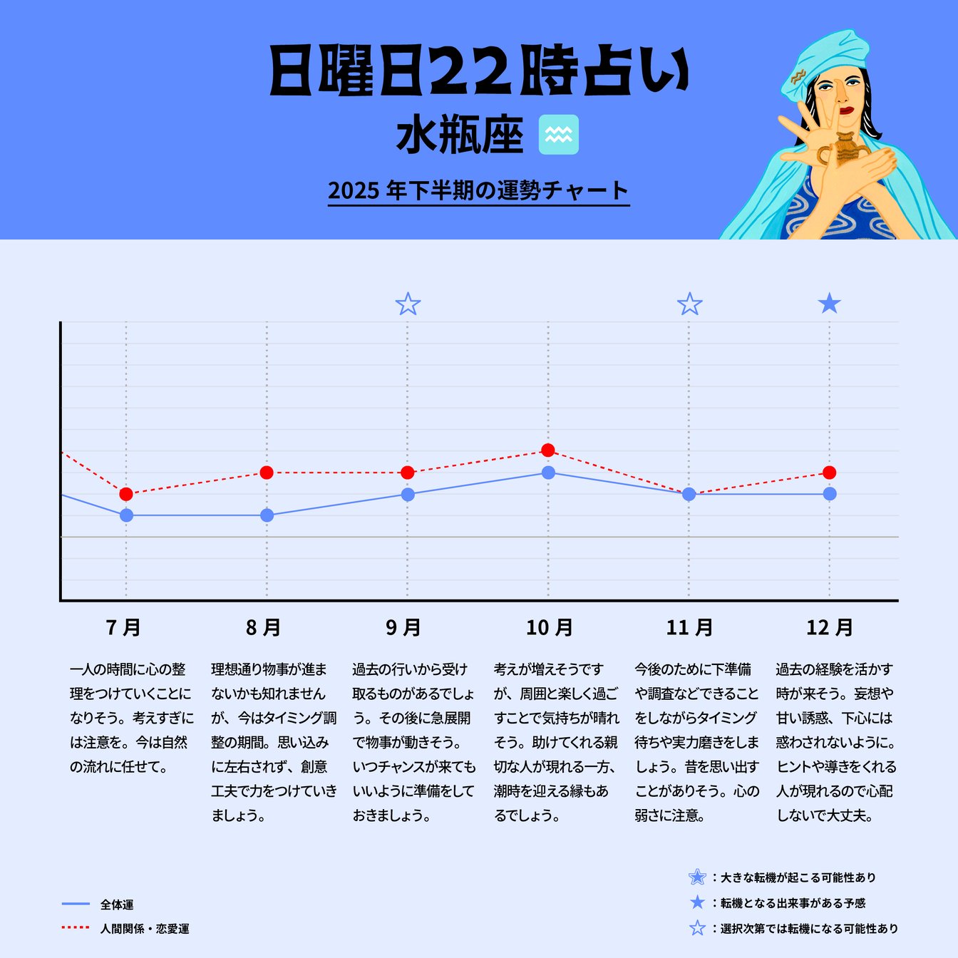時代や社会の動きは常に移り変わっていくものです。大切なのは、その流れに乗りつつ自身もアップデートさせていくこと。ただし、多勢が正しいとも、最前線や最先端が良いとは限りません。そのため、長いものに巻かれたり、他人や過多な情報に翻弄されたりするのではく、時と場合に応じて自分の信念や理念をもとに自分の心を見返して、方向性を定めていく姿勢が大切です。2025年下半期ではそうしたあなたのモノの見方や今後の在り方を見つめ直し、改めて未来を選んでいくことになるでしょう。しかし、良い意味でマイペースで自分に素直な水瓶座のあなたなので、それを気にせずに自然と世の中を渡っていける強さを持っているため、そこまで心配しなくて良さそうですね。