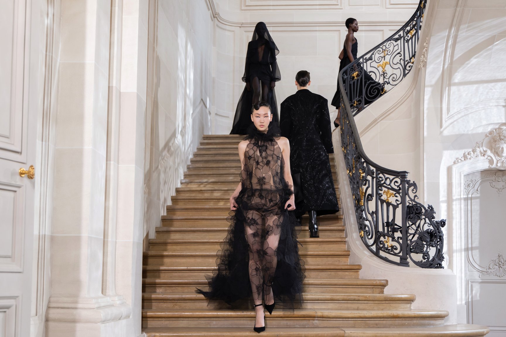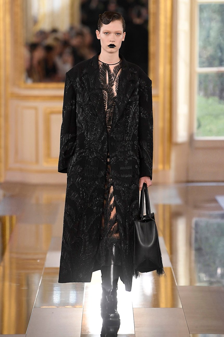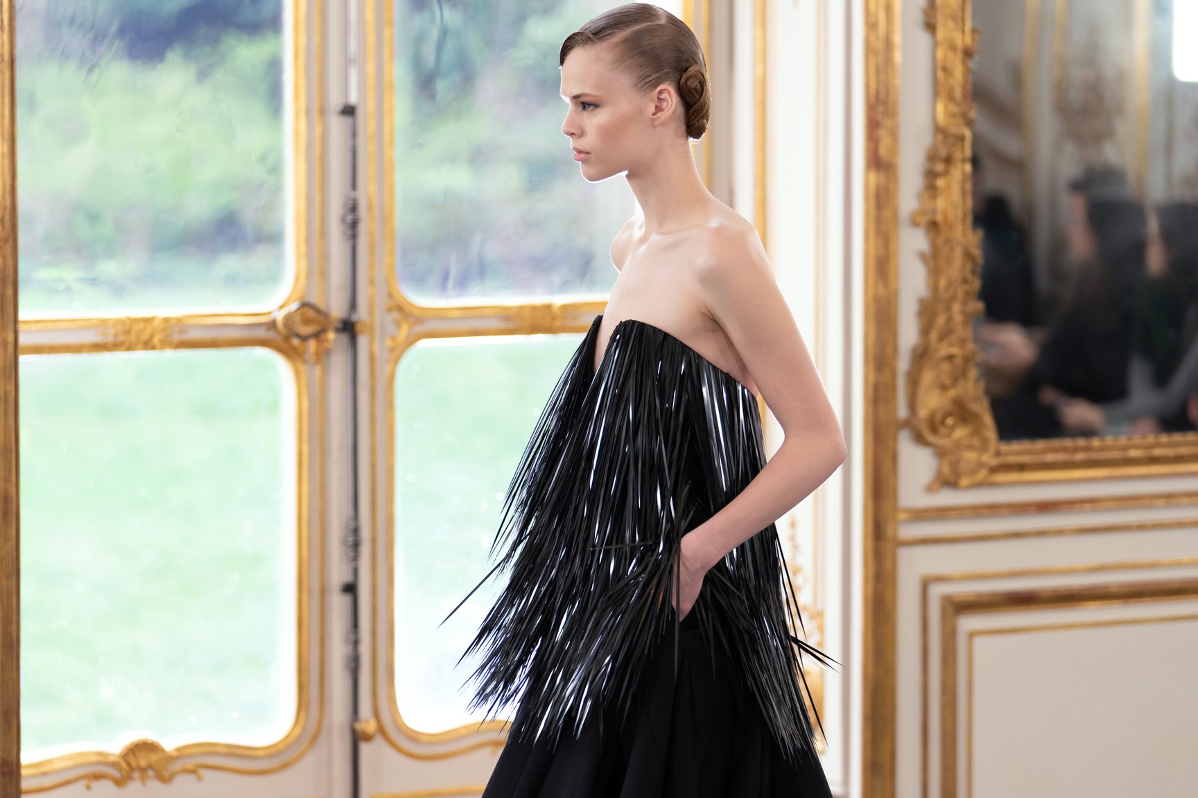 時には同じ技法が異なる生地に施され、それぞれのアイテムが他のアイテムを引き立てるように注意深くスタイリングされる。一色だけの万華鏡のように、黒という色彩の多面性をエレガントに映し出すとともに、「ヴァレンティノ」のデザインコードを再考し、研ぎ澄ませてみせた。