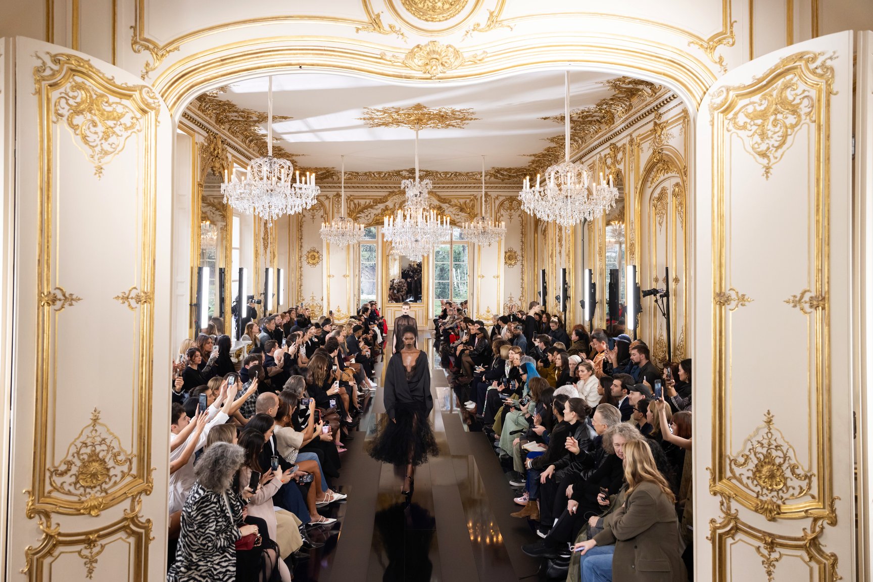 今回のショー会場は、カール・ラガーフェルドの旧邸でもある「Hôtel de Maisons」。豪華絢爛な装飾が施されたサロンは部屋ごとにゴールド、ブルー、レッドなどさまざまな色で彩られ、黒い服を着たモデルたちとの色のコントラストを作り出していた。