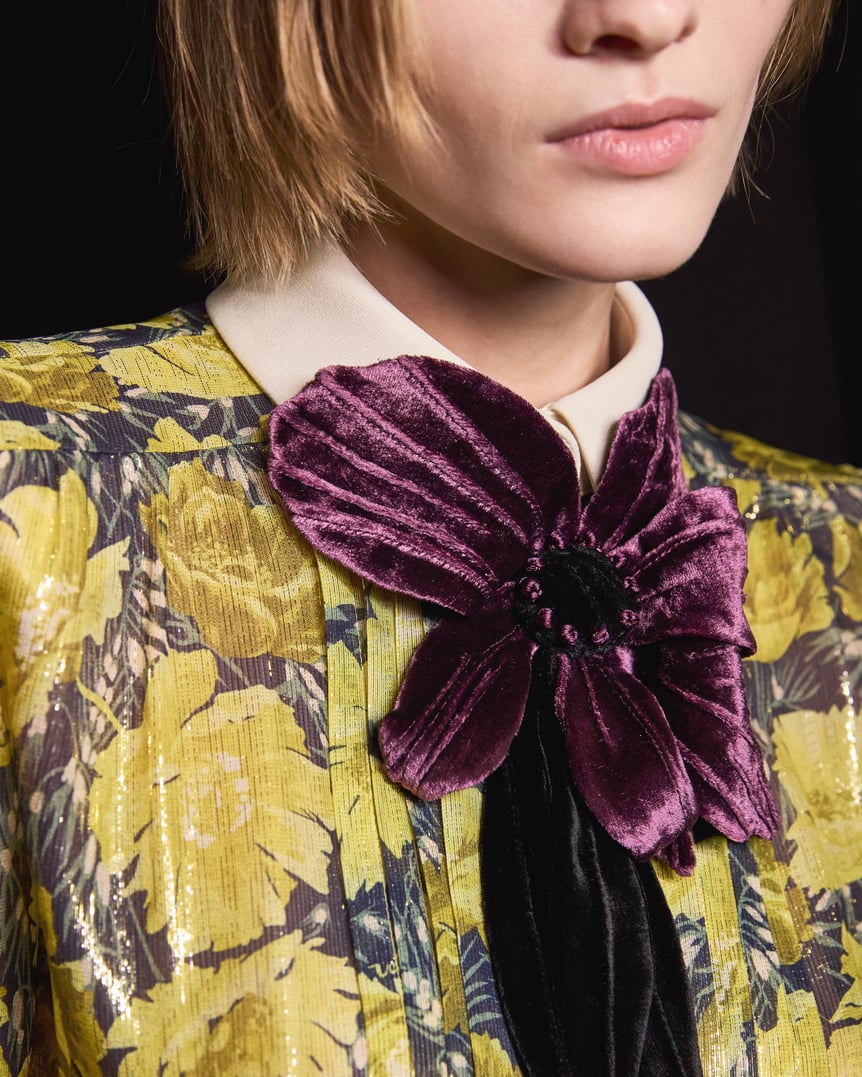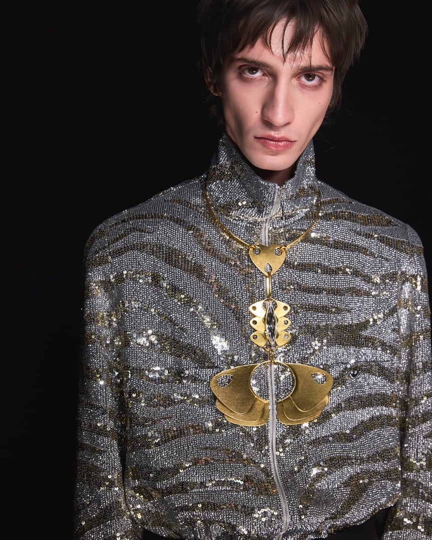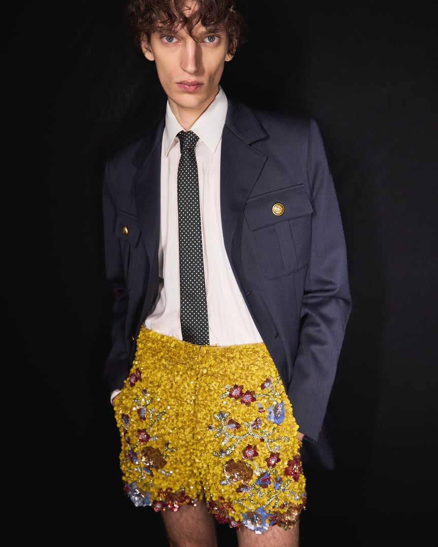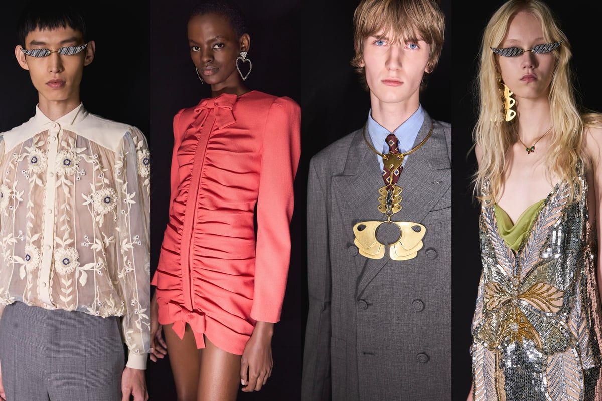随所に鮮やかなカラーパレットが用いられ、ポルカドットやアニマルパターン、フラワーモチーフがアクセントに。また、艶やかなシルクやベルベット、シークインといった輝きをまとったスタイルは、今シーズンのテーマである「ファイアーフライズ(Fireflies)」を象徴している。