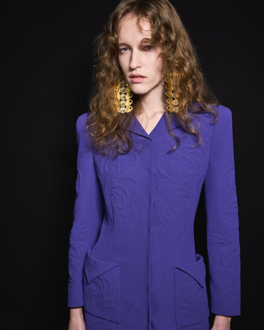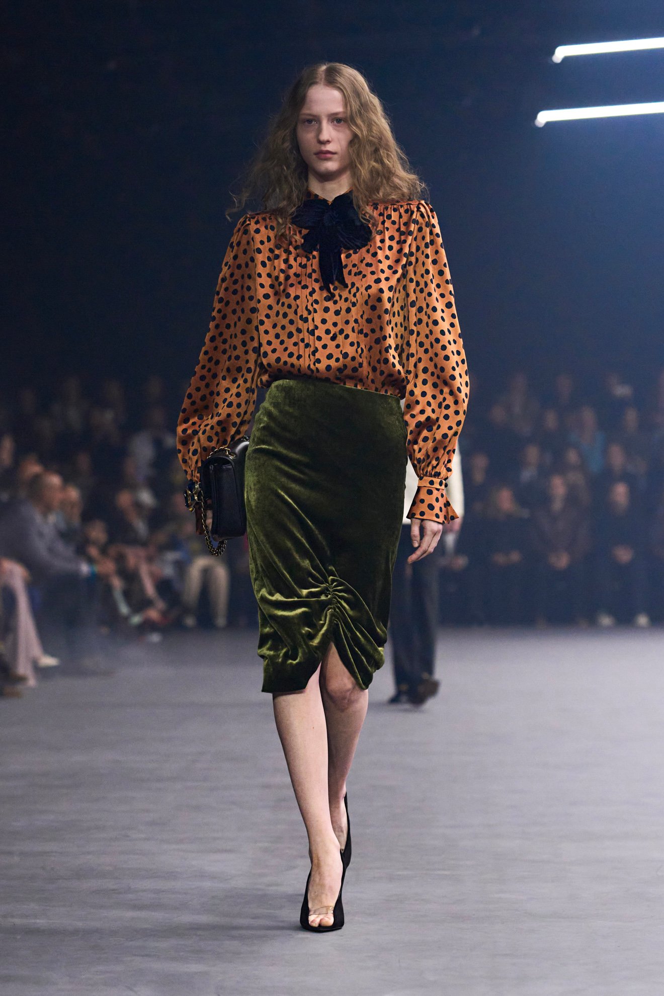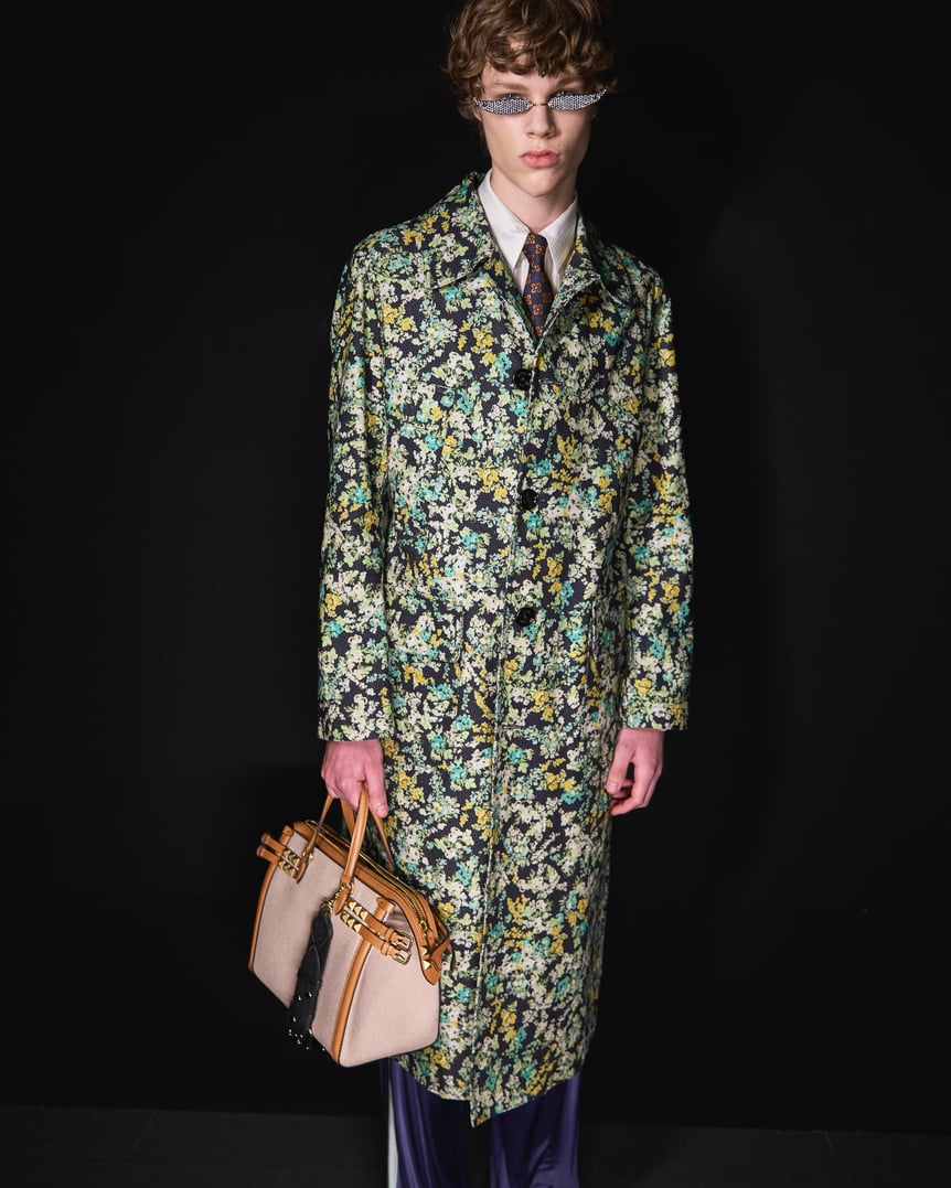 随所に鮮やかなカラーパレットが用いられ、ポルカドットやアニマルパターン、フラワーモチーフがアクセントに。また、艶やかなシルクやベルベット、シークインといった輝きをまとったスタイルは、今シーズンのテーマである「ファイアーフライズ(Fireflies)」を象徴している。