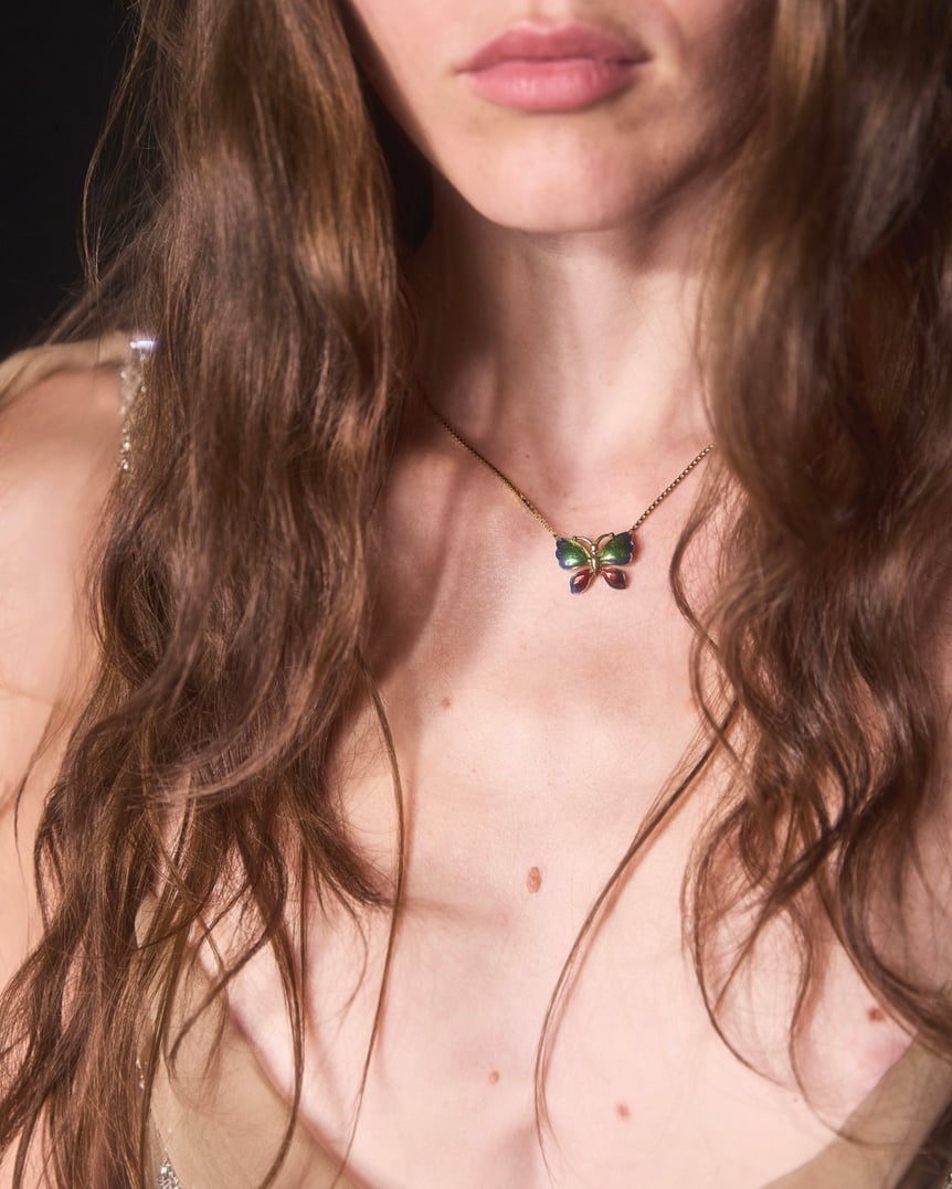 コレクション全体のピュアな表現は、洗いざらしのように無造作なモデルのヘアスタイルにも現れていた。一方で、蝶のブローチやネックレス、ホログラムのように光を反射するアイウェア、そしてアンティーク調のバッグといったアクセサリーには、控えめながらも個性が宿る。