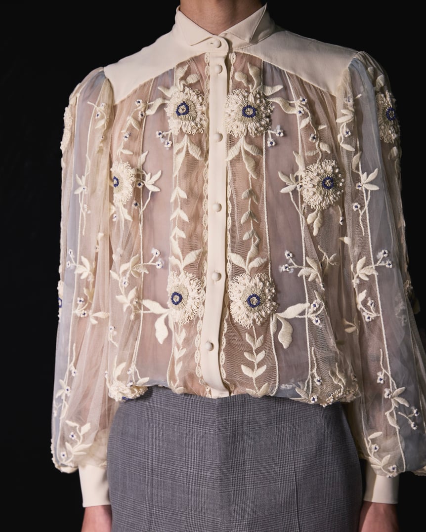 ベースとなったのは、ヴァレンティノの王道スタイル。構築的なスーチング、フェミニンなブラウスとタイトなスカート、レースやドレープ使いが際立つドレスなどがコレクションのメインを占める。シルエットはミニマルだが、繊細な刺繍やクチュールの技術がふんだんに用いられている。