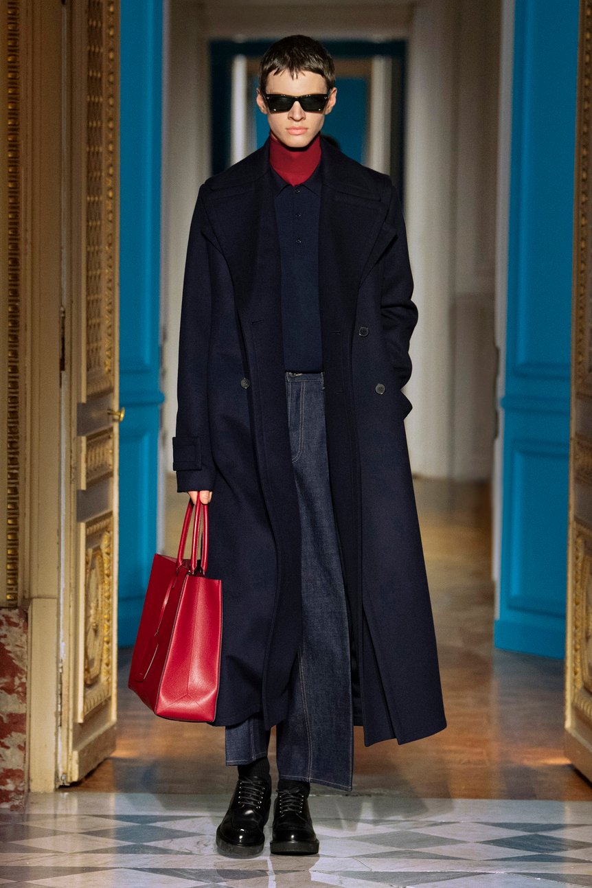 だが、"ヴァレンティノ・ブルー"とでも言うべきスカイブルーを多用することはなく、取り入れられたのは全50ルック中でわずか9ルックのみ。その多くもバッグやインナーというアクセント的な忍ばせ方だからこそ、ラストルックのステンカラーコートが印象に残る。