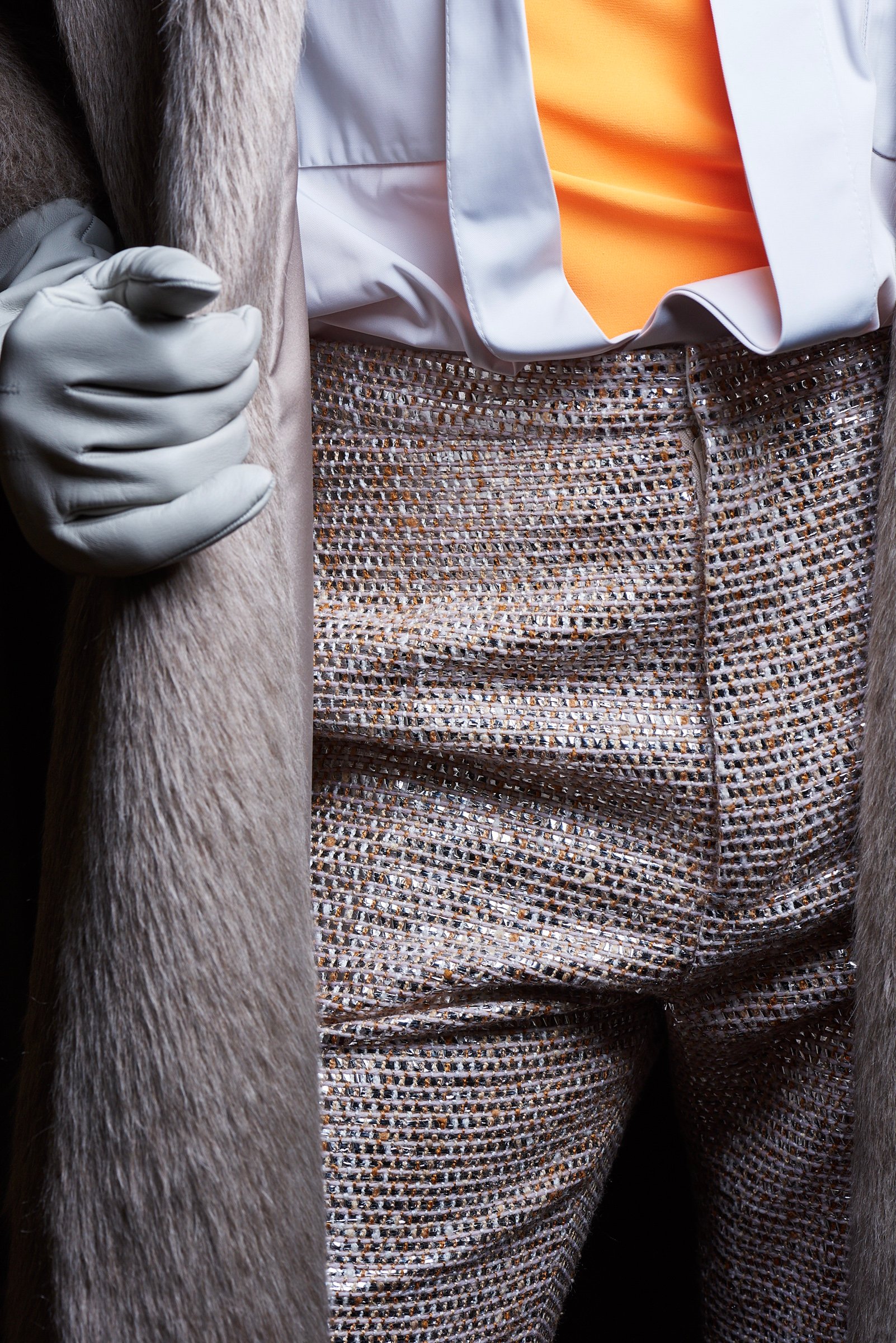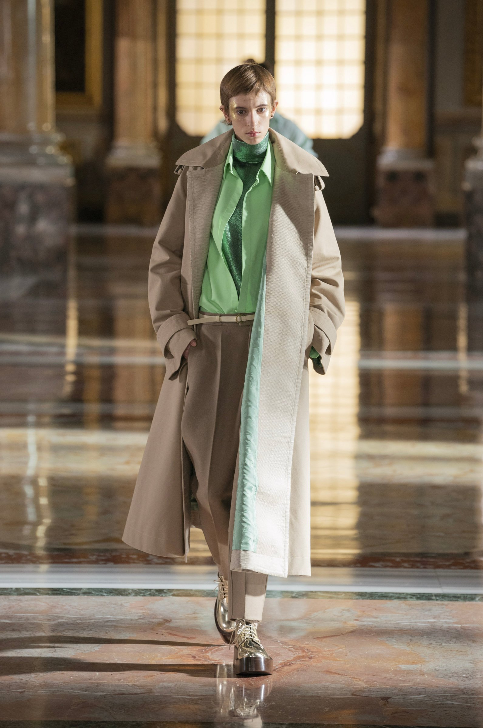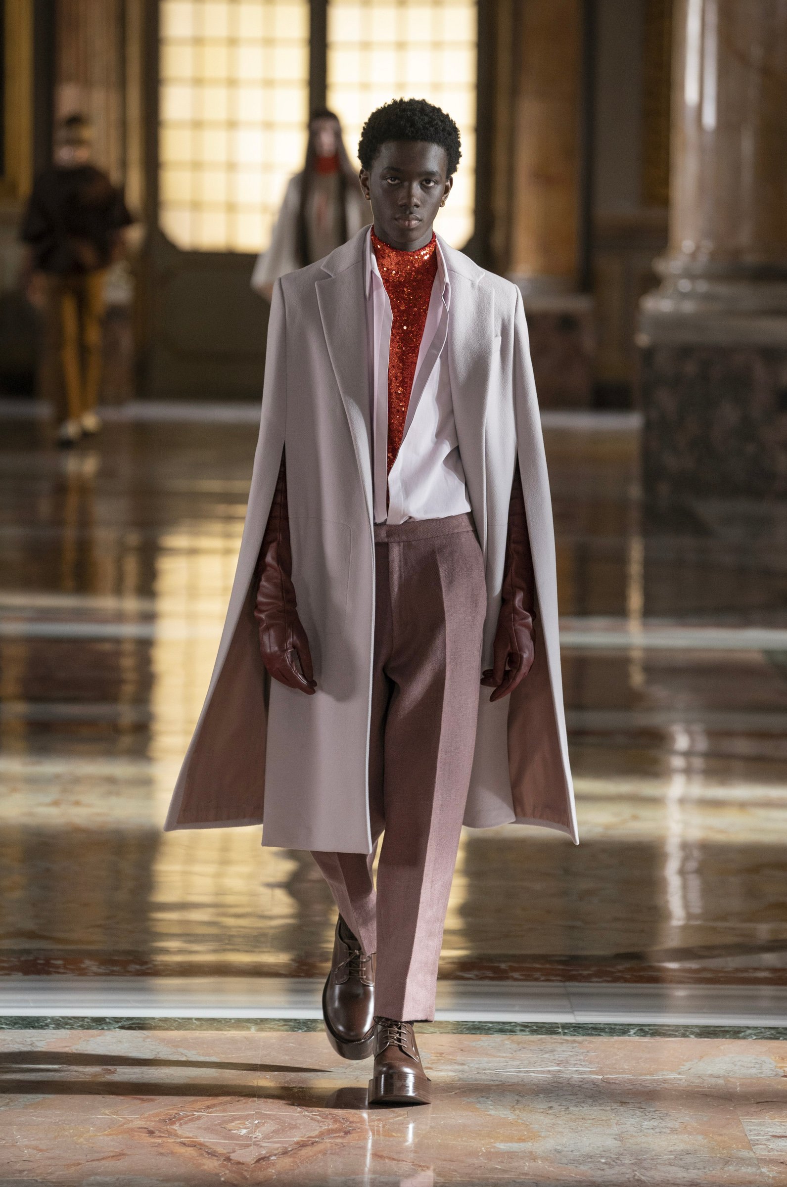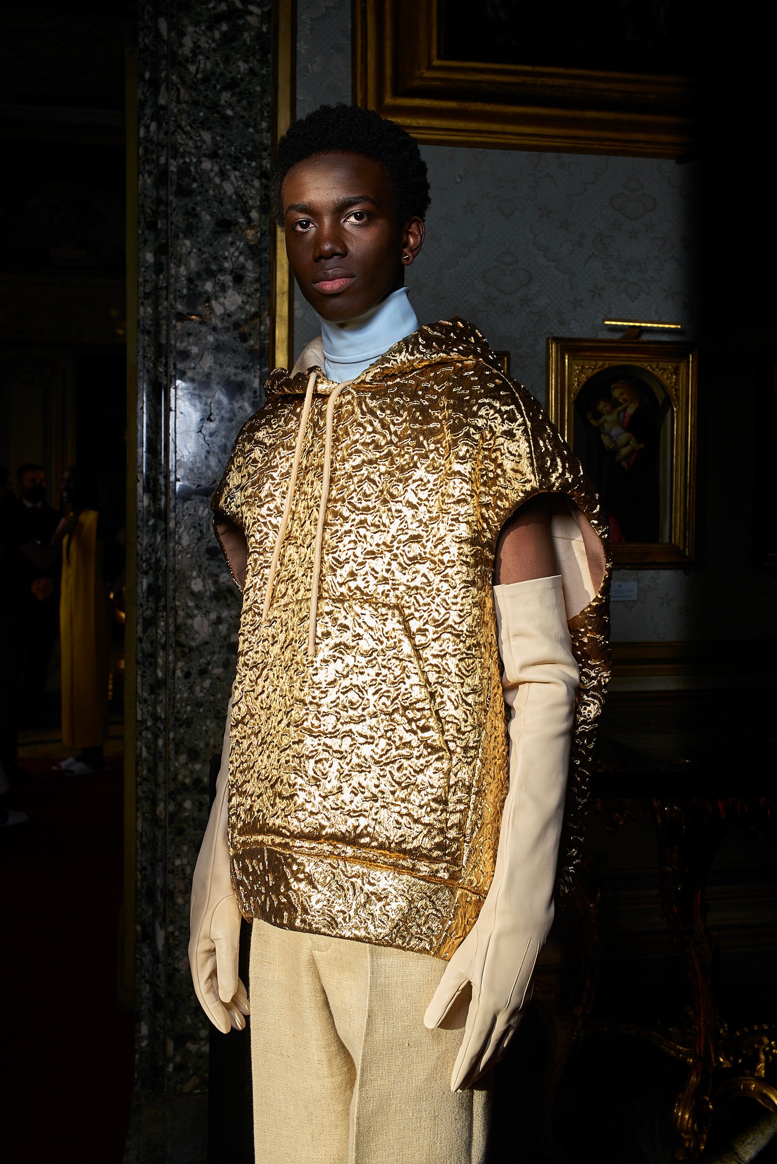 ショーはローマに位置するコロンナ美術館、サラ・グランデ(Sala Grande)にて開催。「CODE TEMPORAL」と題されたショーフィルムは約18分。左右の壁に絵画やシャンデリア、彫刻などが装飾されたサロンの中をモデルたちが闊歩する。男性モデルも混じり、クチュールコレクションでメンズがフィーチャーされるのは今回がブランド初となった。