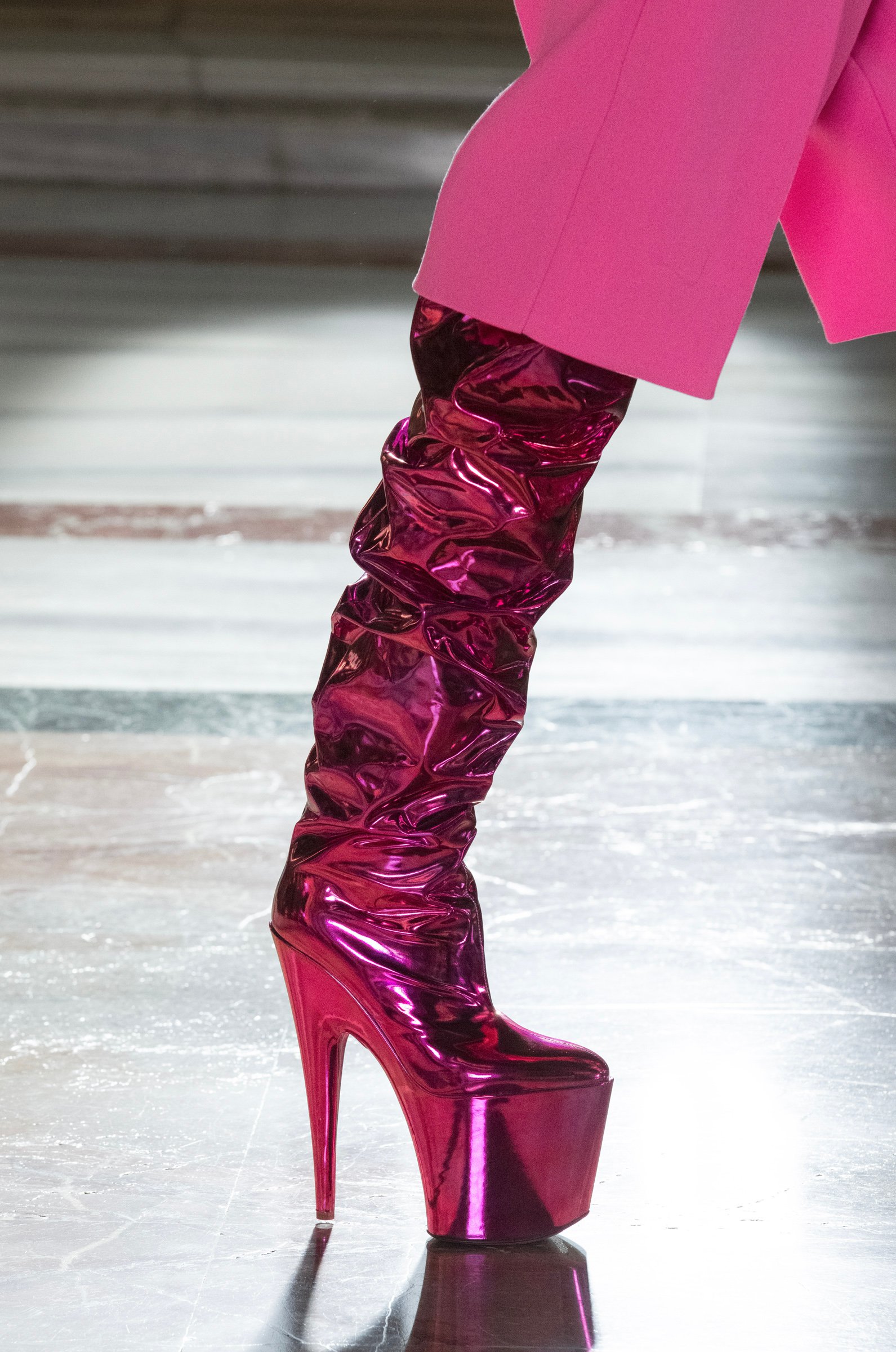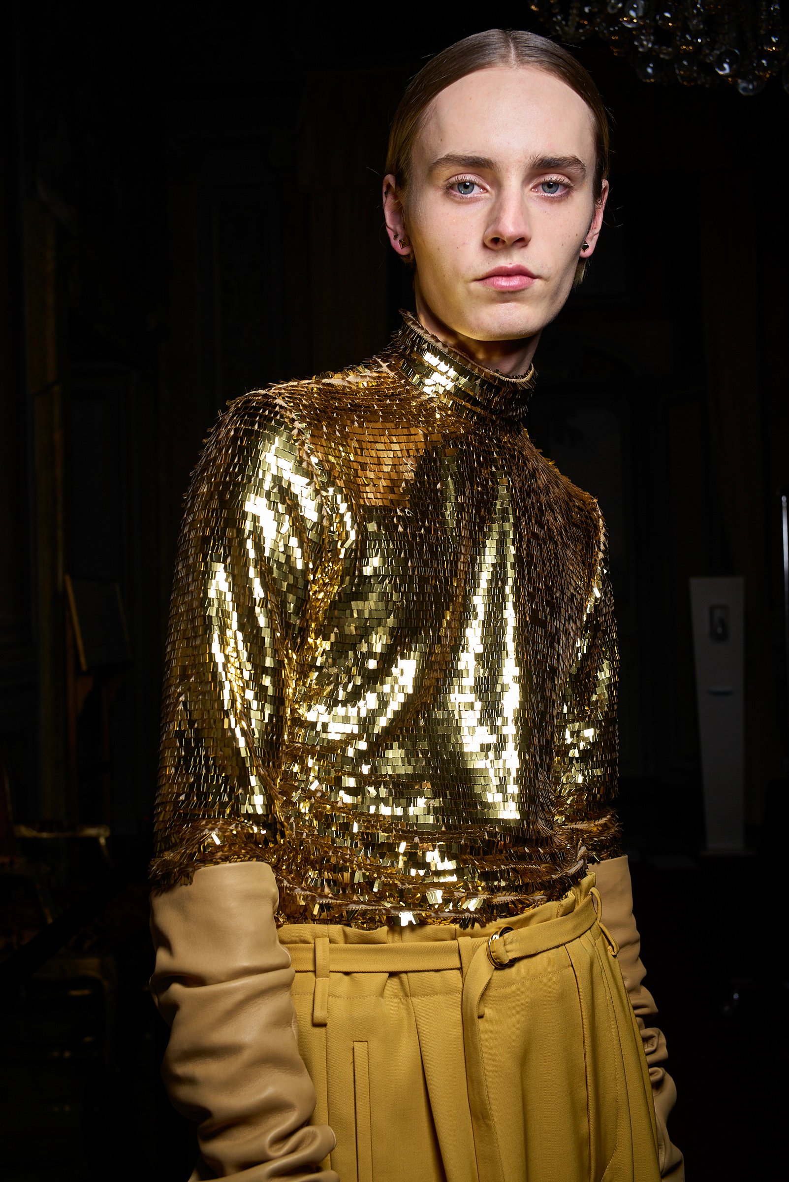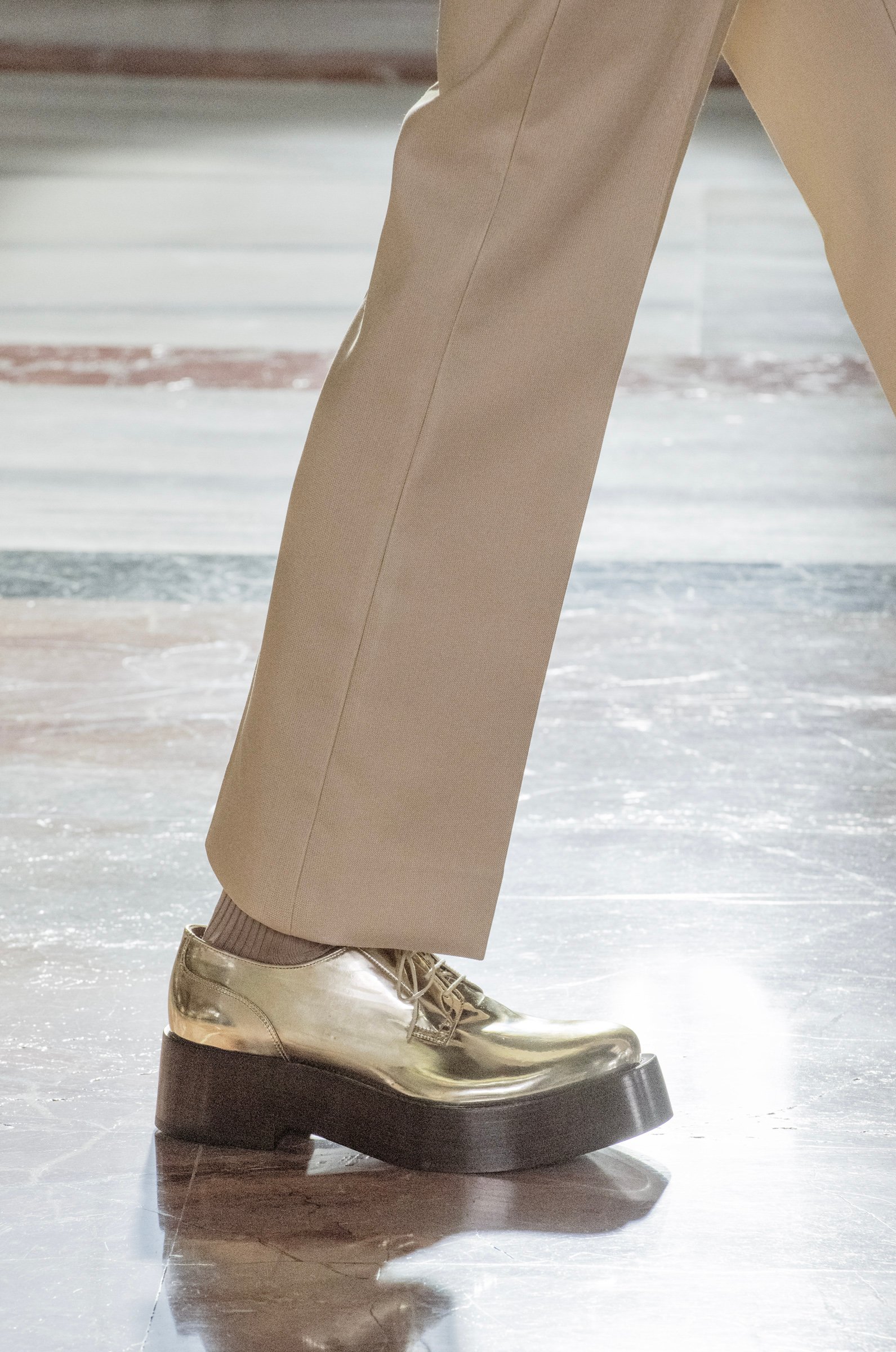 特にアイコニックだったのが、仮面のようなゴールドのフェイスメイクアップと、驚くほどの高さのハイヒール。全体的に縦のラインが強調されたシャープなシルエットと、ニュートラルカラーにレイヤードされたピンクやグリーンなどのブライトカラーが印象的だ。