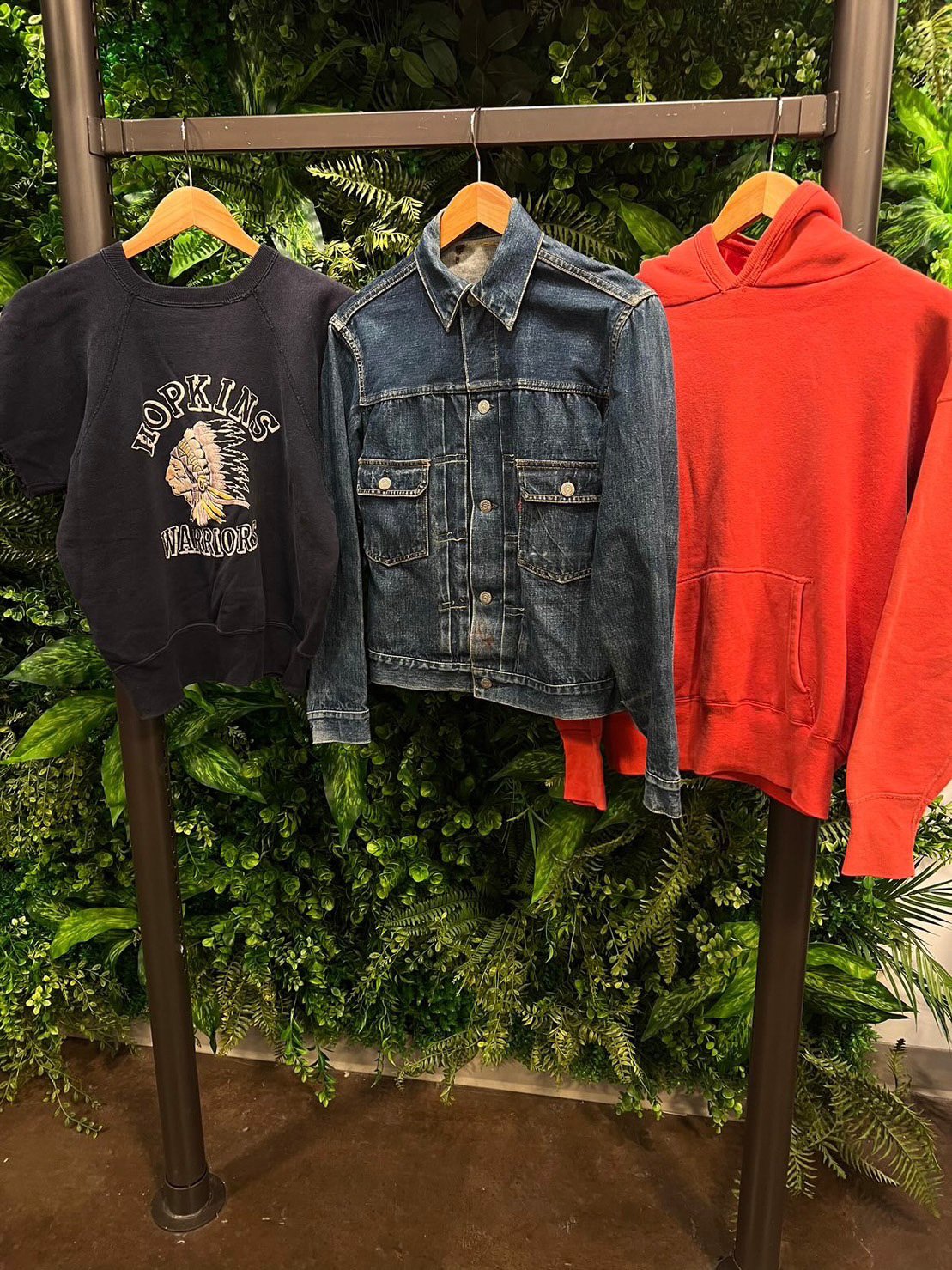 Vintage 1960s Flock Print Hopkins Warriors Sweatshirt、Vintage 1950s Levi’s 507xx “Type 2” Denim Jacket、3Vintage 1950s Double Face Hoodie