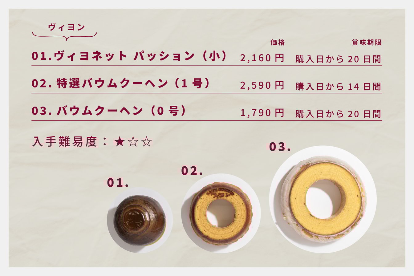 ヴィヨンのバウムクーヘンは、桜新町と二子玉川の店舗に加え、公式オンラインストアでも購入できるので、入手難易度は「★☆☆」。今回紹介したものは、いずれも包丁を用意する必要がありますが、カットされたミニサイズの詰め合わせも販売しているので、目的に合わせて購入することができます。また、店頭では、バウムクーヘンの他にケーキなどの生菓子も用意しています。