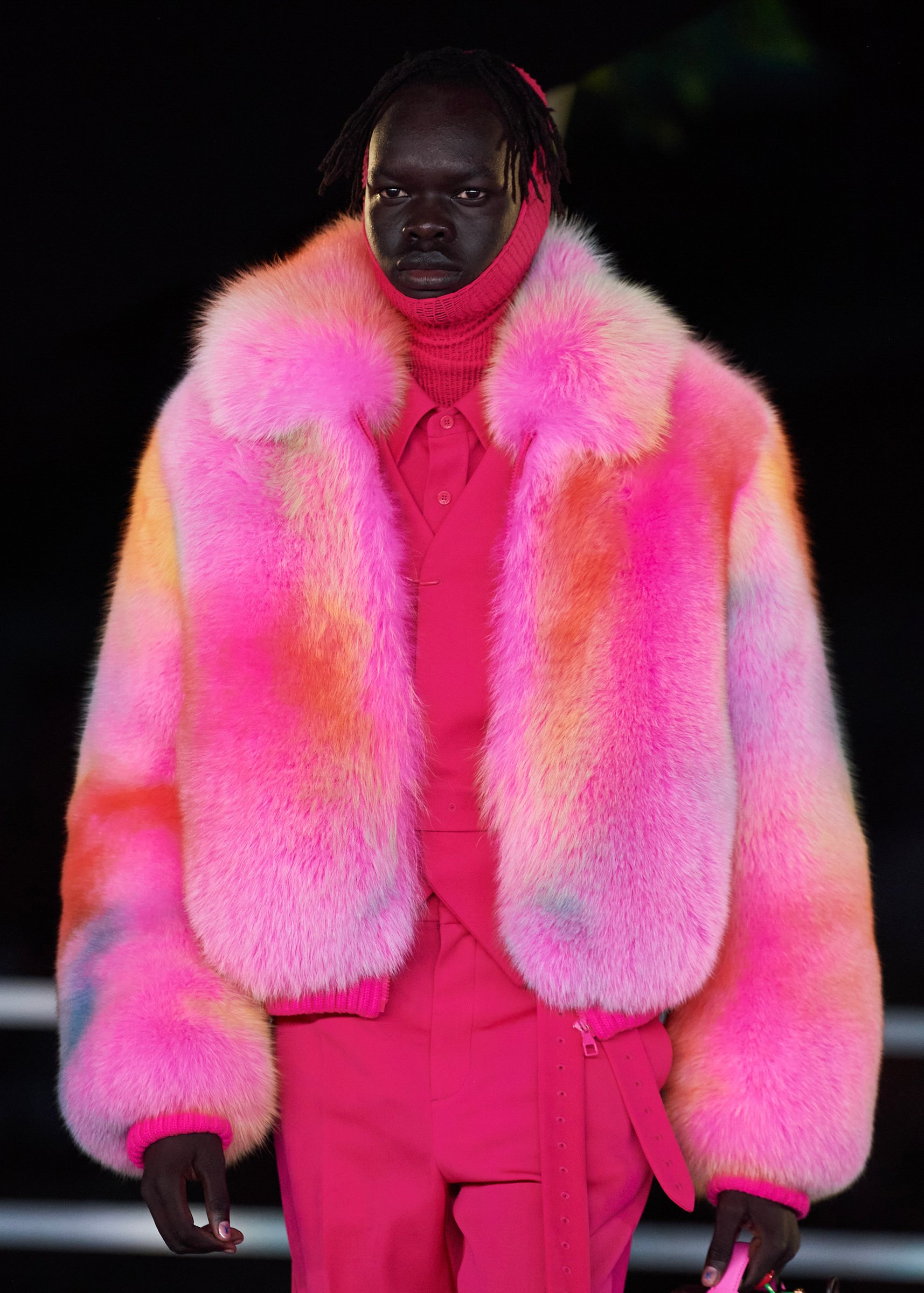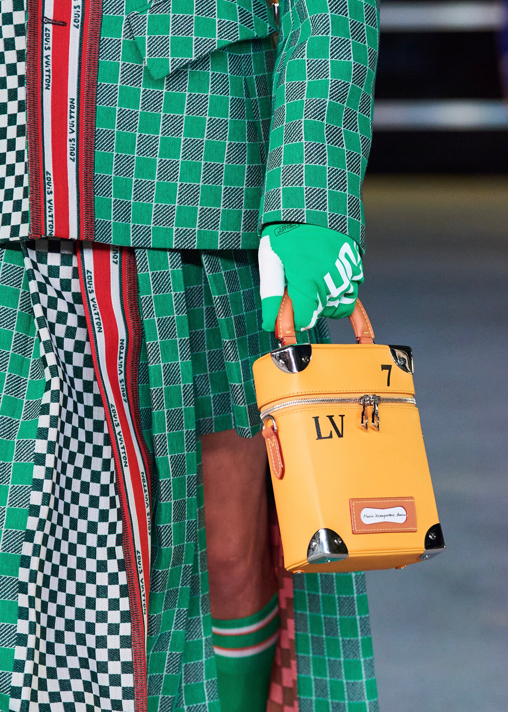 伝統的なラグジュアリーコードに進化する価値観を吹き込んだテーラードスーツとトラックスーツをはじめ、ワンピースやスカート、チェッカー柄やタイダイ染めといった、あらゆる境界線を曖昧にする自由な提案。ヴィヴィッドなグリーンやピンク、レインボーカラーなど、コロナで落ち込む世界に鮮やかさを取り込むカラーリングが際立つ。