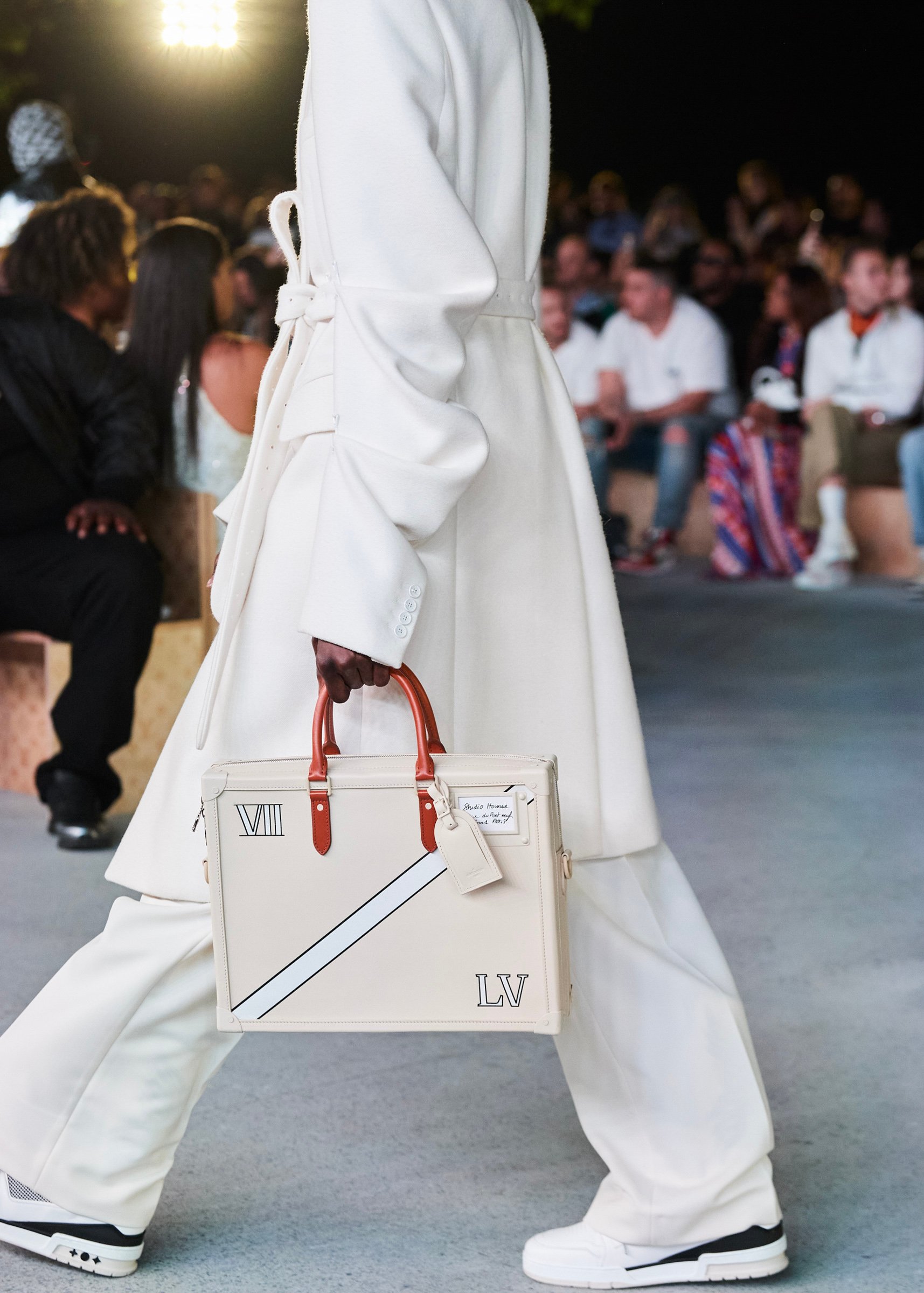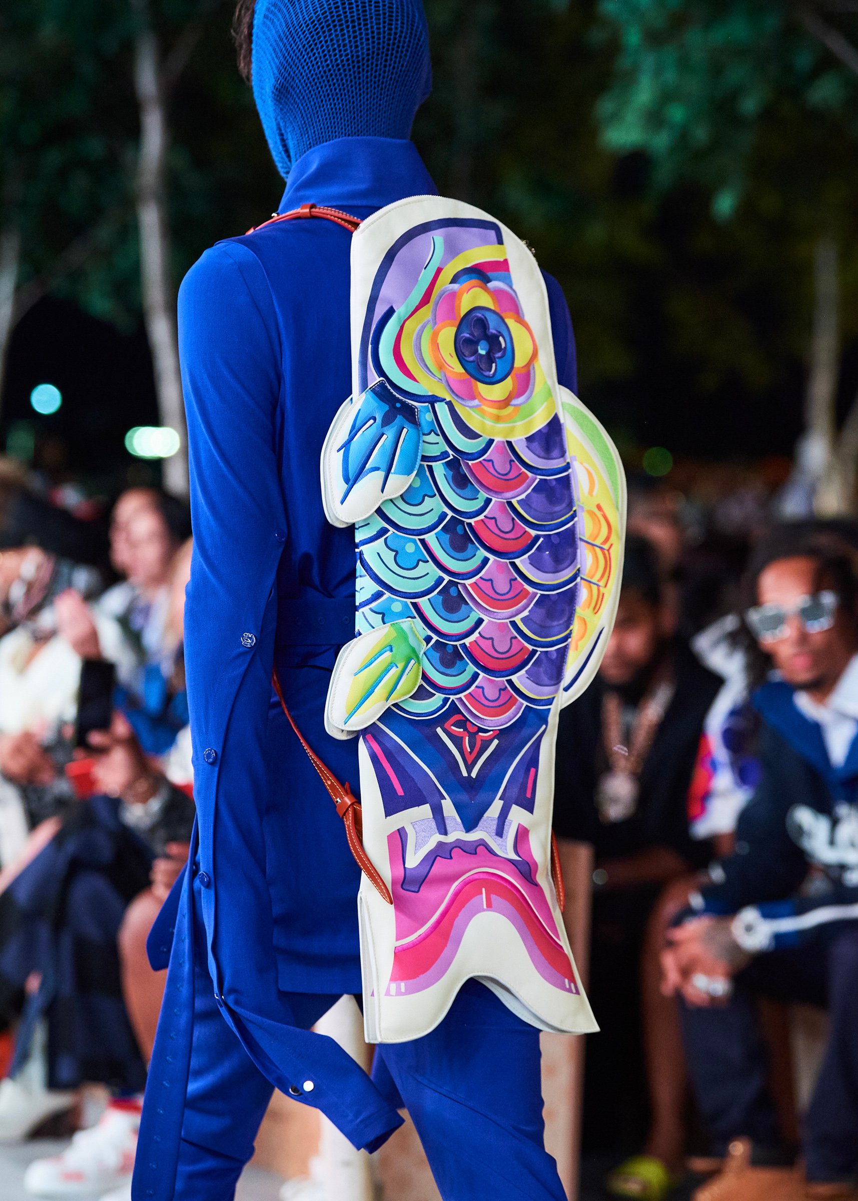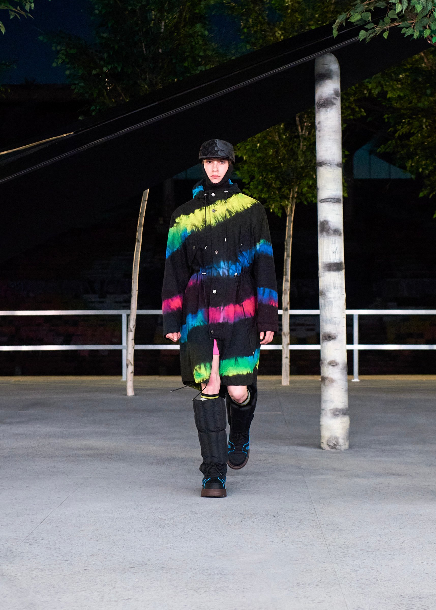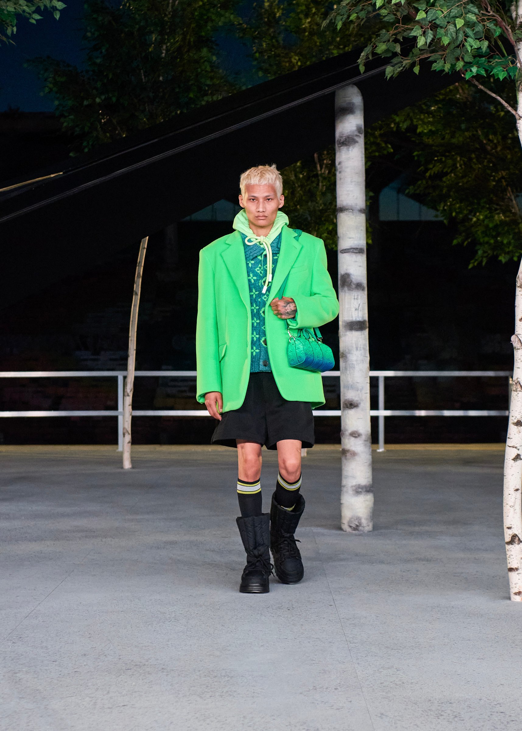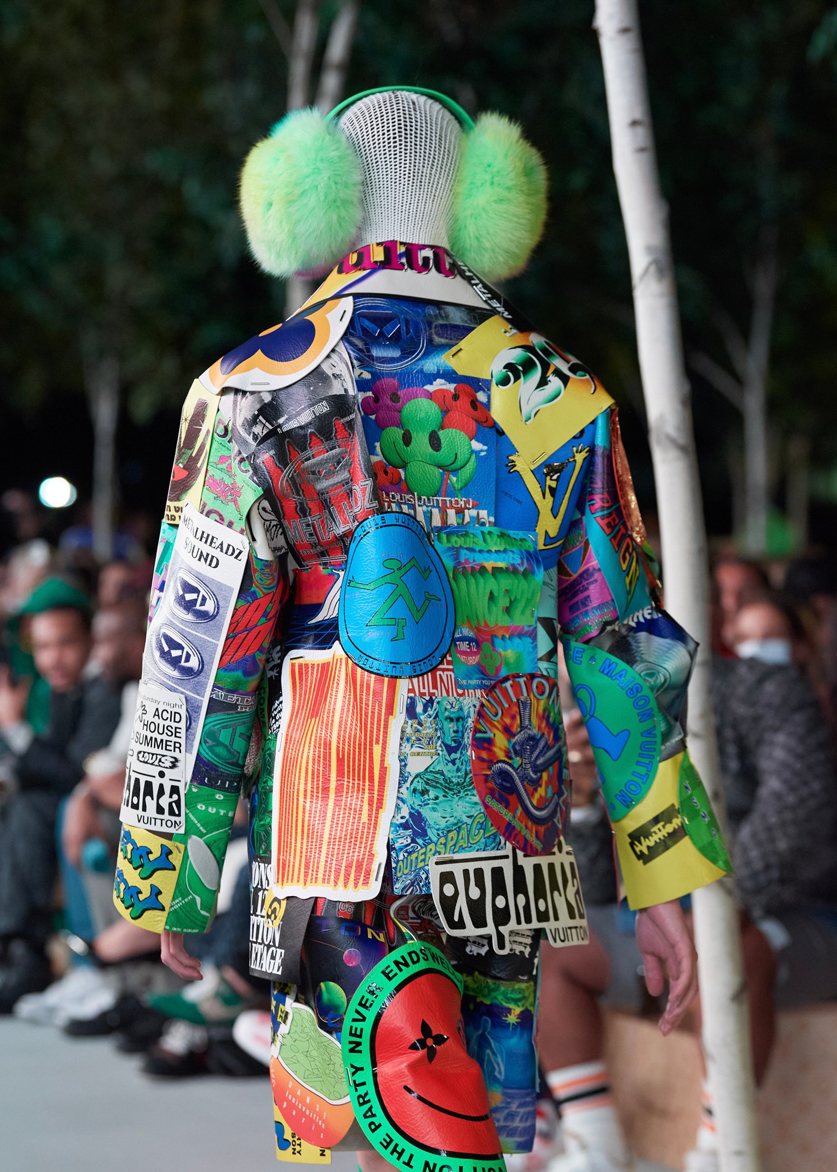 会場となったマイアミ・マリーン・スタジアムの一角には、キャンバスを抱えたヴァージルの像が立てられ、その視線の先に赤い気球を浮かべた。海に浮かぶ森のように木々が植えられたランウェイは、ヴァージルによるルイ・ヴィトンのデビューショーを思い起こさせるレインボーカラーのライトで照らされ、その中心に飛び立とうとしている黒い紙飛行機のオブジェを配置した。