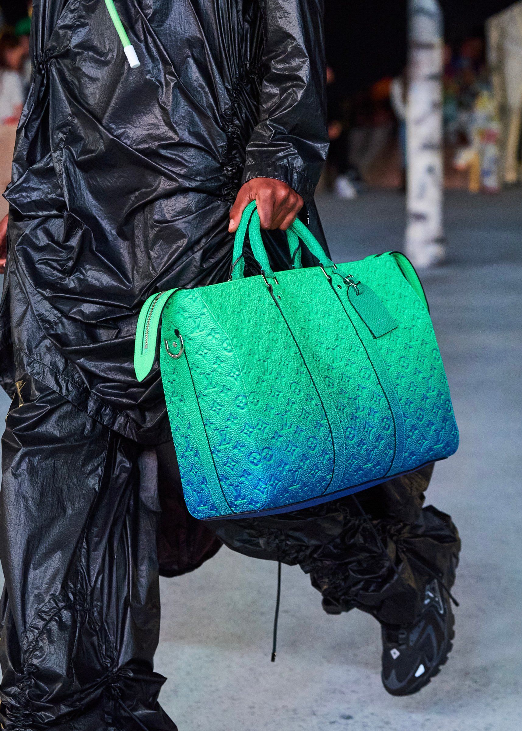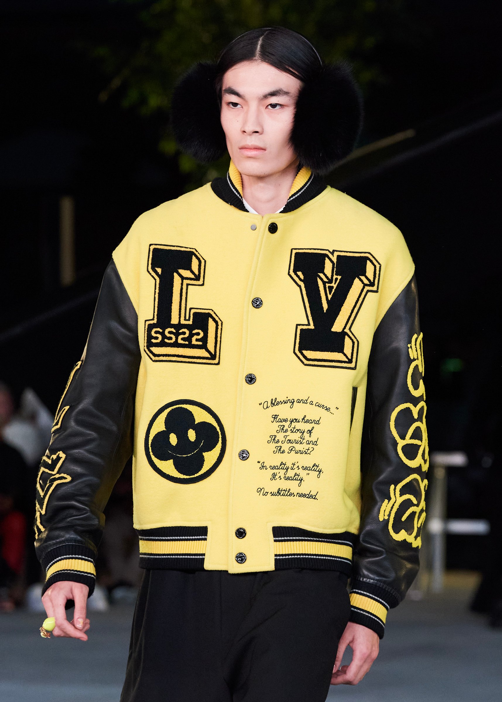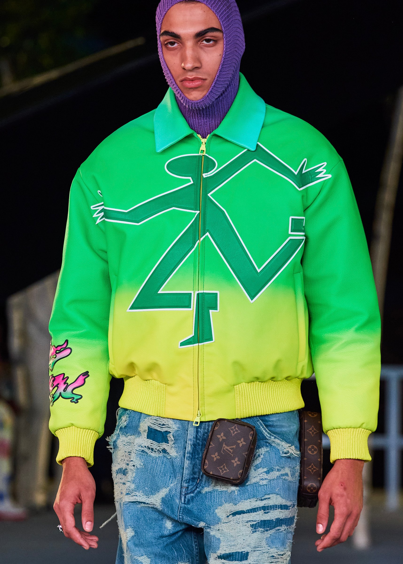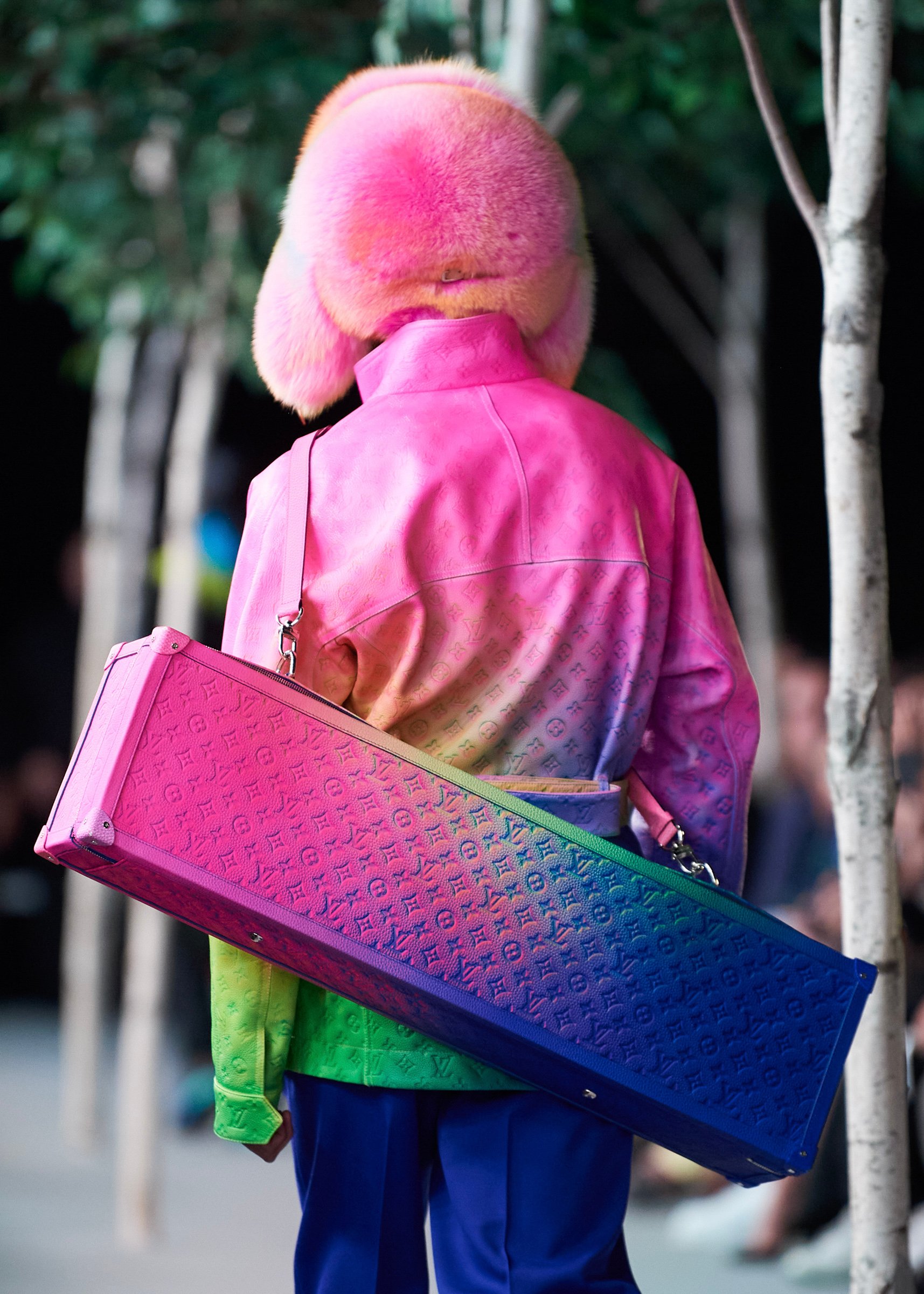 会場となったマイアミ・マリーン・スタジアムの一角には、キャンバスを抱えたヴァージルの像が立てられ、その視線の先に赤い気球を浮かべた。海に浮かぶ森のように木々が植えられたランウェイは、ヴァージルによるルイ・ヴィトンのデビューショーを思い起こさせるレインボーカラーのライトで照らされ、その中心に飛び立とうとしている黒い紙飛行機のオブジェを配置した。