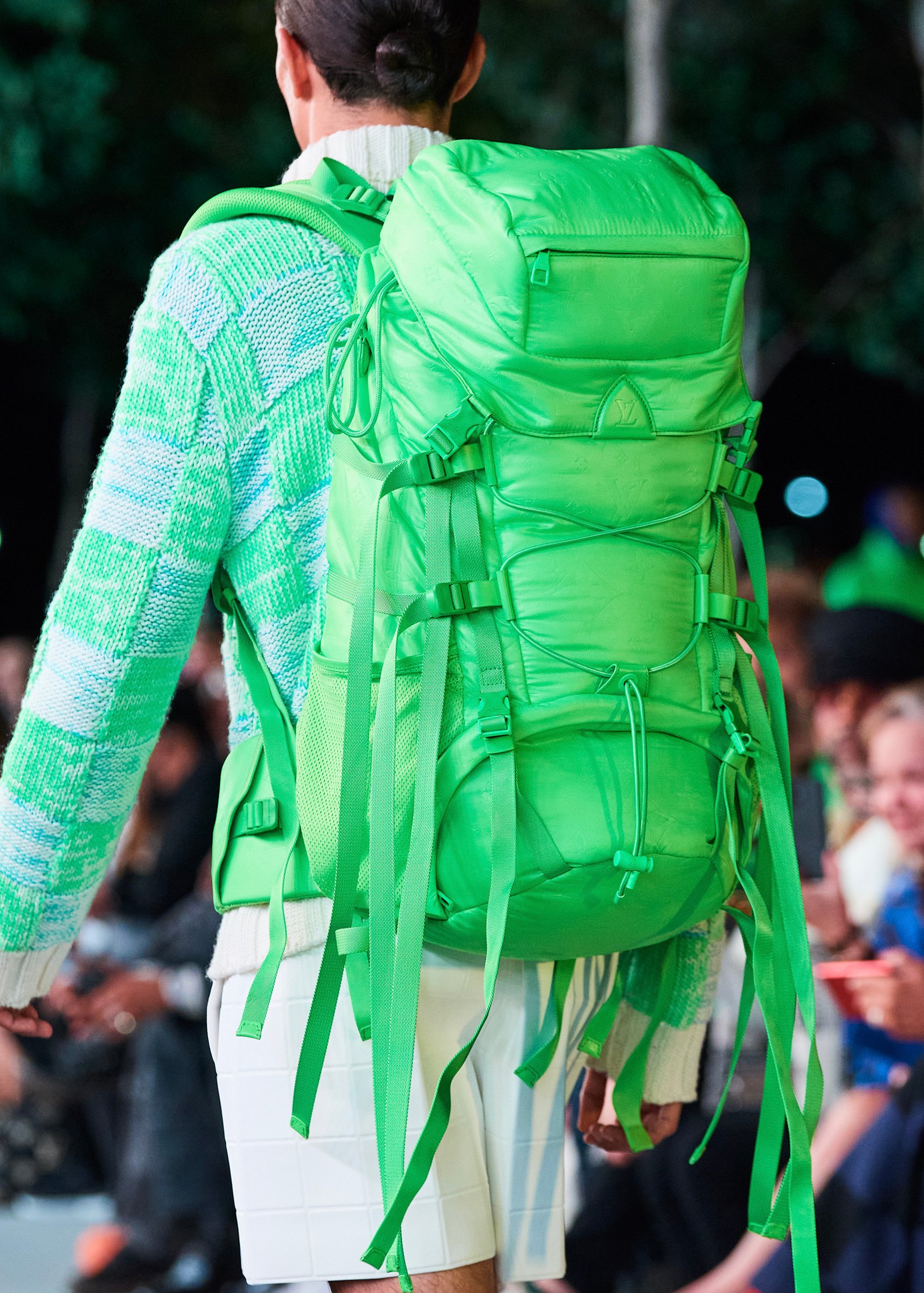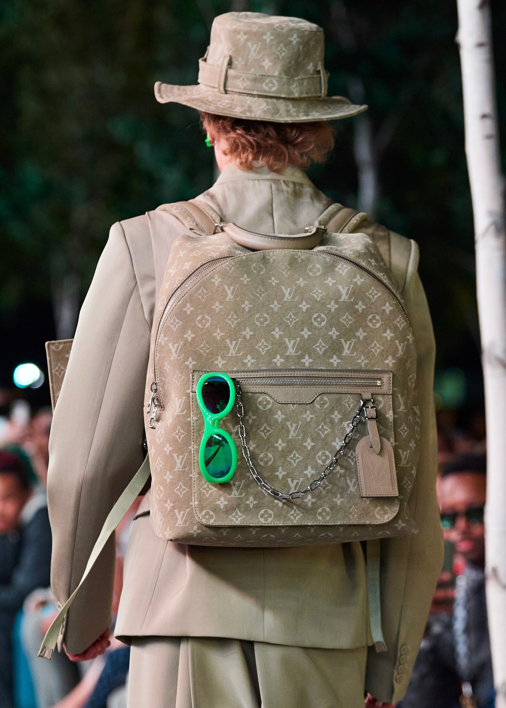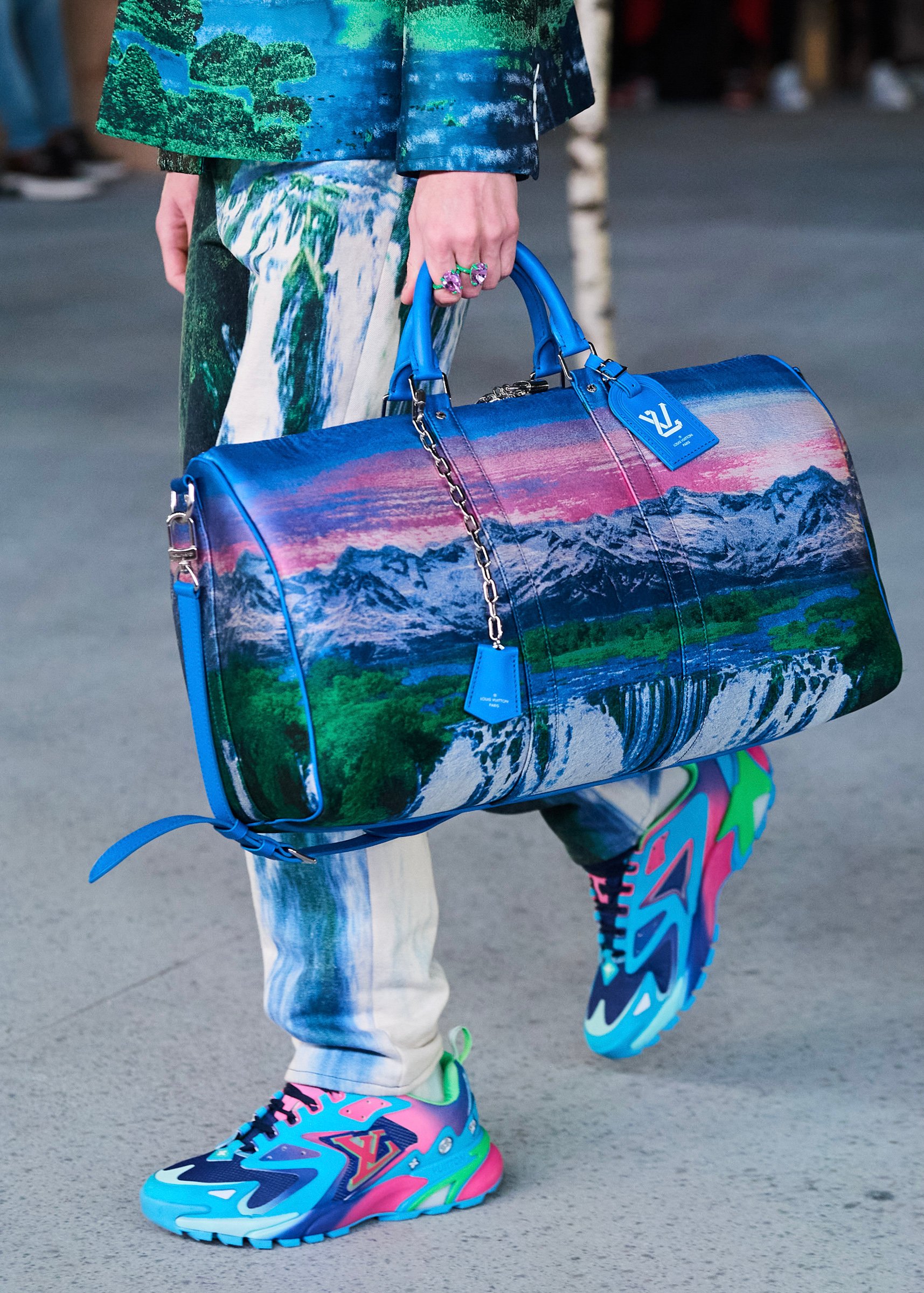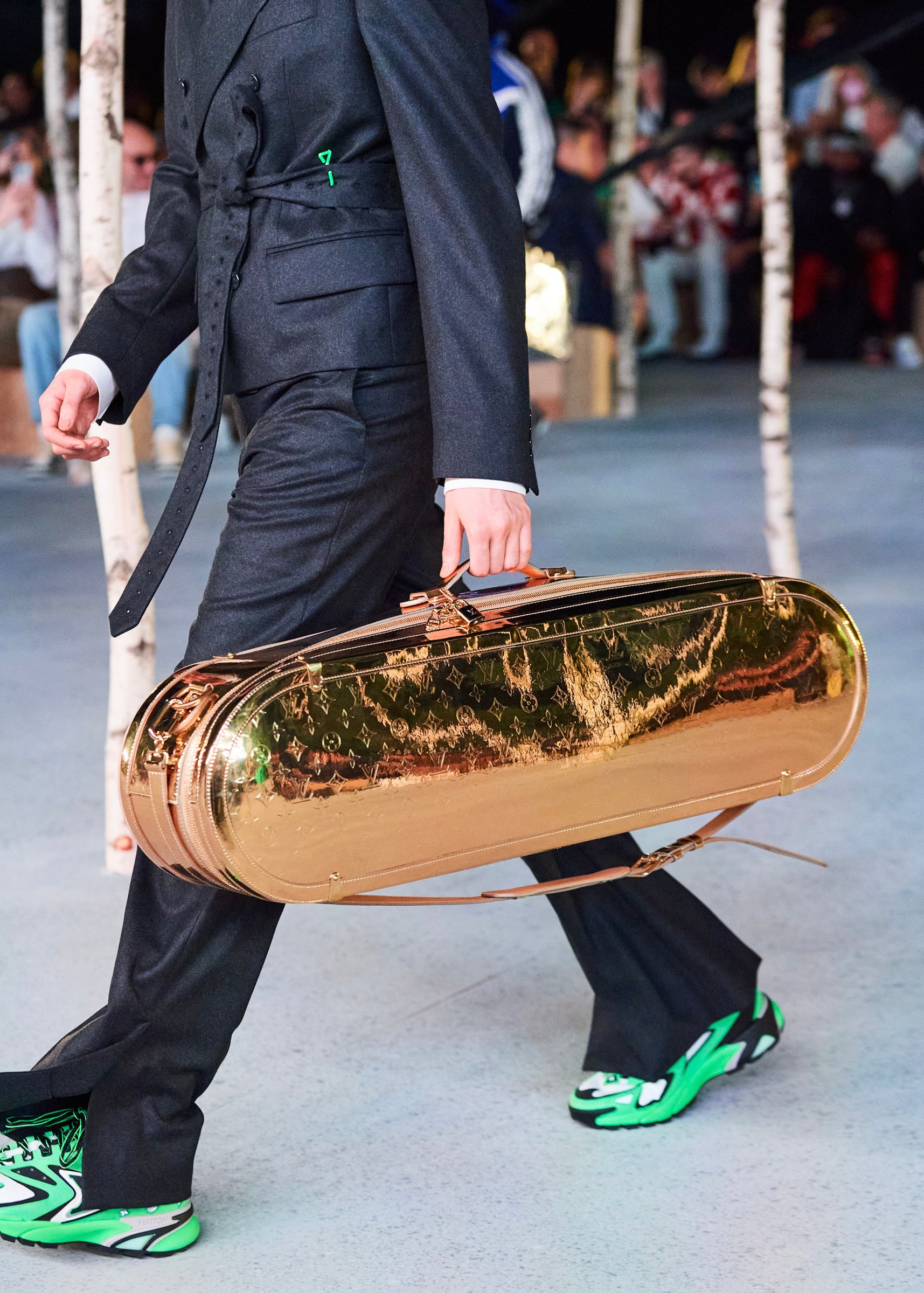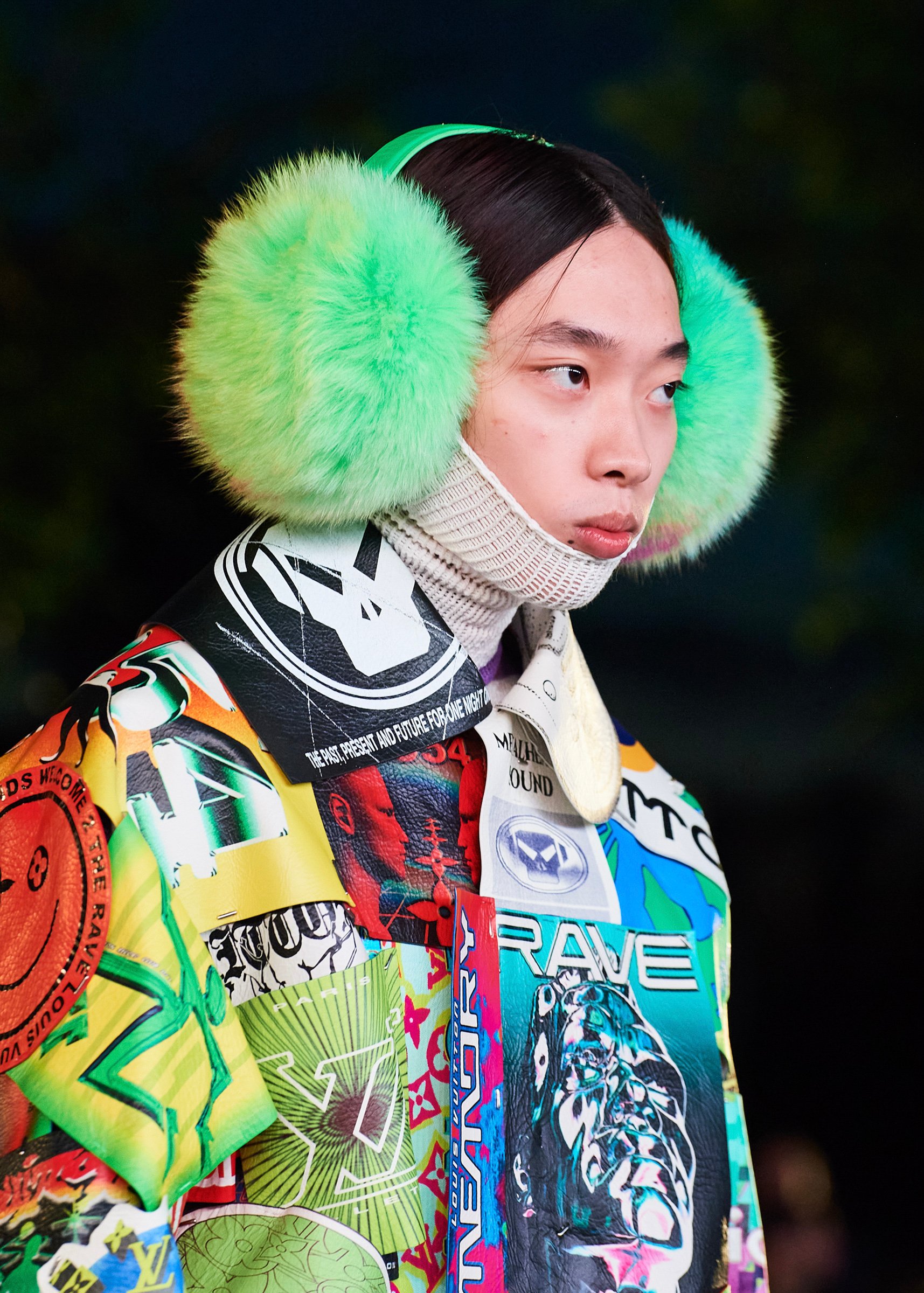 会場となったマイアミ・マリーン・スタジアムの一角には、キャンバスを抱えたヴァージルの像が立てられ、その視線の先に赤い気球を浮かべた。海に浮かぶ森のように木々が植えられたランウェイは、ヴァージルによるルイ・ヴィトンのデビューショーを思い起こさせるレインボーカラーのライトで照らされ、その中心に飛び立とうとしている黒い紙飛行機のオブジェを配置した。