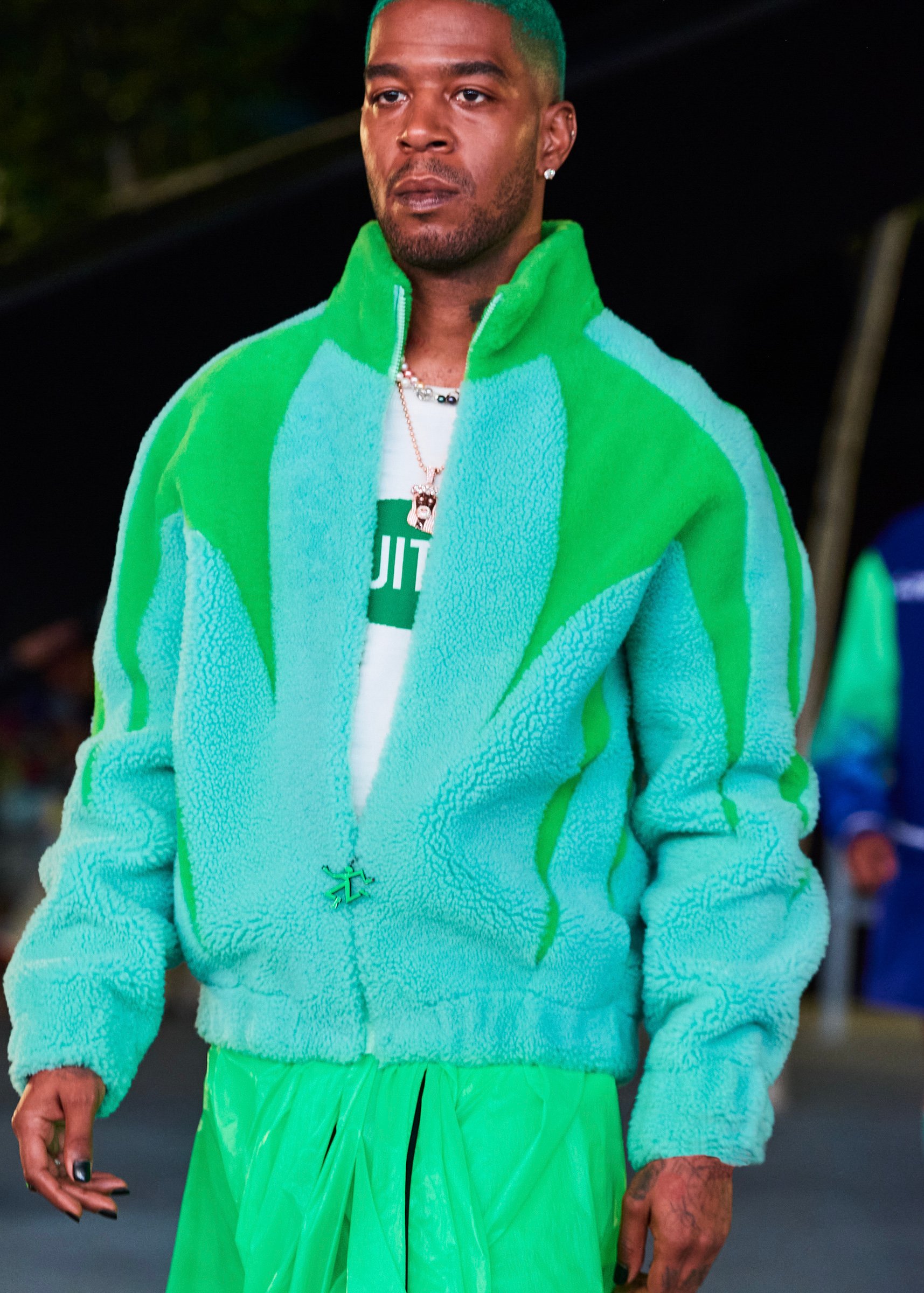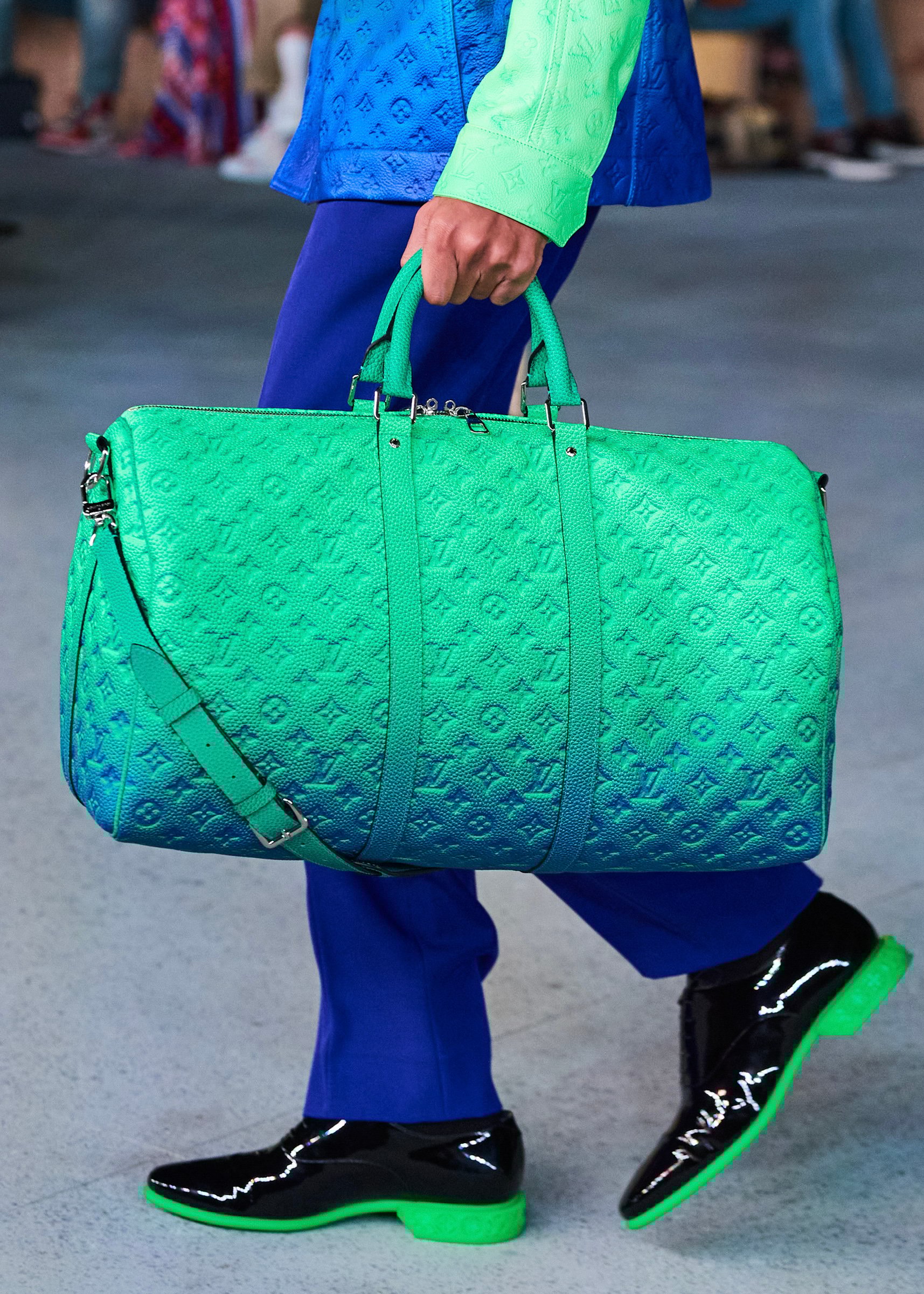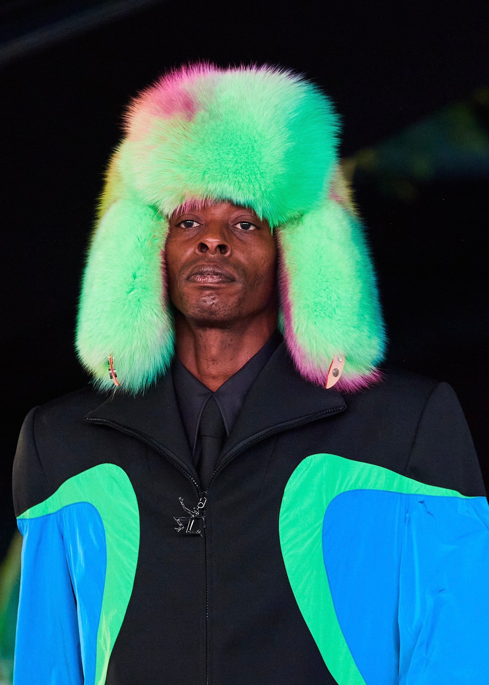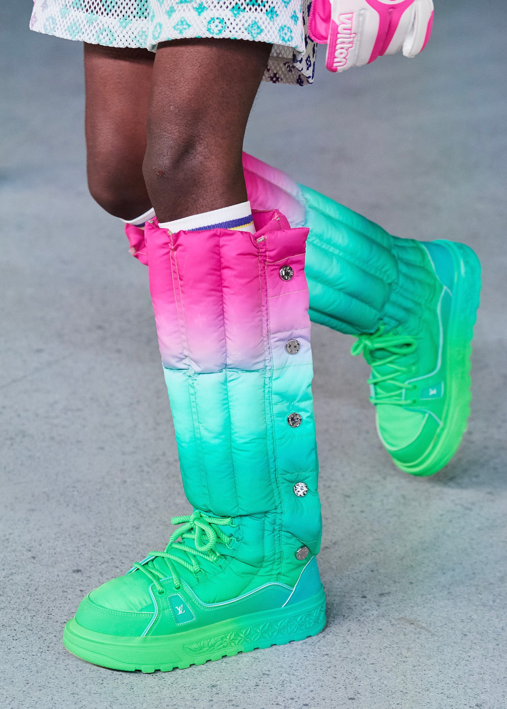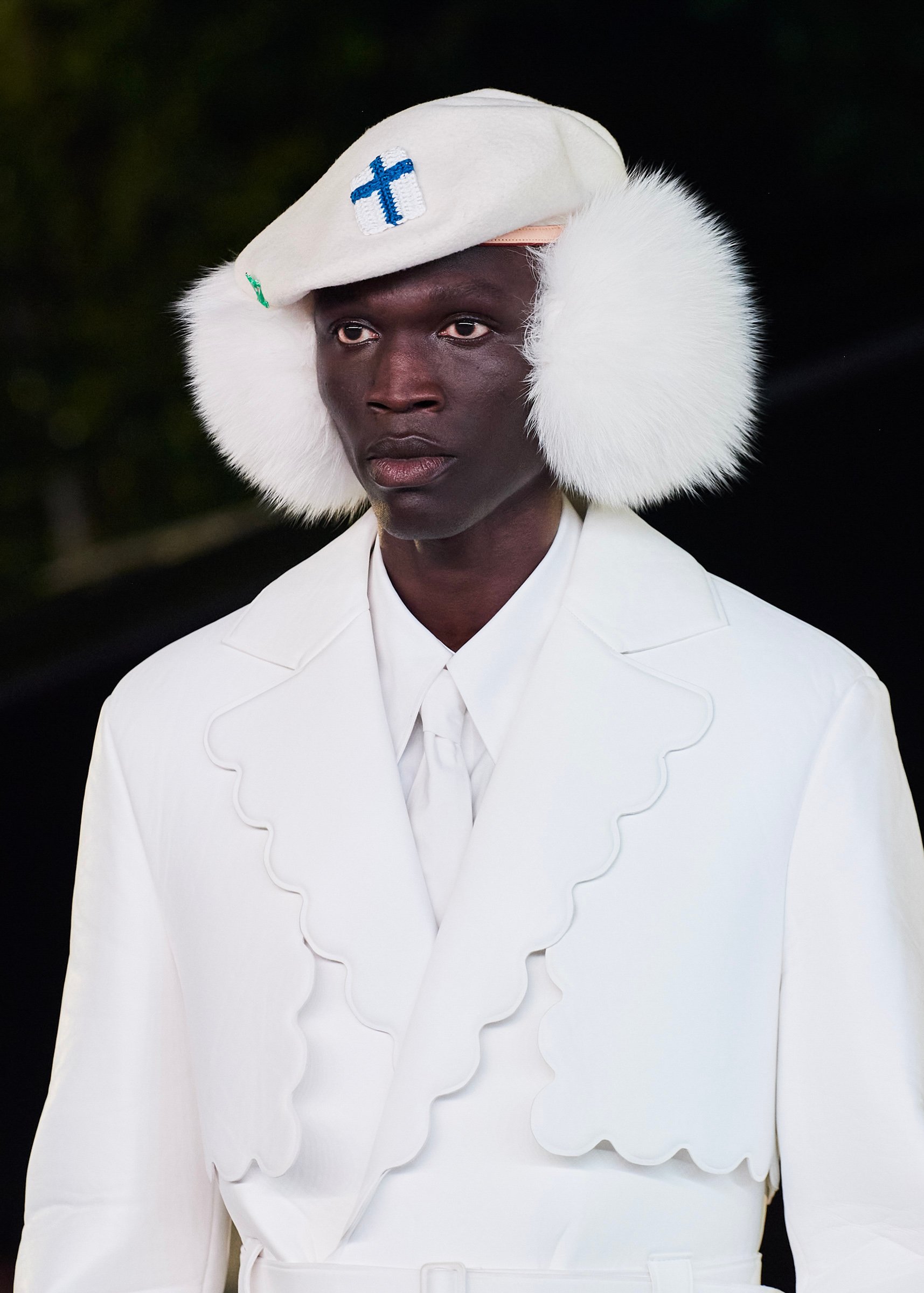 会場となったマイアミ・マリーン・スタジアムの一角には、キャンバスを抱えたヴァージルの像が立てられ、その視線の先に赤い気球を浮かべた。海に浮かぶ森のように木々が植えられたランウェイは、ヴァージルによるルイ・ヴィトンのデビューショーを思い起こさせるレインボーカラーのライトで照らされ、その中心に飛び立とうとしている黒い紙飛行機のオブジェを配置した。