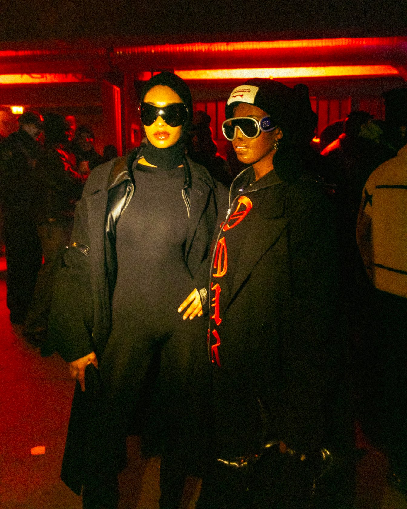 「リック・オウエンス」の来場者は、サングラス選びにも個性が光る。こちらはハーフリムのゴーグル風サングラスでモードに。