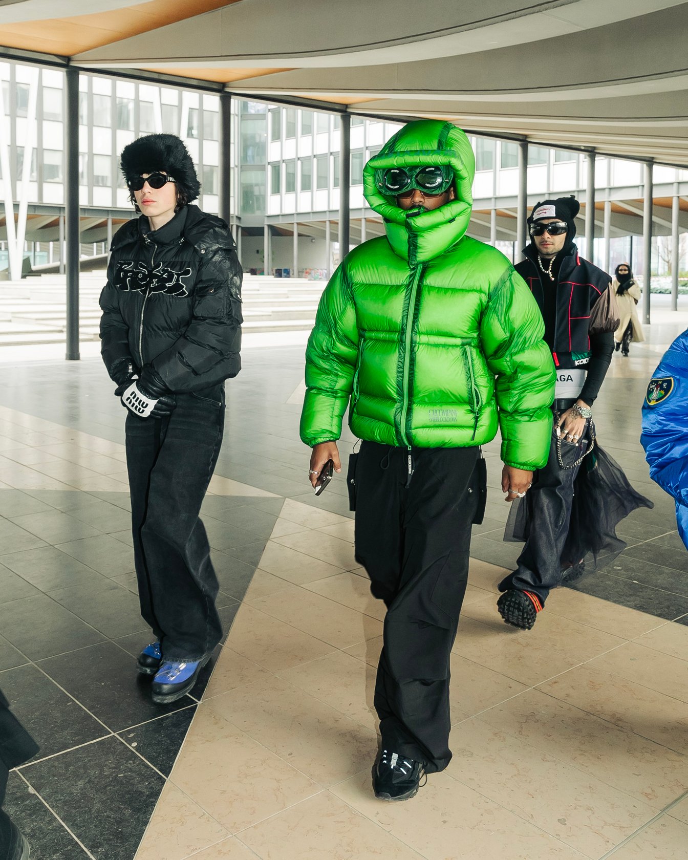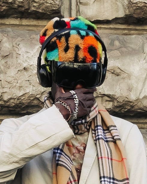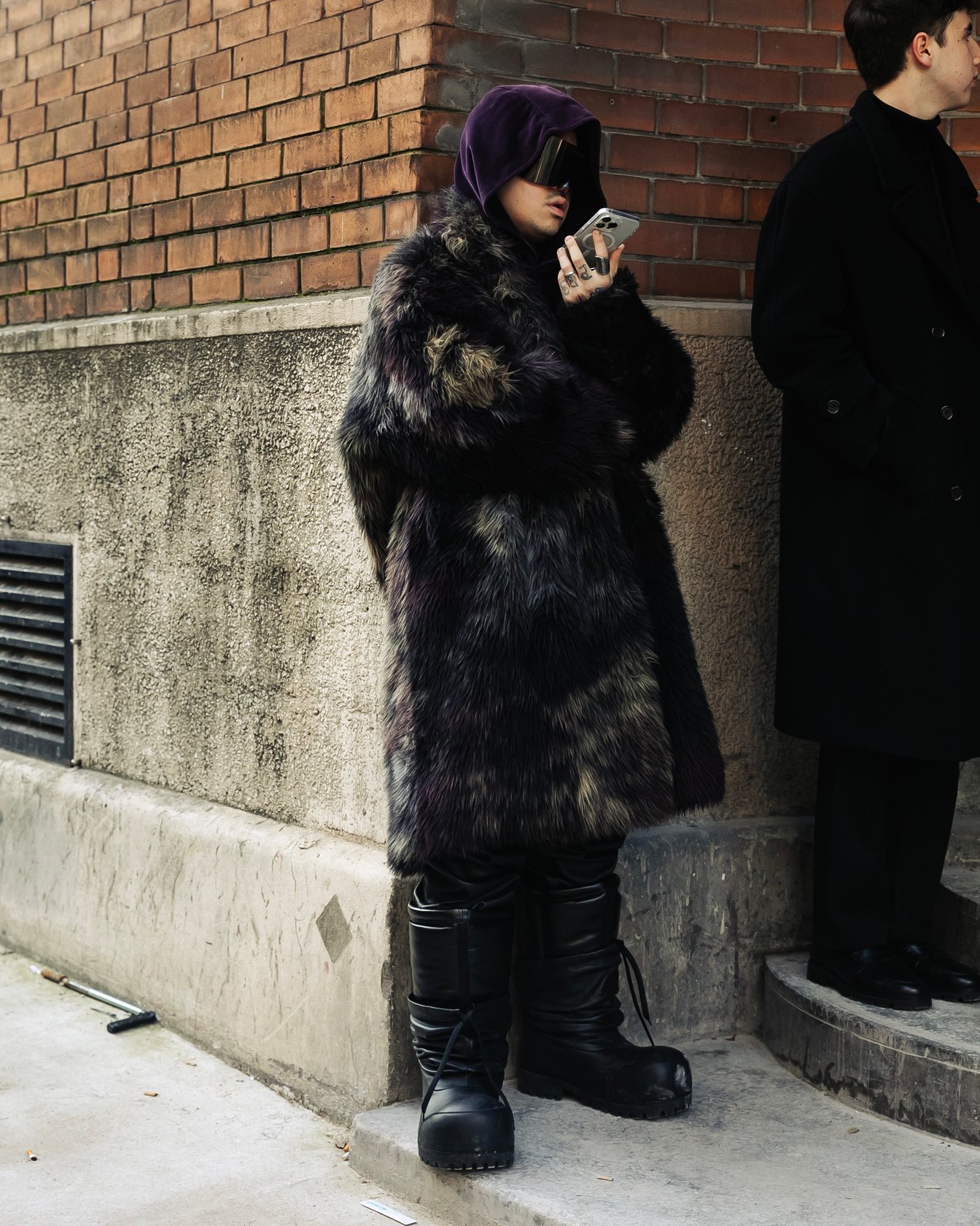 「ロエベ」の会場でキャッチした彼。ファーキャップにヘッドホン、おまけに口を隠したポーズで、ファッションウィークに"没入中"のガチ勢。