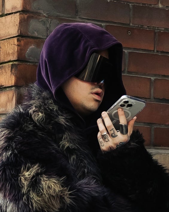 視界を覆う面積と、レンズの間の余白の少なさが近未来感の鍵と言えそう。フードを被り、iPhoneとの会話に没入中の1枚。