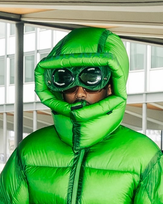 スキーゴーグルのようなアタッチメントと、サングラスを重ね付け。実はこれ、ダウンのフードの一部。