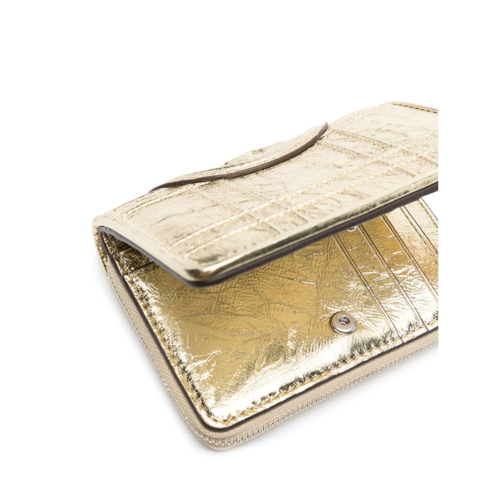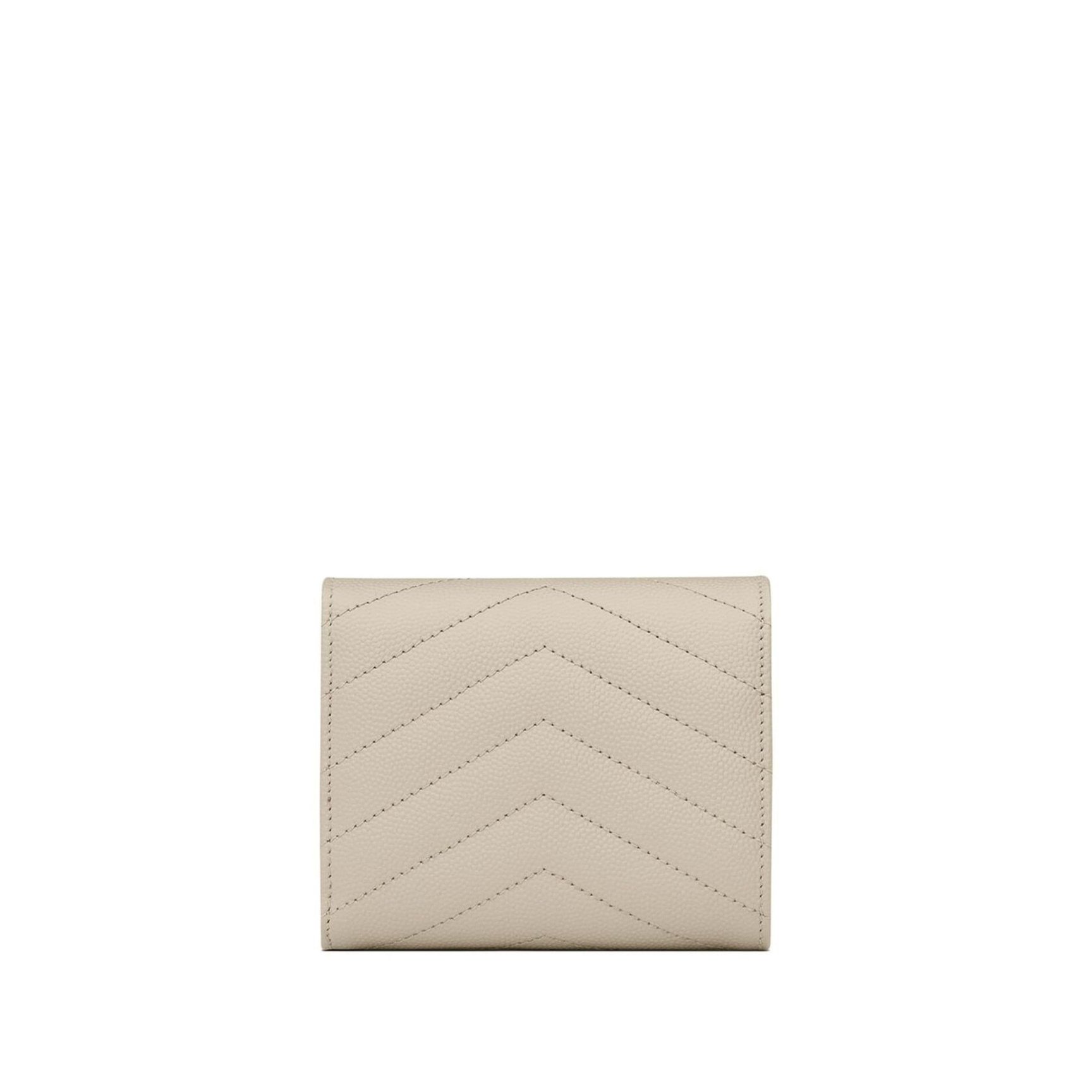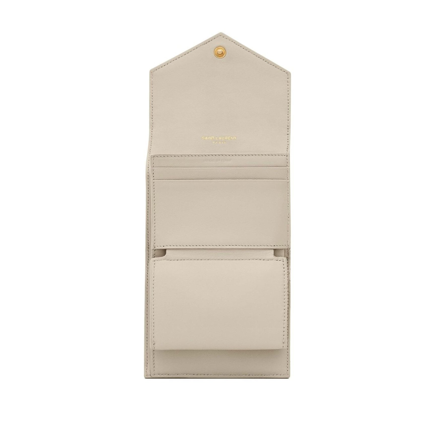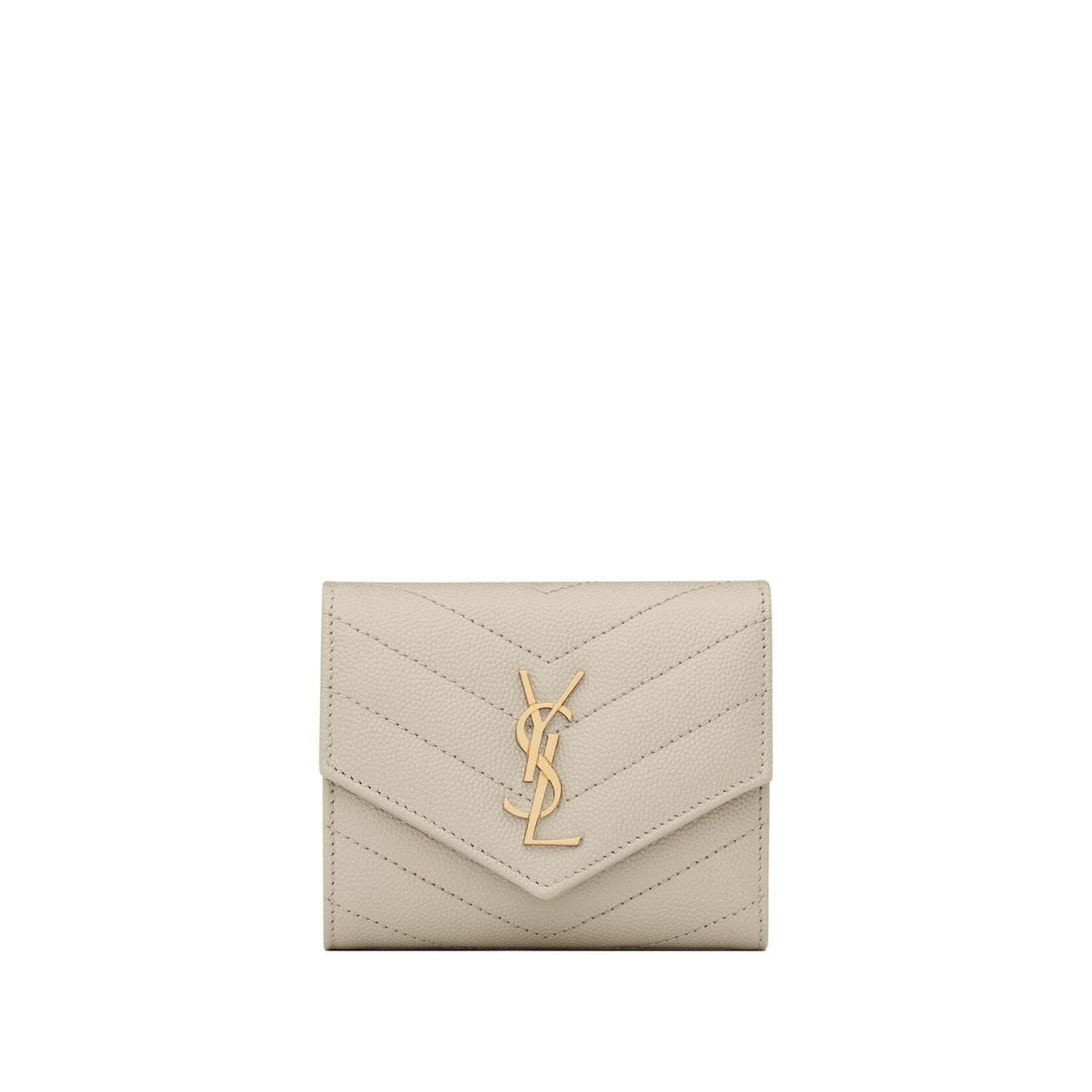 落ち着きのあるクリームホワイトと、輝くYSLロゴプレートに魅了される「サンローラン(SAINT LAURENT)」。全体のステッチから流れるように繋がるフラップを開くと、上部はカード、下部は小銭、奥は紙幣と縦向きに使用するコンパートメントがお目見えします。