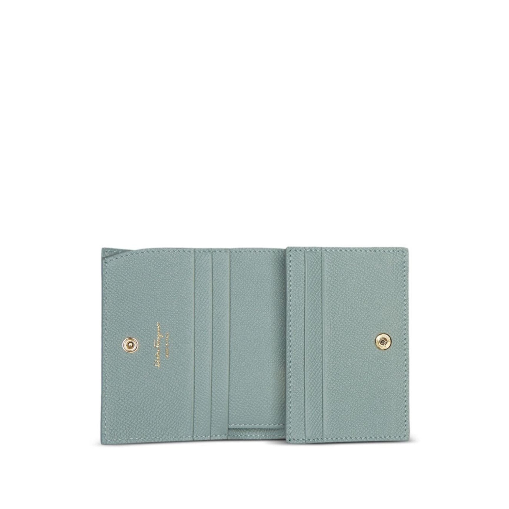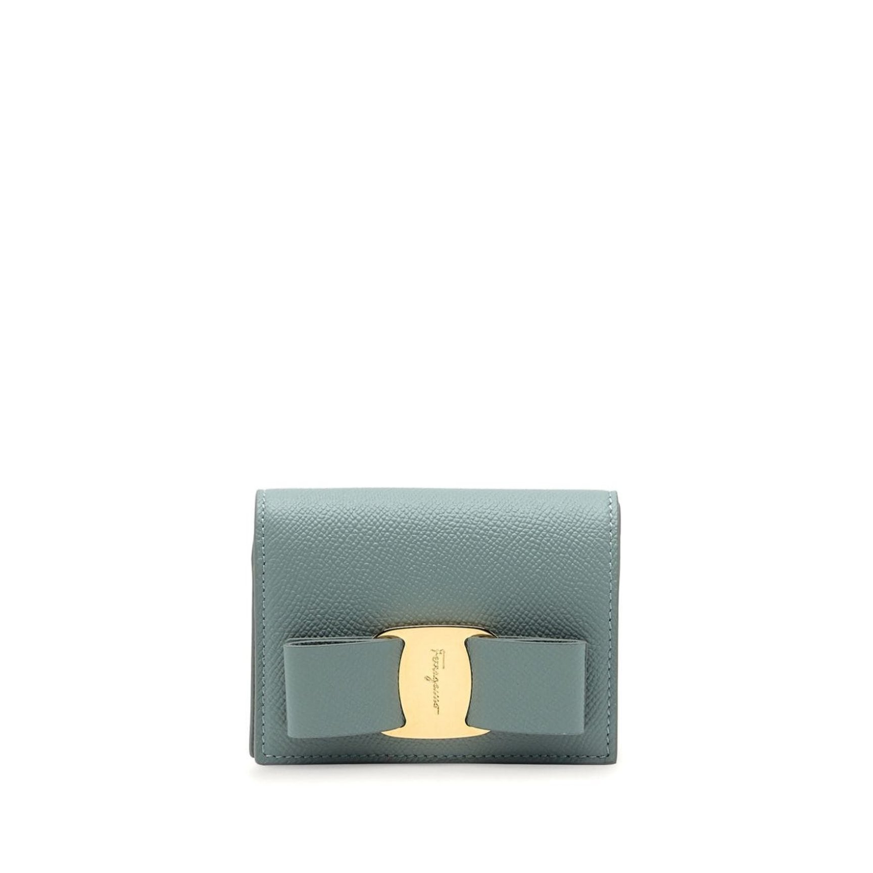優雅に結んだヴァラ・リボンを主役に添えた「フェラガモ(FERRAGAMO)」。ミントブルーが映える本体には、左側に3つのカードスロット、右側に2つのカードスロット、その奥にジップ式コインポケットと札入れを忍ばせています。色違いにはフェミニンなピンクもラインナップ。