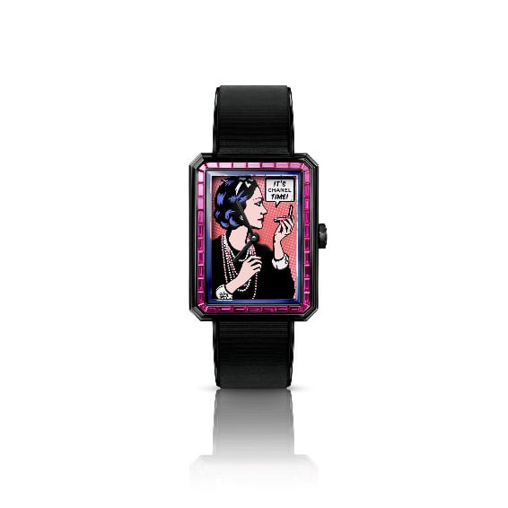 シャネルは、ブランドのアイコンであるマドモアゼル・シャネルをモチーフにした腕時計「ボーイフレンド ココ アート」を発表。グランフーエナメルとデカールで描いたポップアート調のイラストとピンクサファイアがセッティングされたベゼルで、ポップさと高級感が共存しています。