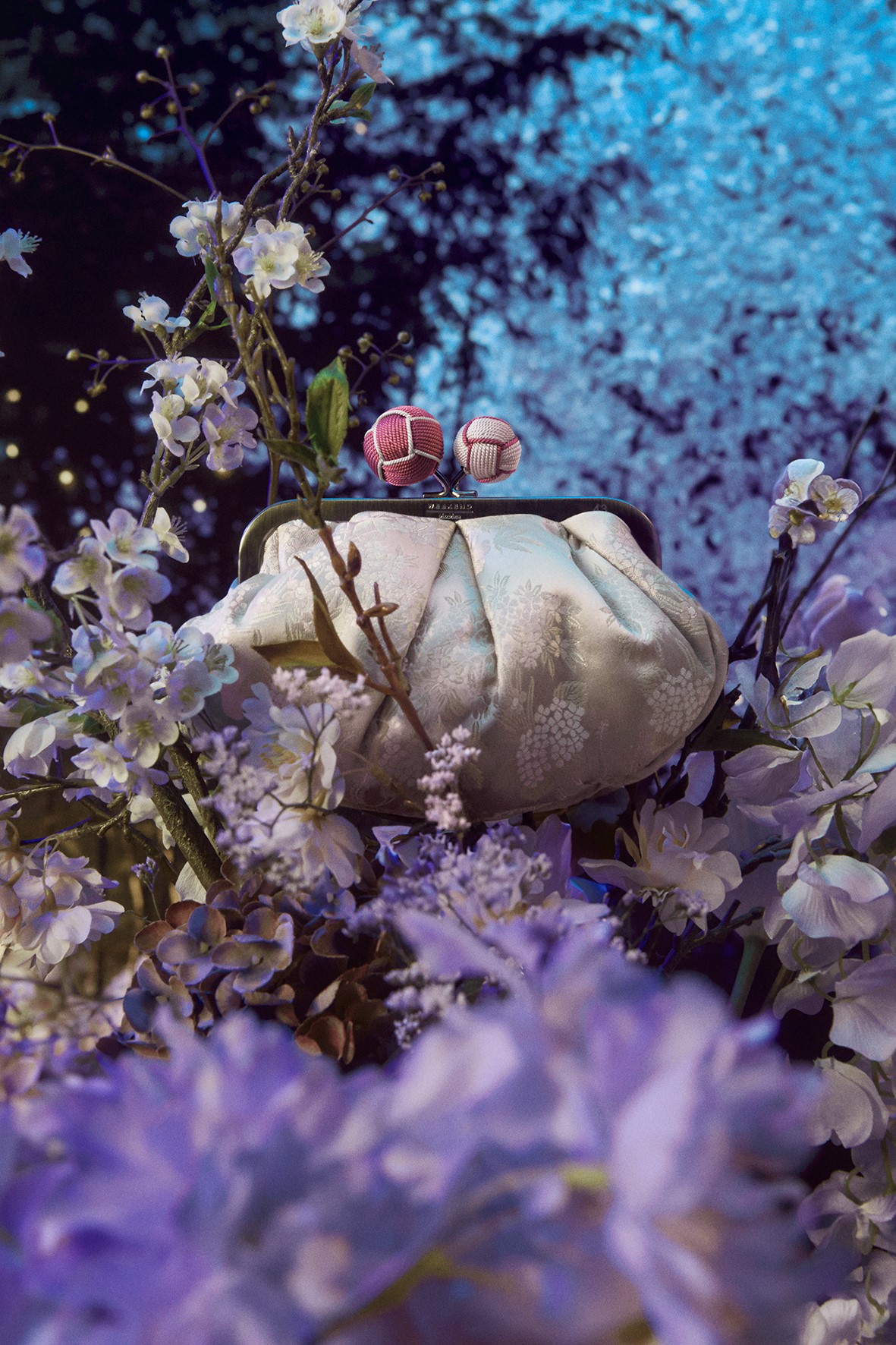 日本の伝統を取り入れた限定コレクションは、ミディアム(16万3900円)とスモール(13万9700円)の2サイズ、計6つのバリエーションで展開。絢爛なシルクジャカードはすべて「川島織物セルコン」のアーカイヴから選ばれたものだ。同社は1843年に京都で創業し、帯や装束などを手掛けるファブリックメーカー。今回の限定バッグには花模様や唐草模様など、豊かな収穫や生命を象徴するモチーフを用い、繊細さと華やかさを感じさせる仕上がりに。また、シグネチャーのボールクラスプは、1927年の創業から4世代にわたり帯締めや羽織紐を手がける京都の「中森組紐店」によるハンドメイド。コントラストカラーの糸でくるまれたボール部分が、アクセントを加えている。