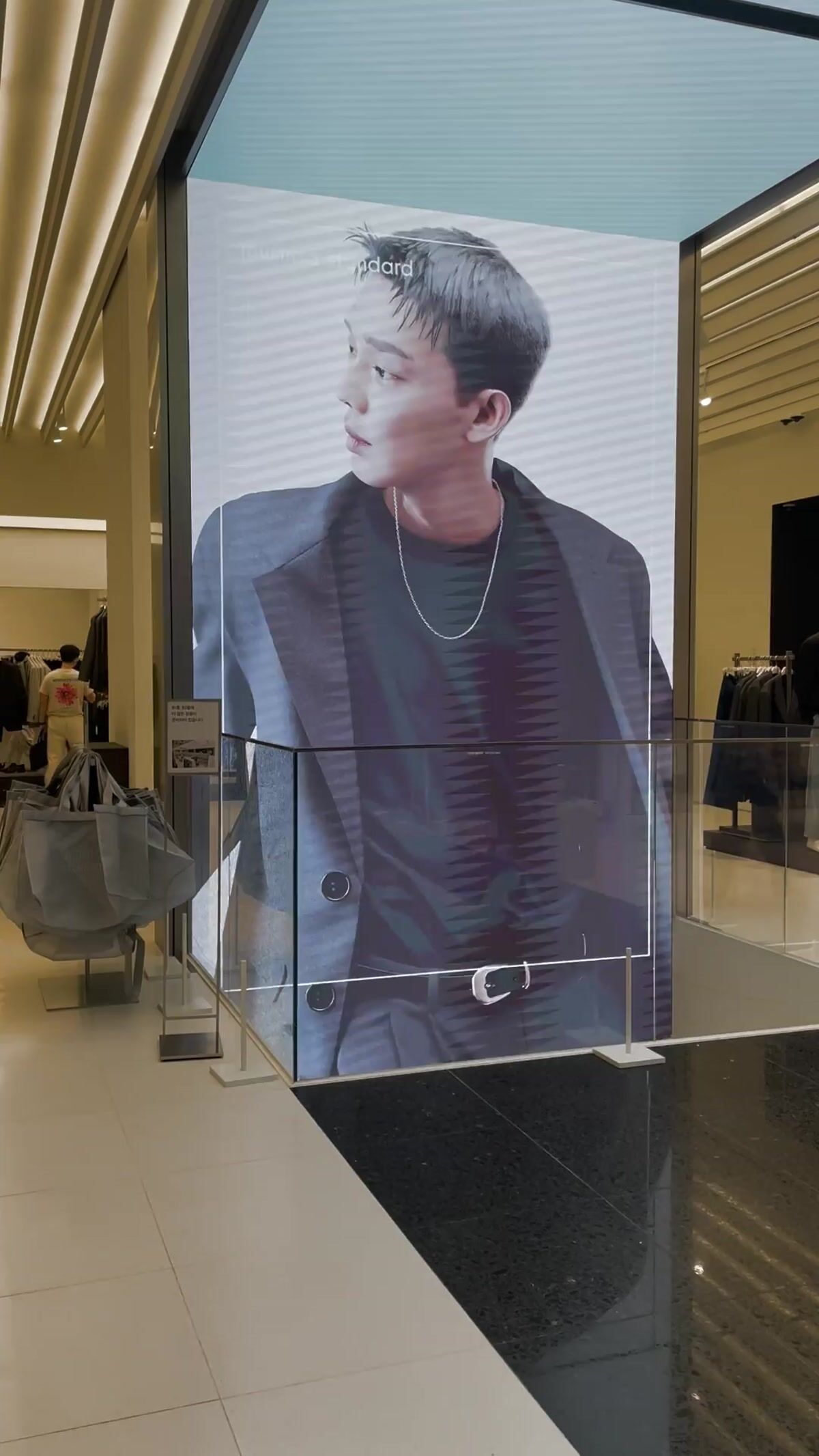 店舗の作りもユニーク。無機質の空間に巨大な液晶ディスプレイを配しており、どこか近未来を感じさせる作り。韓国は自撮り文化があり、試着室は明るさを調整できる照明があったり、自撮りする想定でブランドロゴがあらかじめ反転してデザインされていたりとセルフィー仕様に工夫されています。店内は天井まで続く帯状の液晶や、透ける液晶など日本では見られない大胆な液晶ディスプレイ使いが印象的で、キャンペーンや立体的なヴィジュアルが投影され、空間作りに一役買っています。