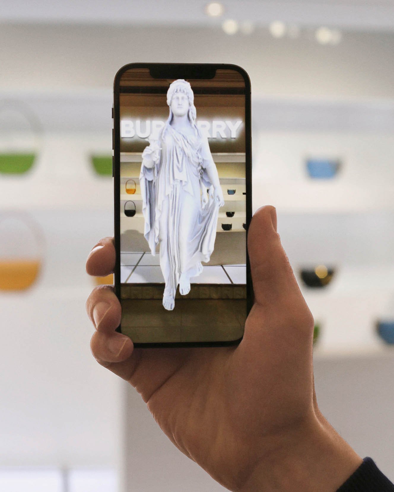 フォルムの美しさやカラーの鮮やかさが引き立つオールホワイトのポップアップストアの会場には、古代ギリシャを彷彿とさせる巨大な女神がずらり。3Dプリンターで製作されたというインパクトのある女神たちは、オリンピアバッグにも通ずるクラシシズムへの現代的なアプローチを反映しています。