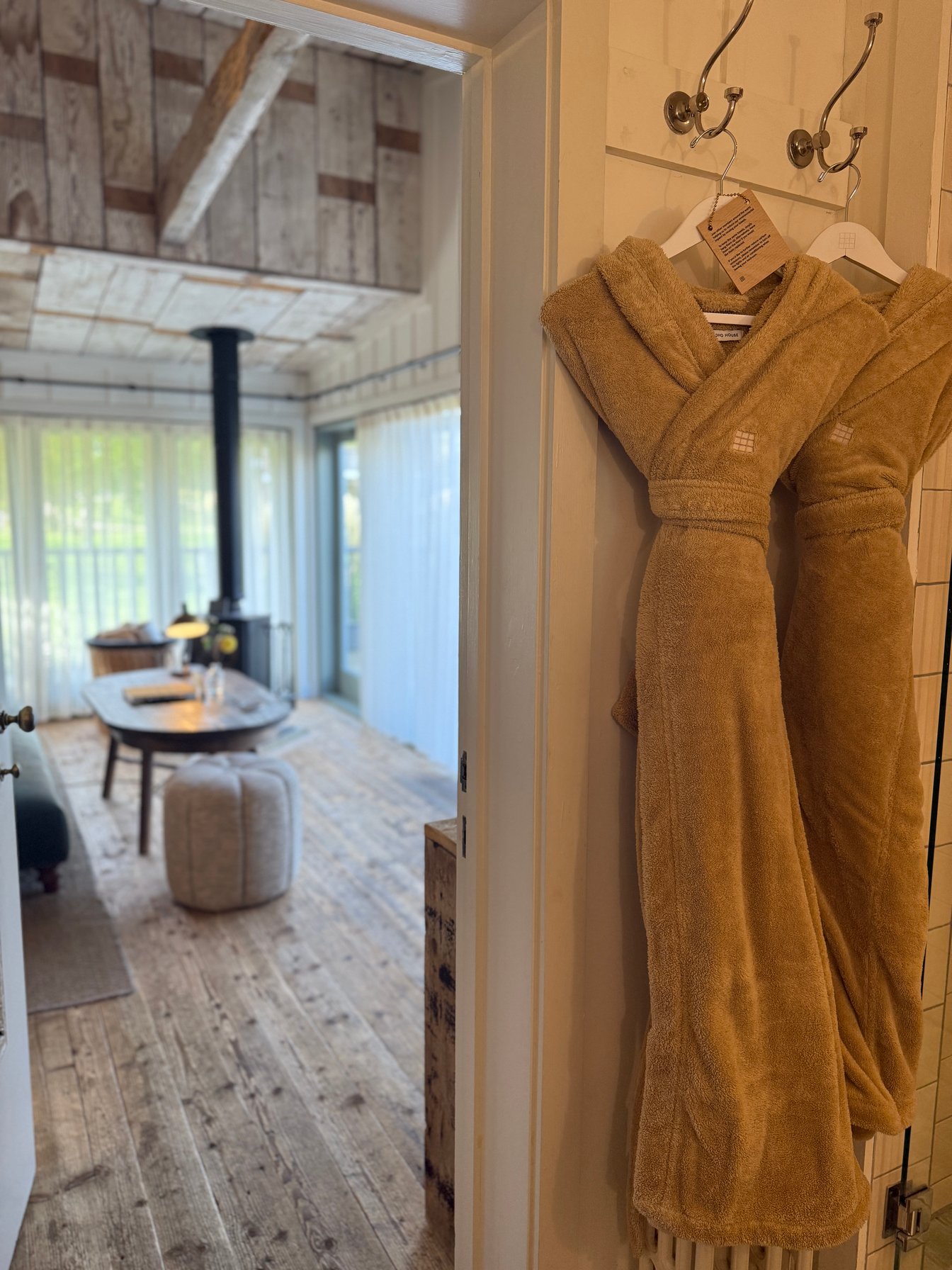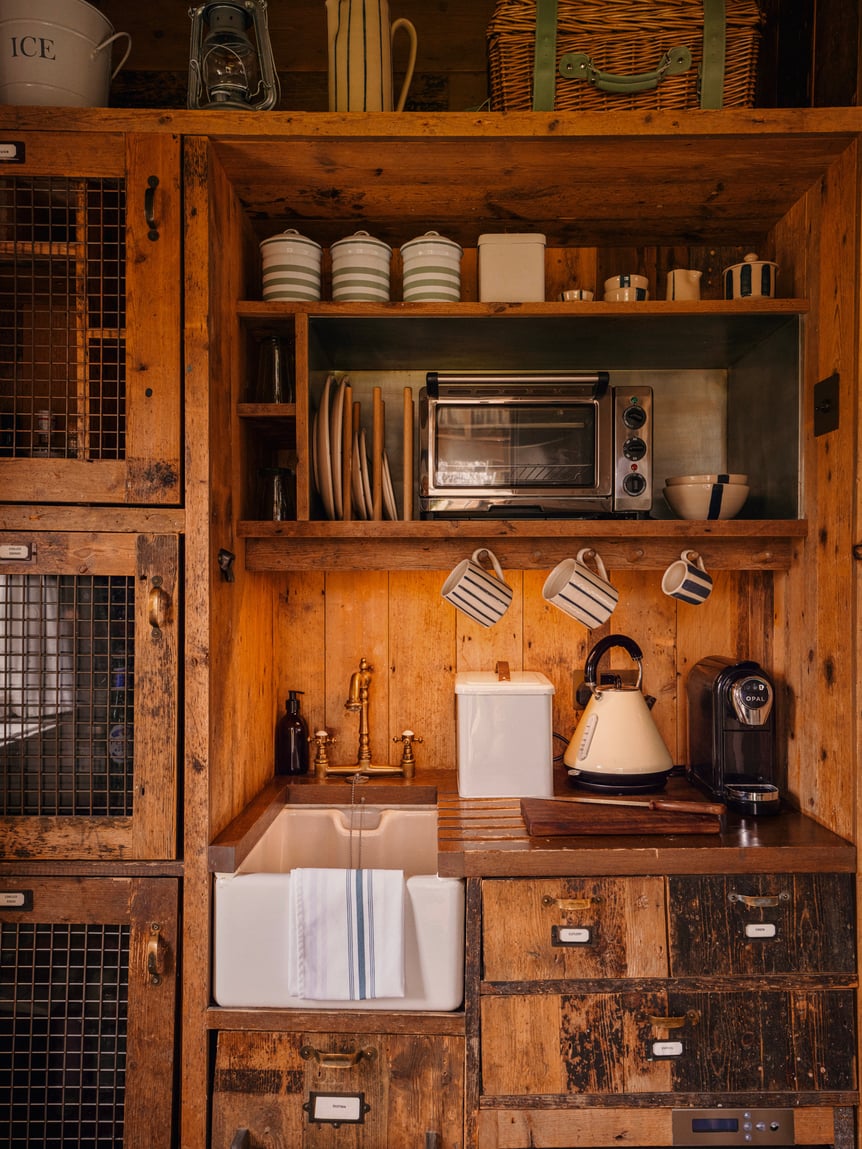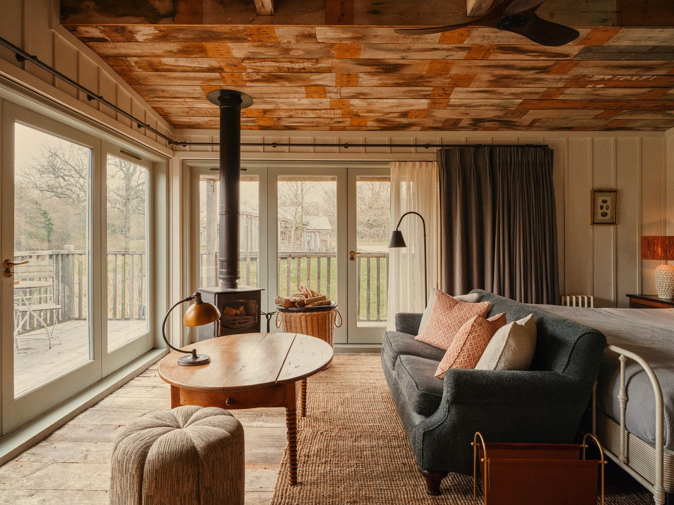 今回宿泊したのは「キャビン」と呼ばれる部屋。敷地内で40あるこのタイプの部屋はシンク付きのカップボードや特注の家具、薪ストーブなどが備え付けられた木目の美しいヴィンテージ調に統一された内装で、ぬくもりのある開放的なプライベート空間です。