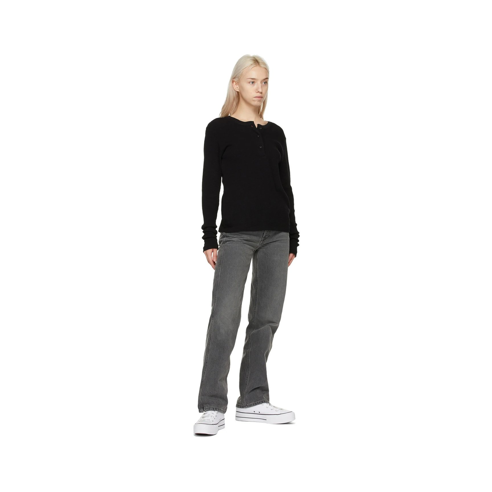 ハイカットにアレンジされた純白の「コンバース(CONVERSE)」の「チャックテイラー」です。ソールもプラットフォームにアレンジして、定番モデルを少し違った雰囲気で履きこなして。