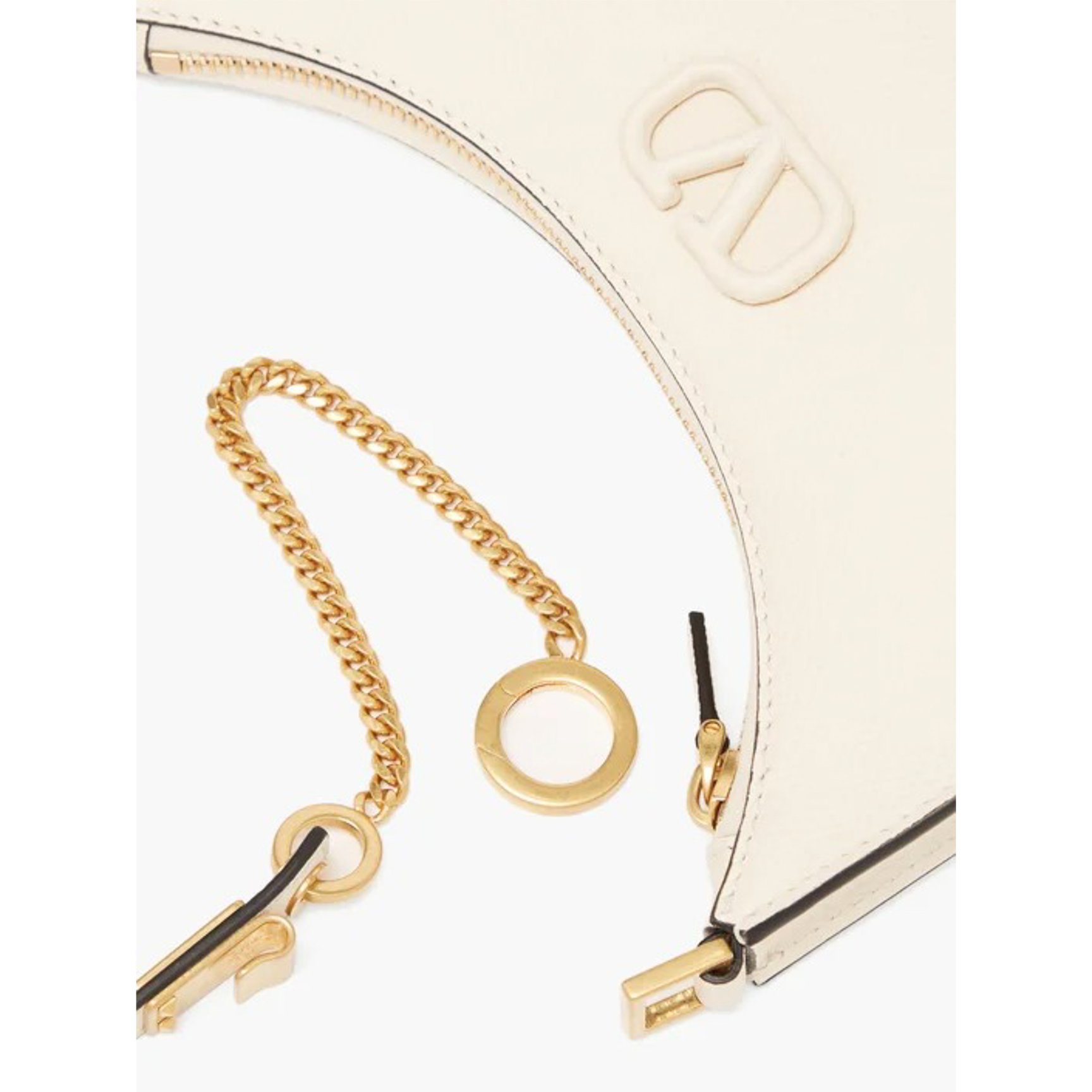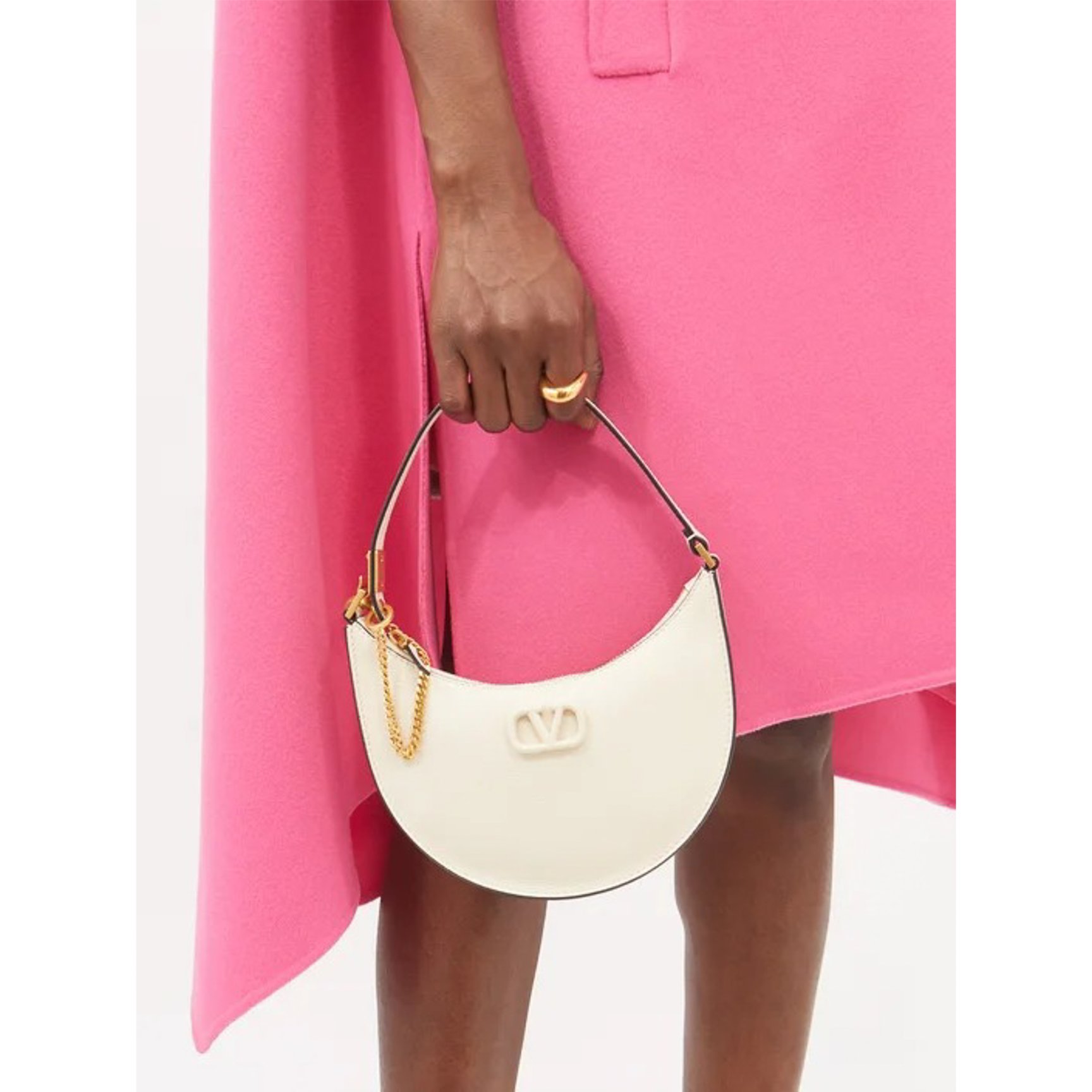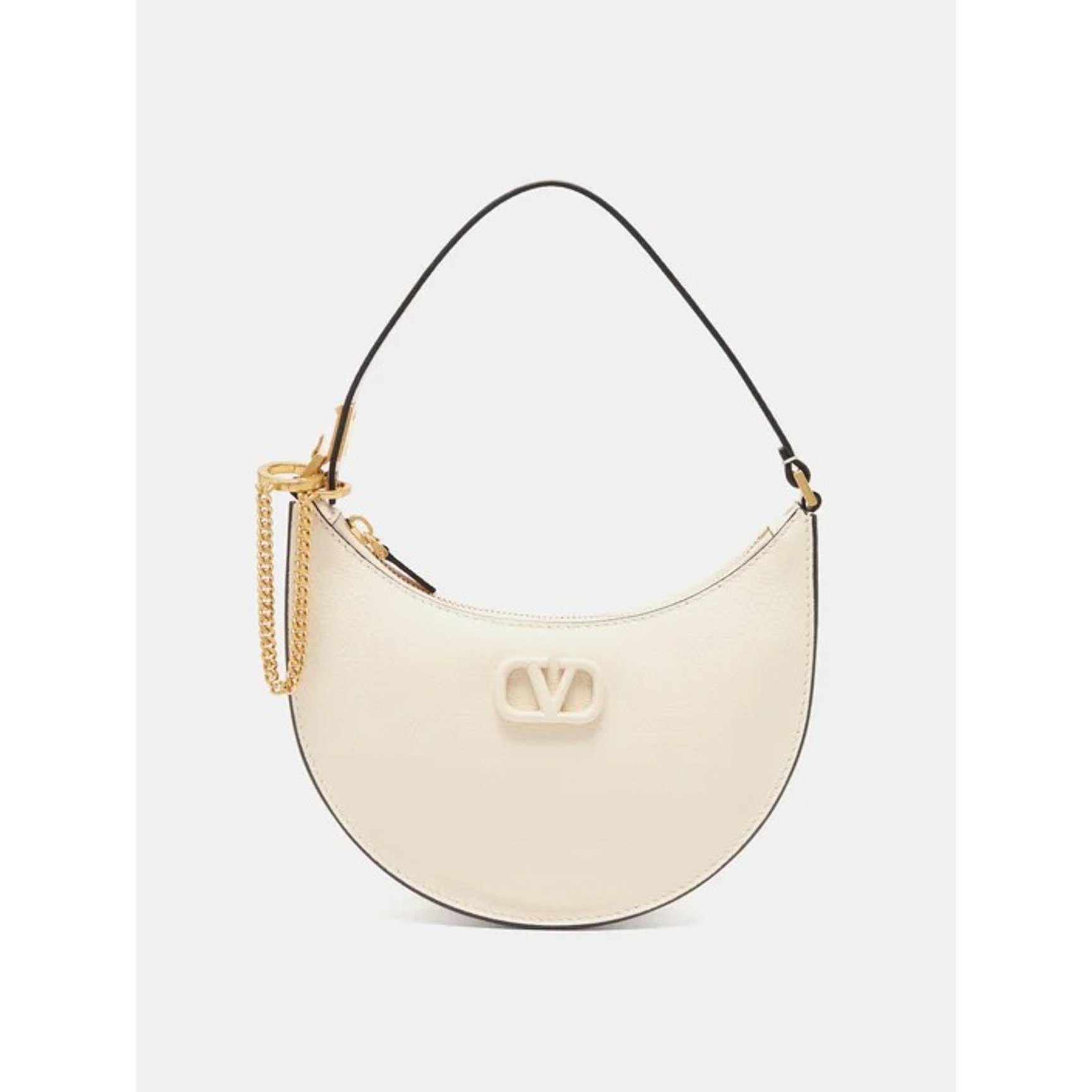 「ヴァレンティノ・ガラヴァーニ(VALENTINO GARAVANI)」のハーフムーンバッグ。ホワイトの雰囲気を壊すことなくブラックのエッジを効かせているので、程よく引き締まった印象。アイコンである「Vロゴ」も白で統一した品のあるデザインです。