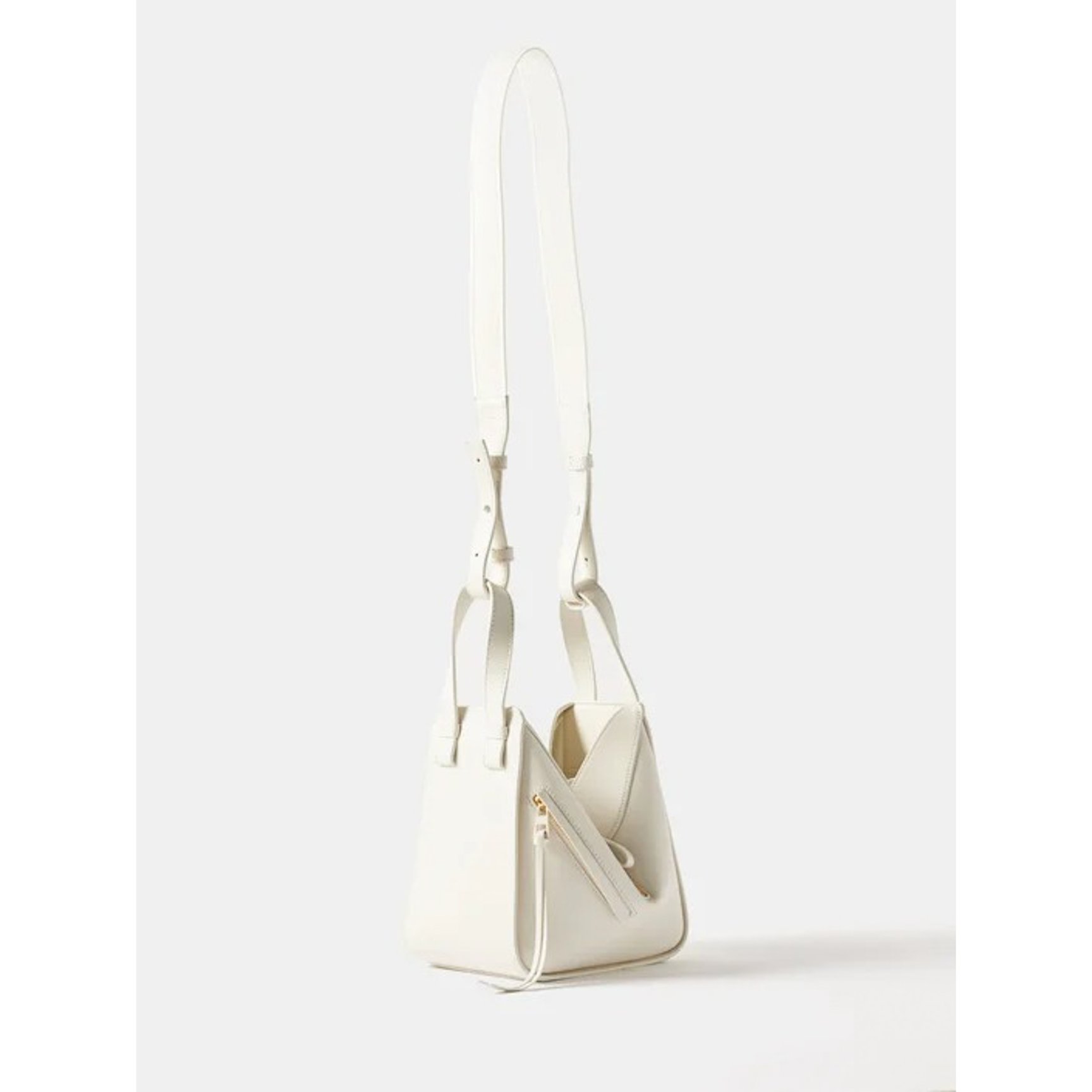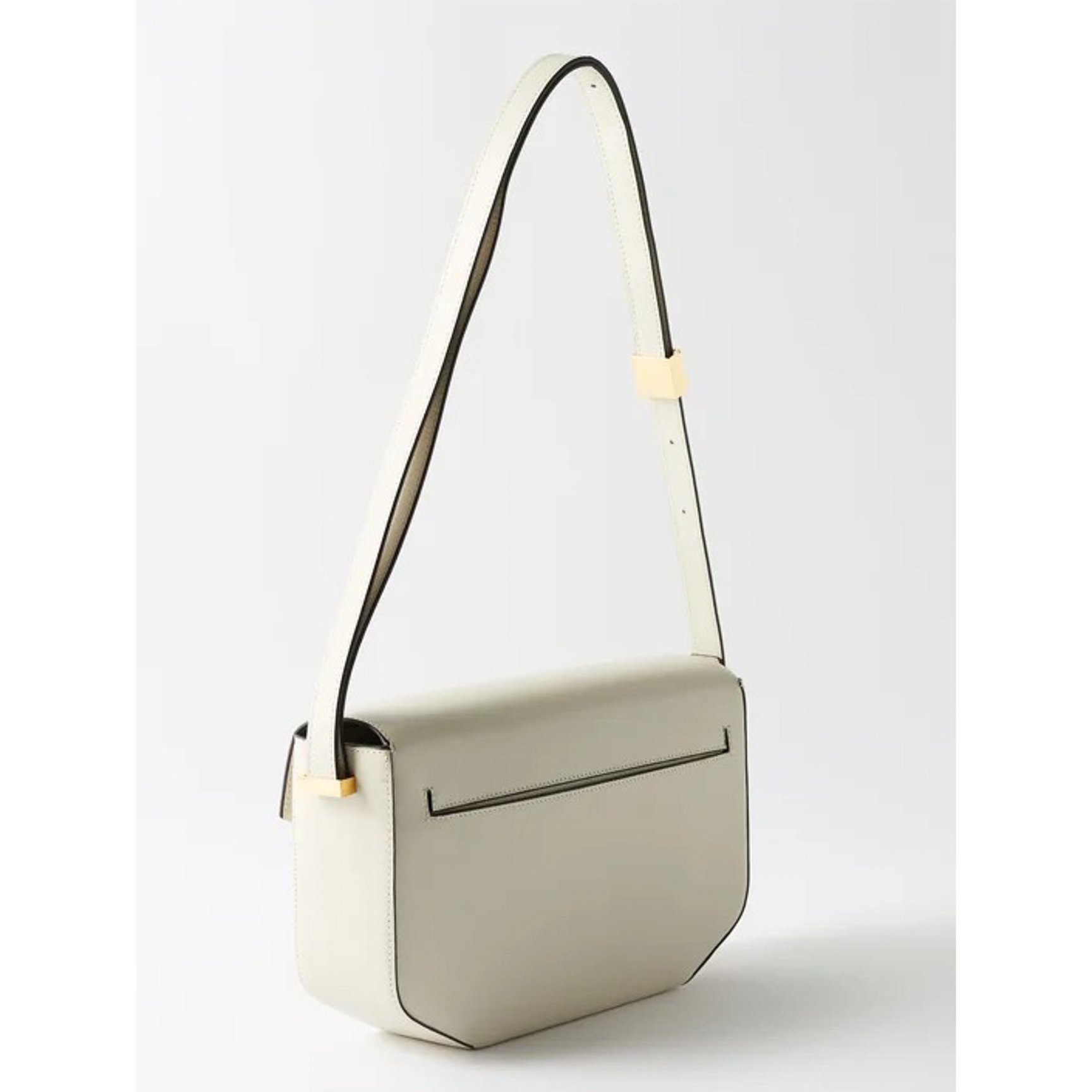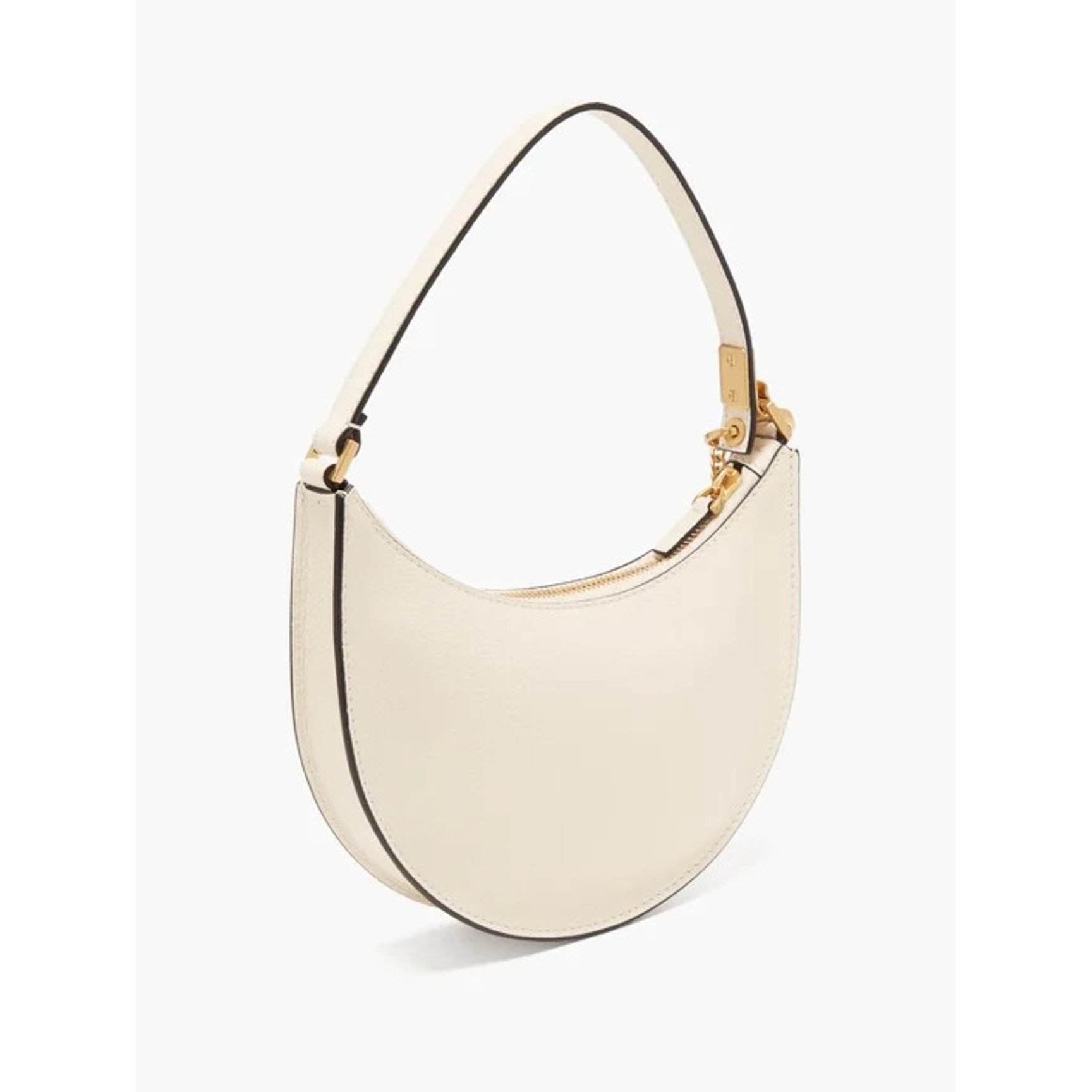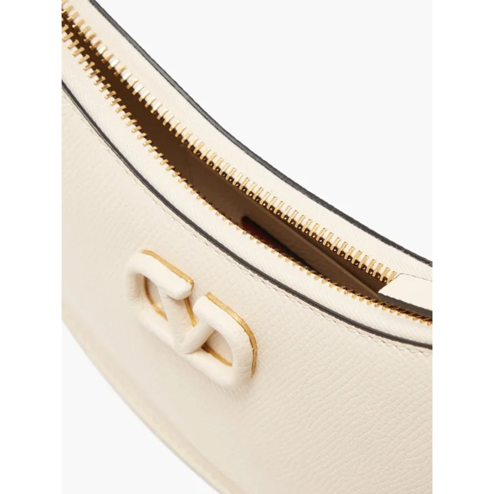 「ヴァレンティノ・ガラヴァーニ(VALENTINO GARAVANI)」のハーフムーンバッグ。ホワイトの雰囲気を壊すことなくブラックのエッジを効かせているので、程よく引き締まった印象。アイコンである「Vロゴ」も白で統一した品のあるデザインです。