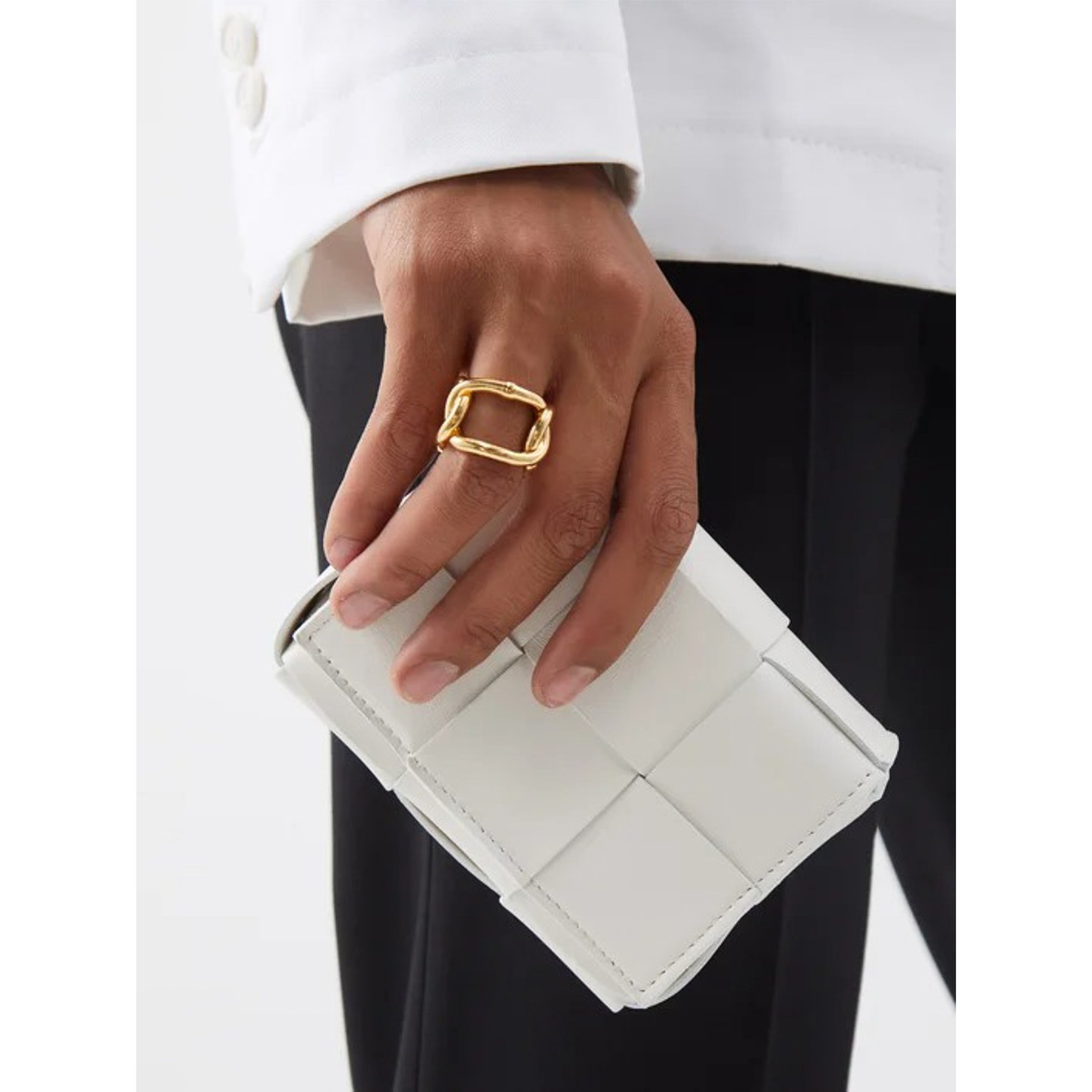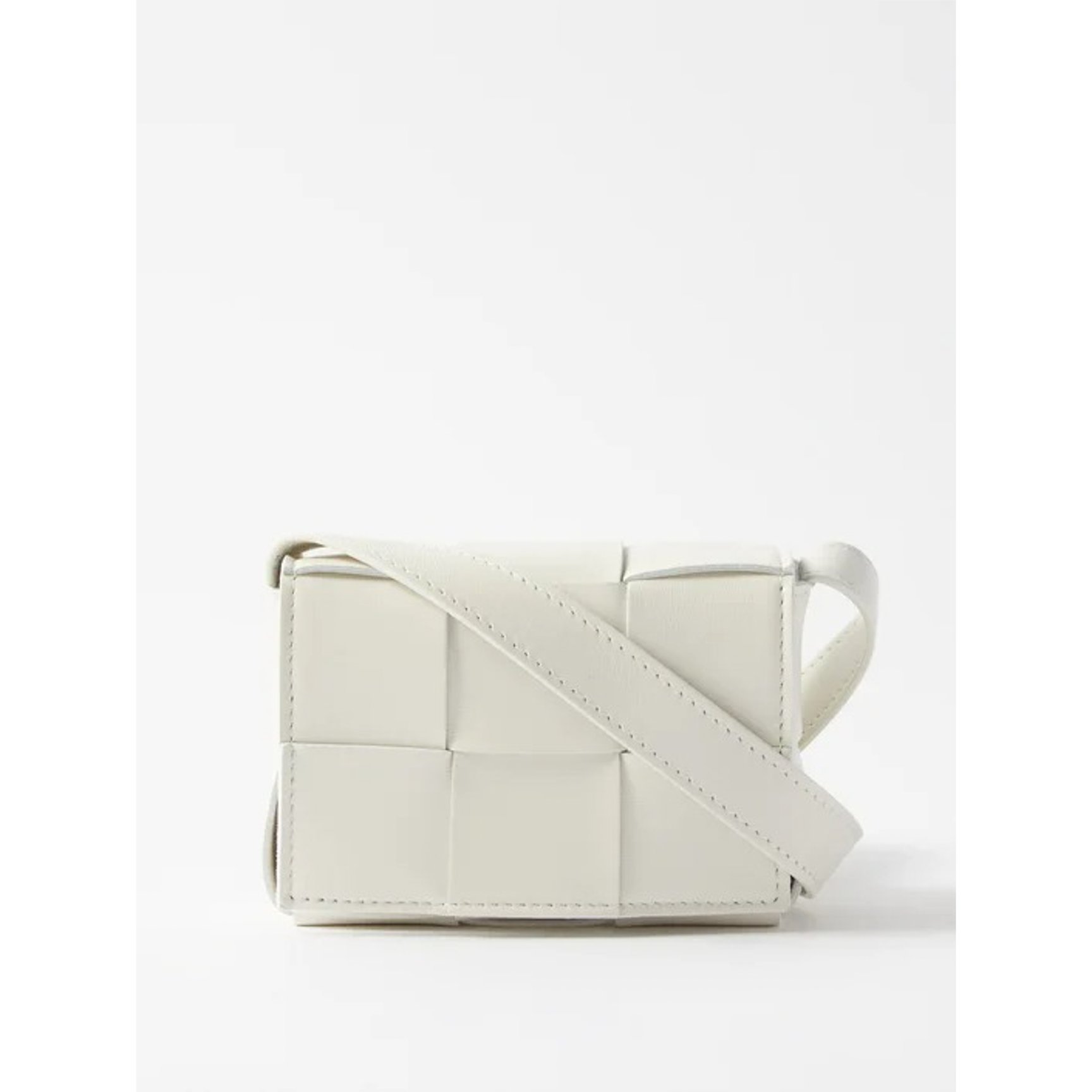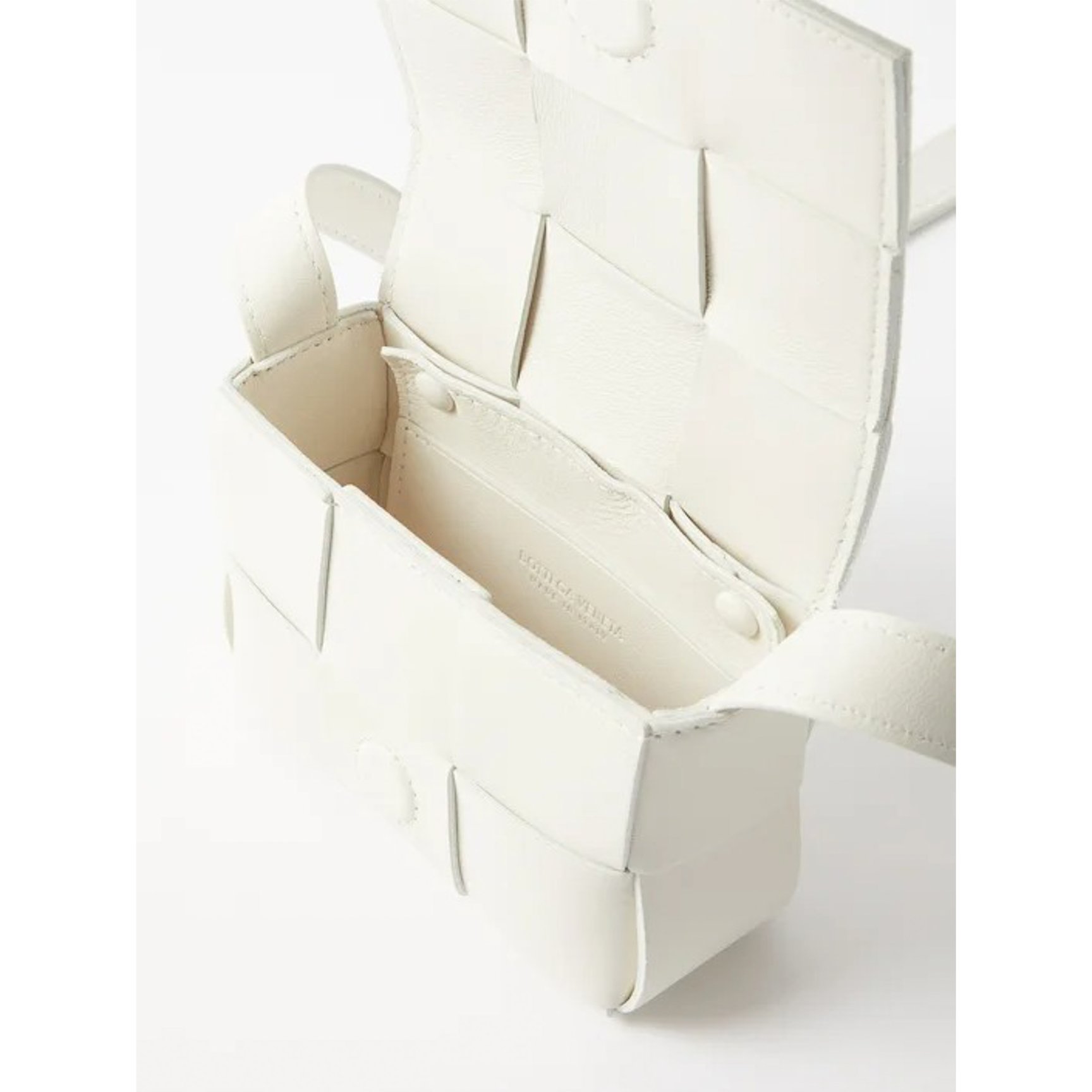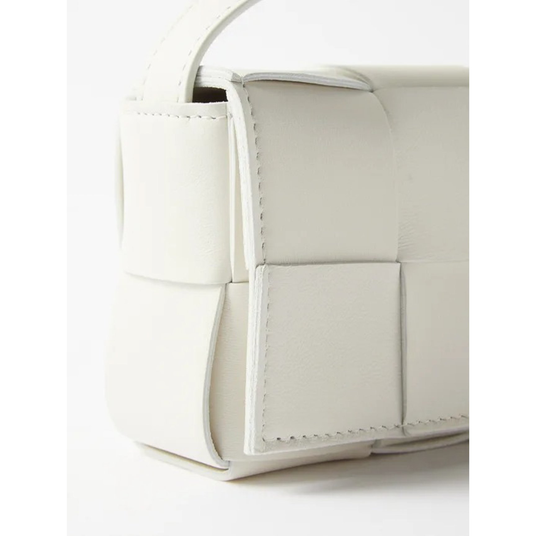 「ボッテガ・ヴェネタ(BOTTEGA VENETA)」を象徴するイントレチャートを、ラージスケールでアップデートしたカセットバッグ。オールホワイトですが、編み込みデザインがリズムのある表情を与えてくれます。