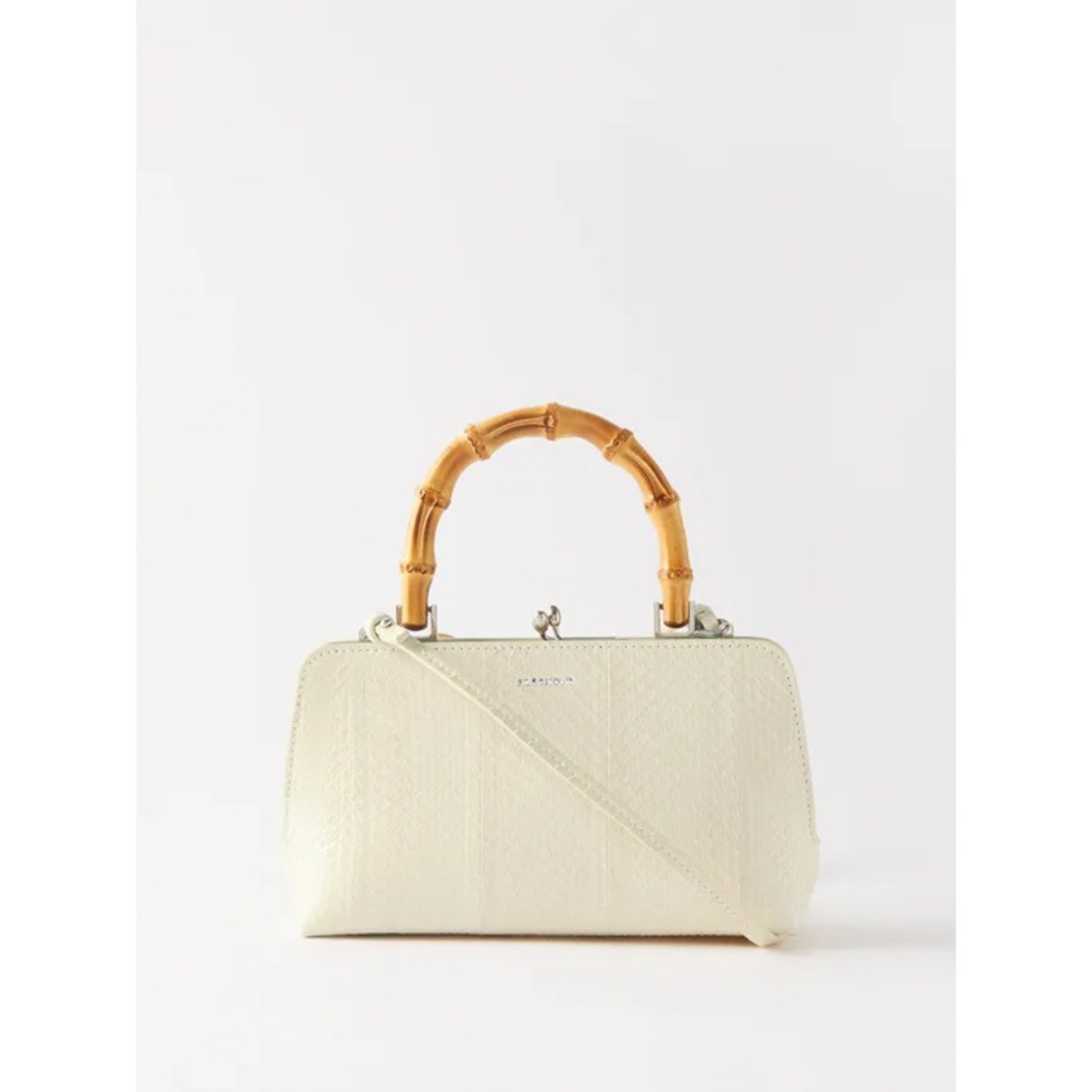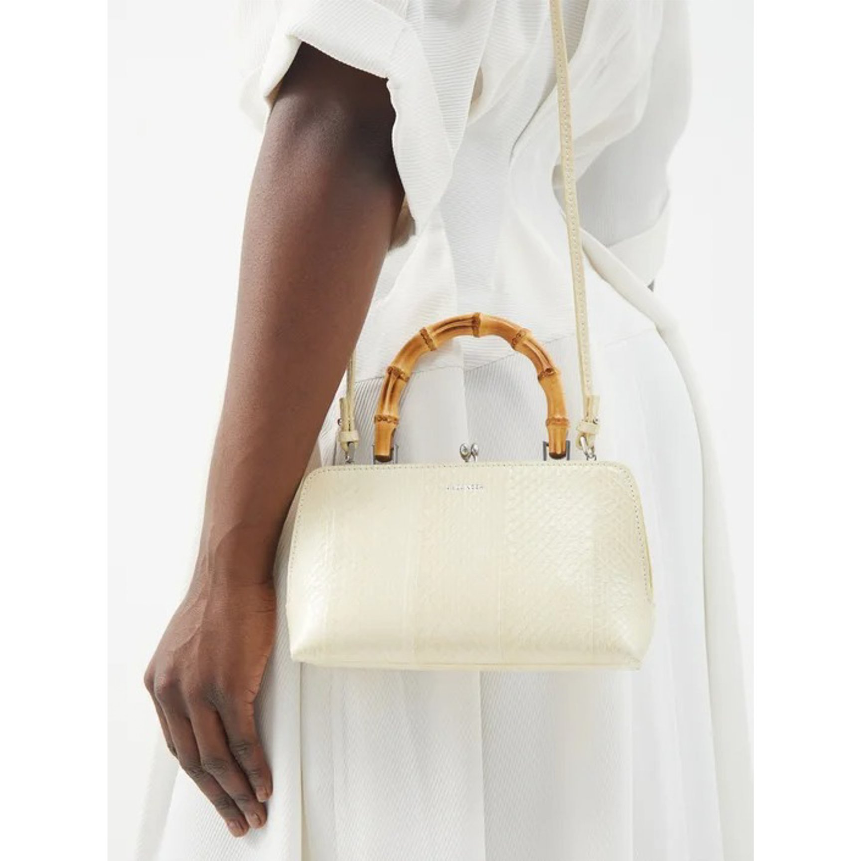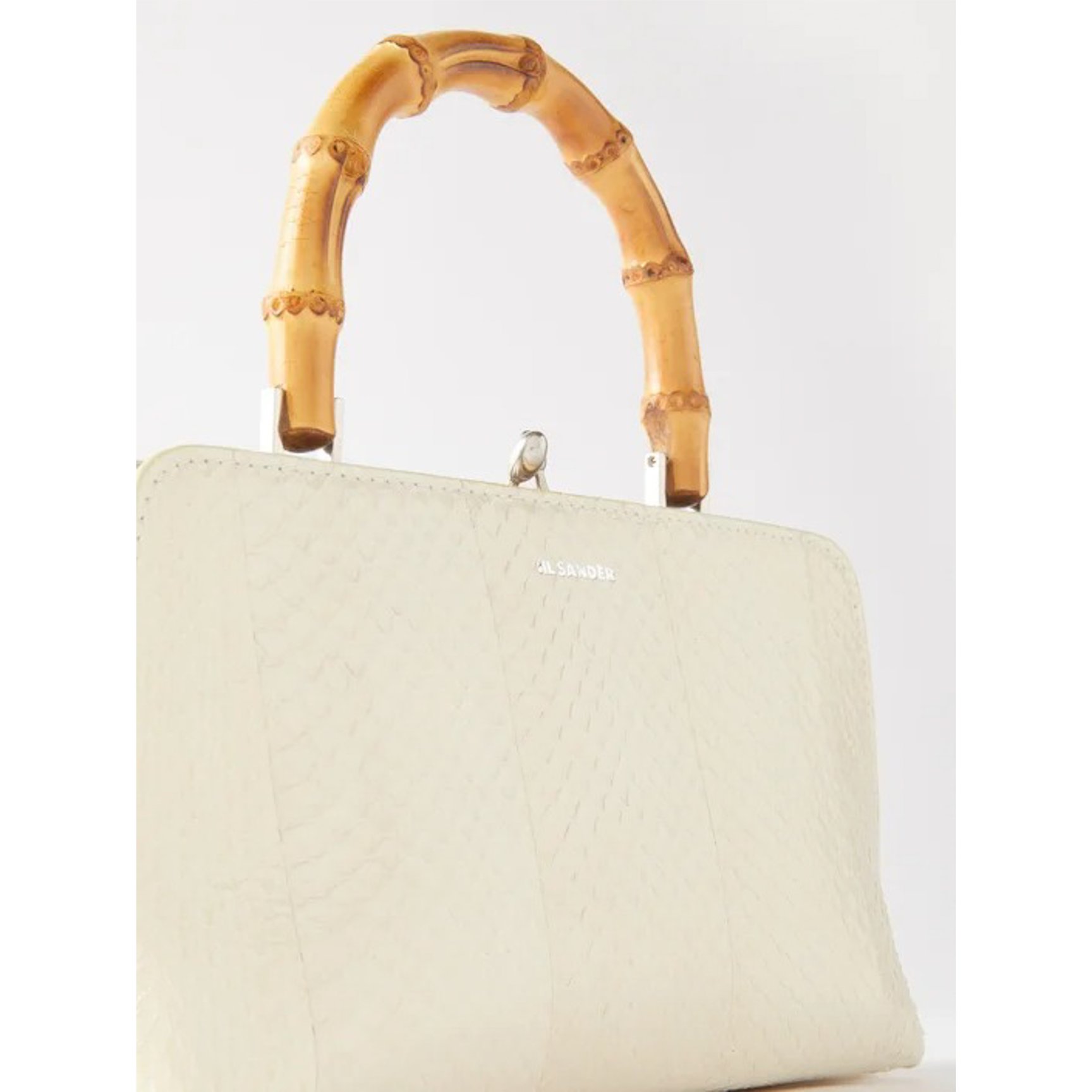 エラフェならではのウロコ模様が高級感漂う「ジル・サンダー(JIL SANDER)」のバッグ。ハンドルにはバンブーを使用し、どこか和の雰囲気も感じるデザインです。取り外し可能なストラップ付きで、ショルダーバッグとしても楽しめます。