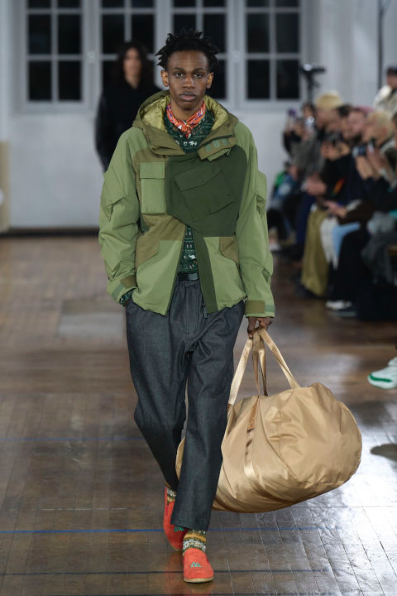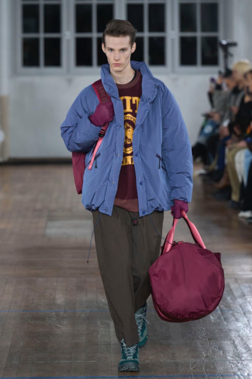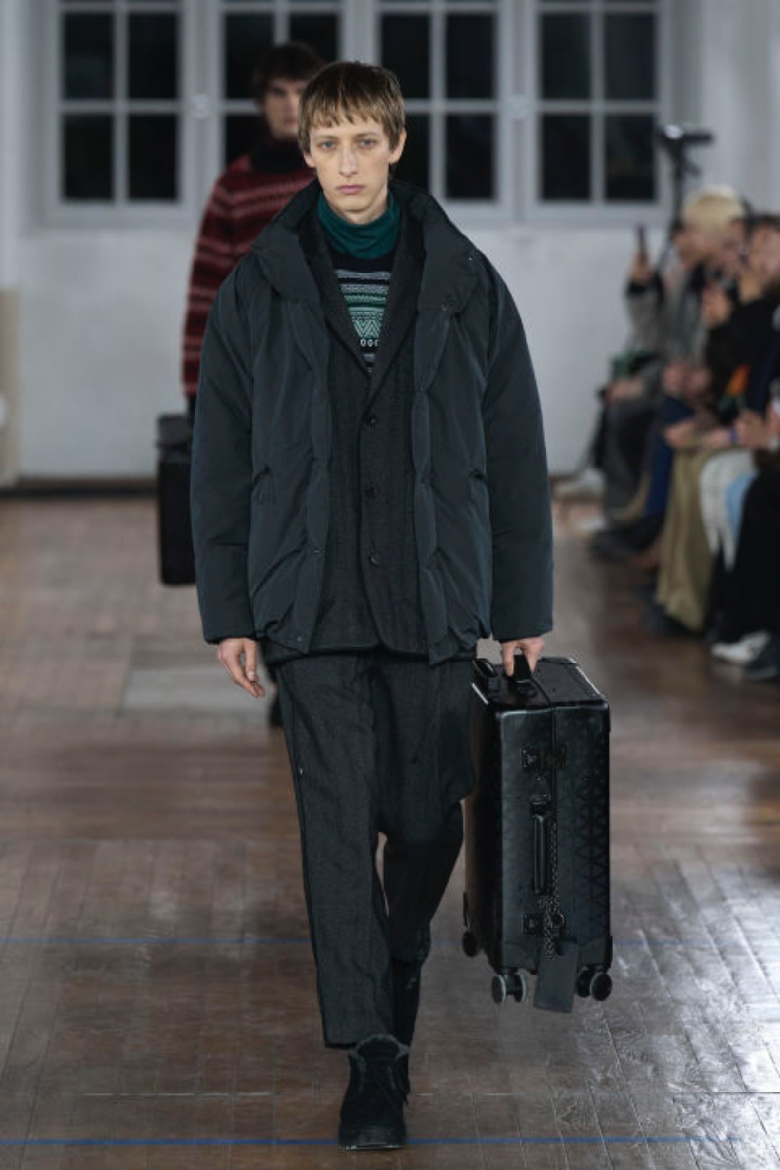 そして、多くのルックで散見されたバッグも“旅”を想起させる。ファーストルックを中心としたスーツケースは、普段から同氏が愛用している「グローブ・トロッター(GLOBE-TROTTER)」と、バックパックやボストンバッグは「アウトドアプロダクツ(OUTDOOR PRODUCTS)」とのコラボレーションによるものだ。