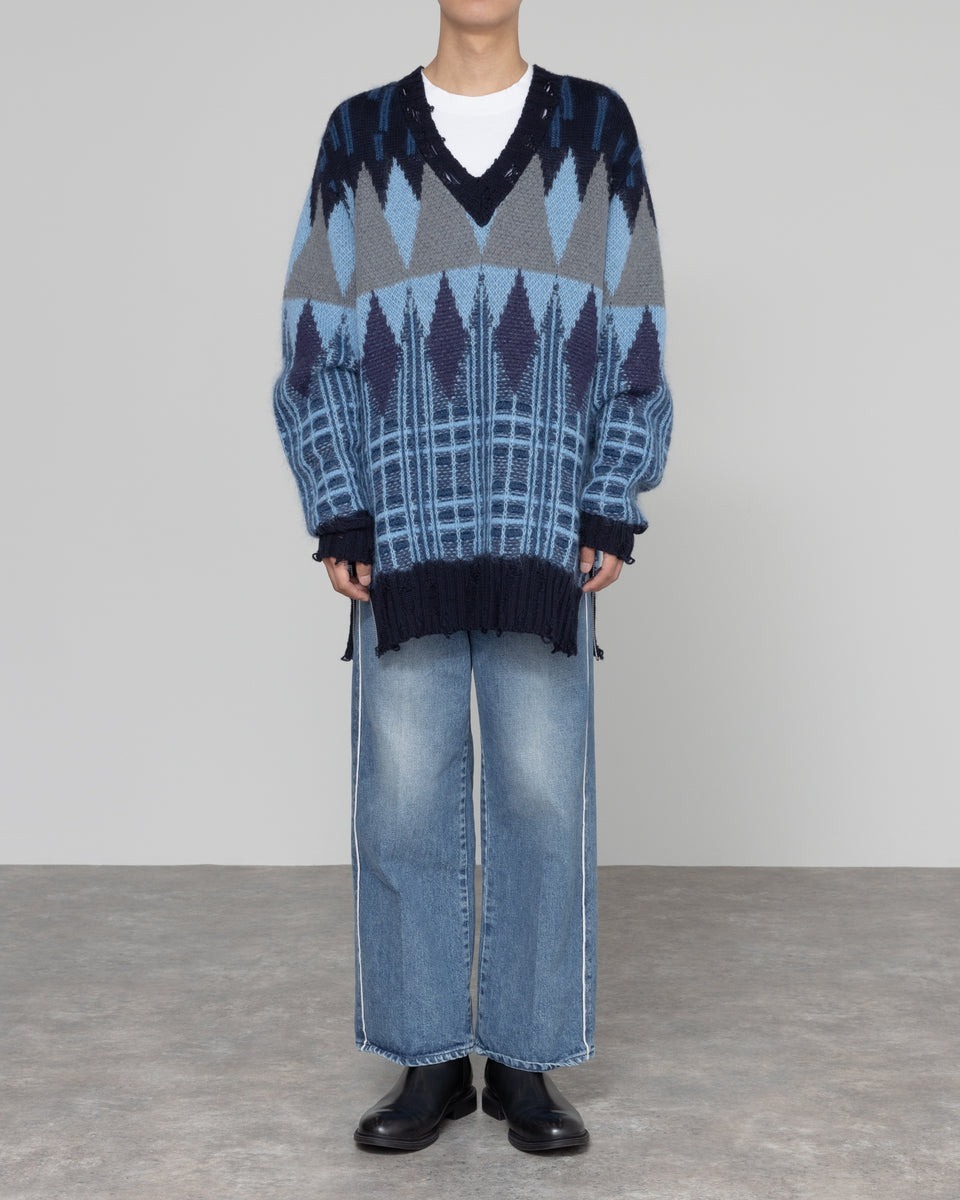 このニットも、アーガイル柄とチェック柄の組み合わせ、少し深めにとったVネック、チュニックを思わせる長めの丈感と丸みのあるシルエットなど甘めなデザインとディテールながら、襟や袖をクラッシュさせたり、ニットの素材感とは正反対のメタリックなサイドジップを加えることで全体の雰囲気を引き締めている。女性が今日はスカートを合わせようか、それともビンテージのデニムを合わせようか、はたまた綺麗めなウールパンツを合わせようかと、毎日でもこのニットを着たくなるそんなアイテムではないだろうか。