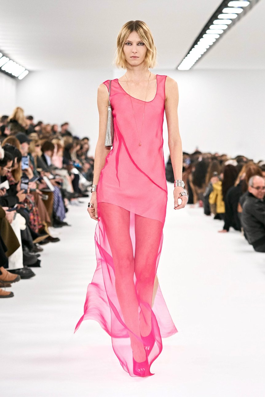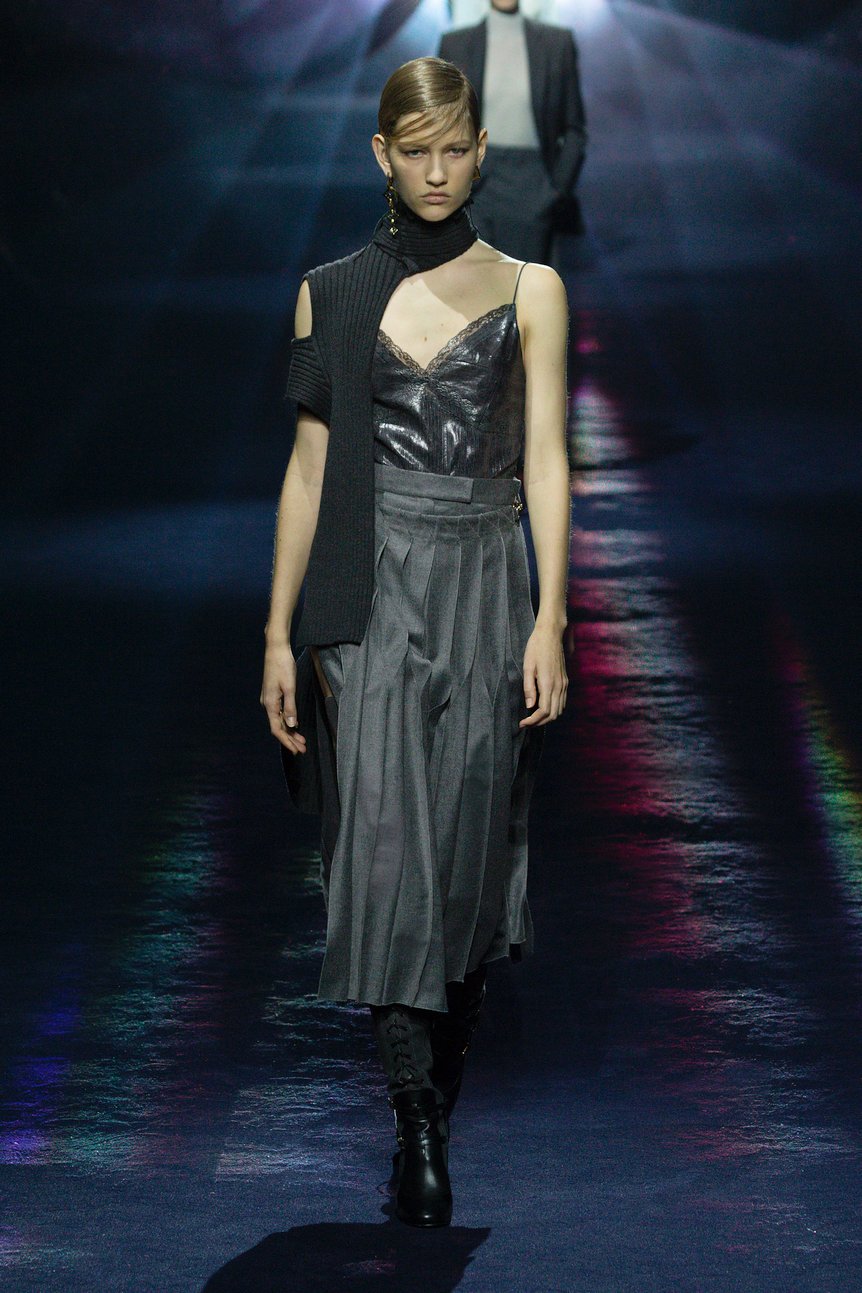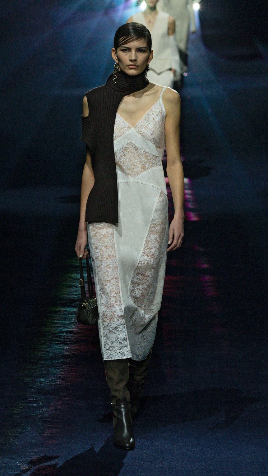 スリップドレスやキャミソール、ブラやビスチェなどのランジェリーのディテールを隠さず、あえて表に出すことによってボディの美しさと女性らしさを賞賛。素材はシフォンやレースではなく、ウールやレザーを使用することでアウターウェアとしても対応する。